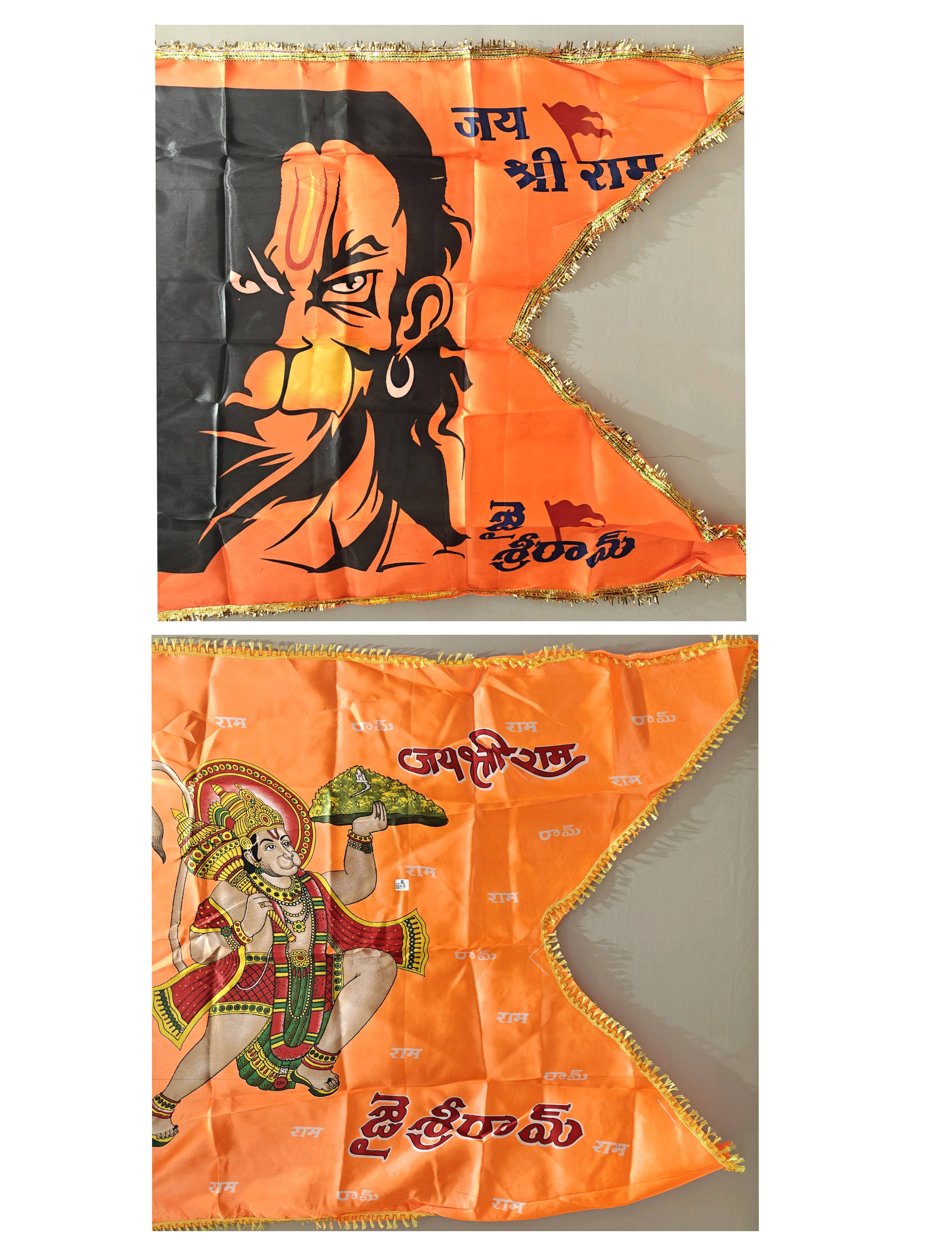A bold orange jhanda dedicated to Hanuman Ji, symbol of strength and bhakti.