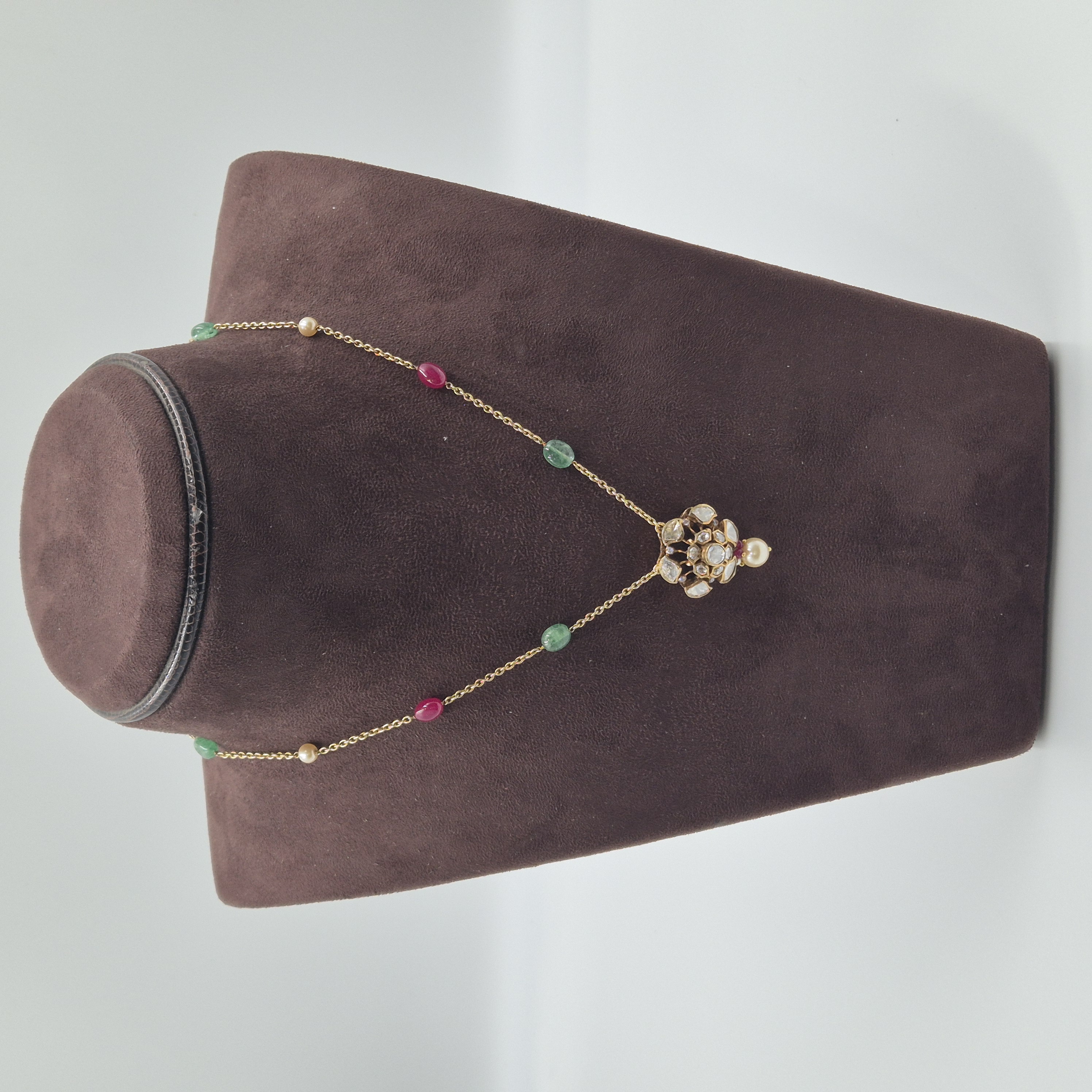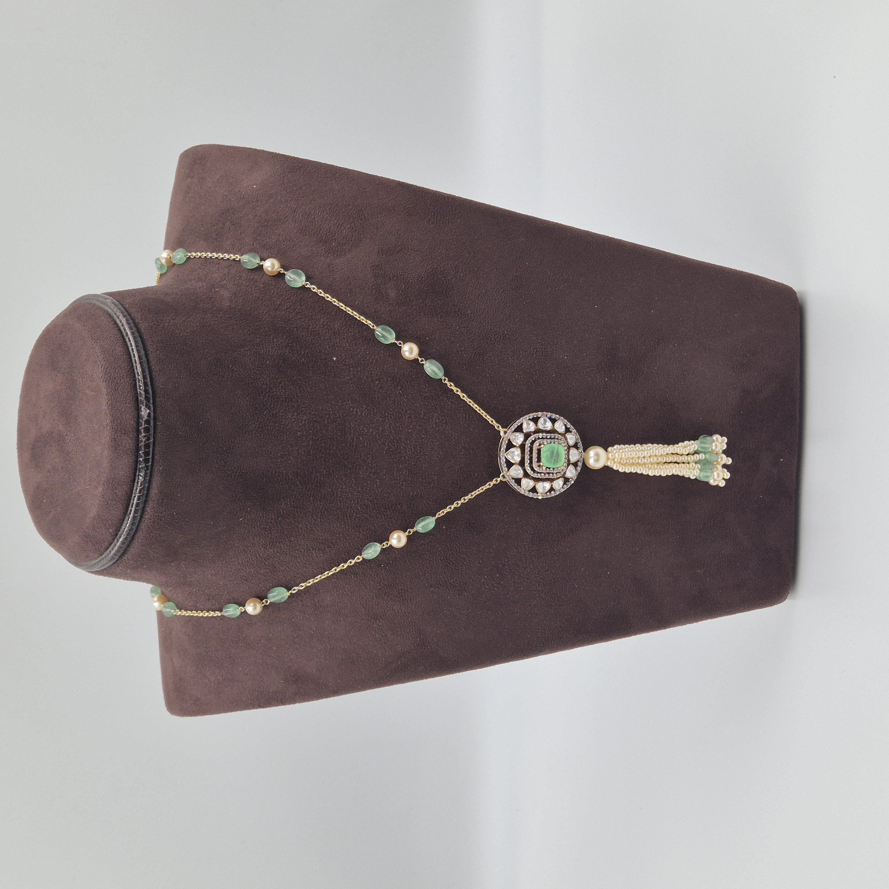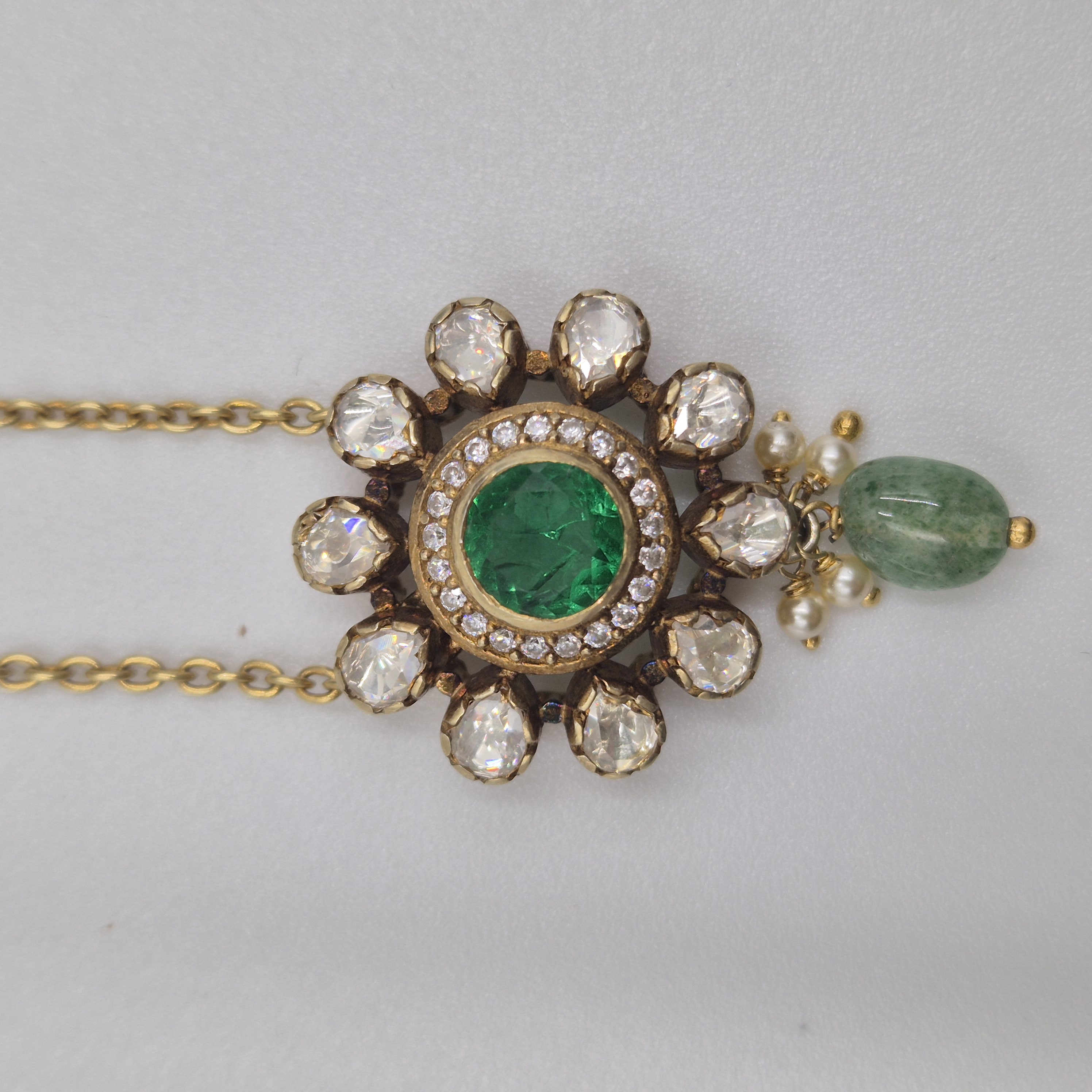A statement necklace highlighted by a striking green stone, sparkling accents, and elegant pearl tassels. Crafted in silver with a 92.5 purity rate, it brings grandeur to weddings and festive occasions. CARE TIP: Store in a dry, airtight pouch and avoid contact with water, perfumes, and chemicals to maintain its shine.