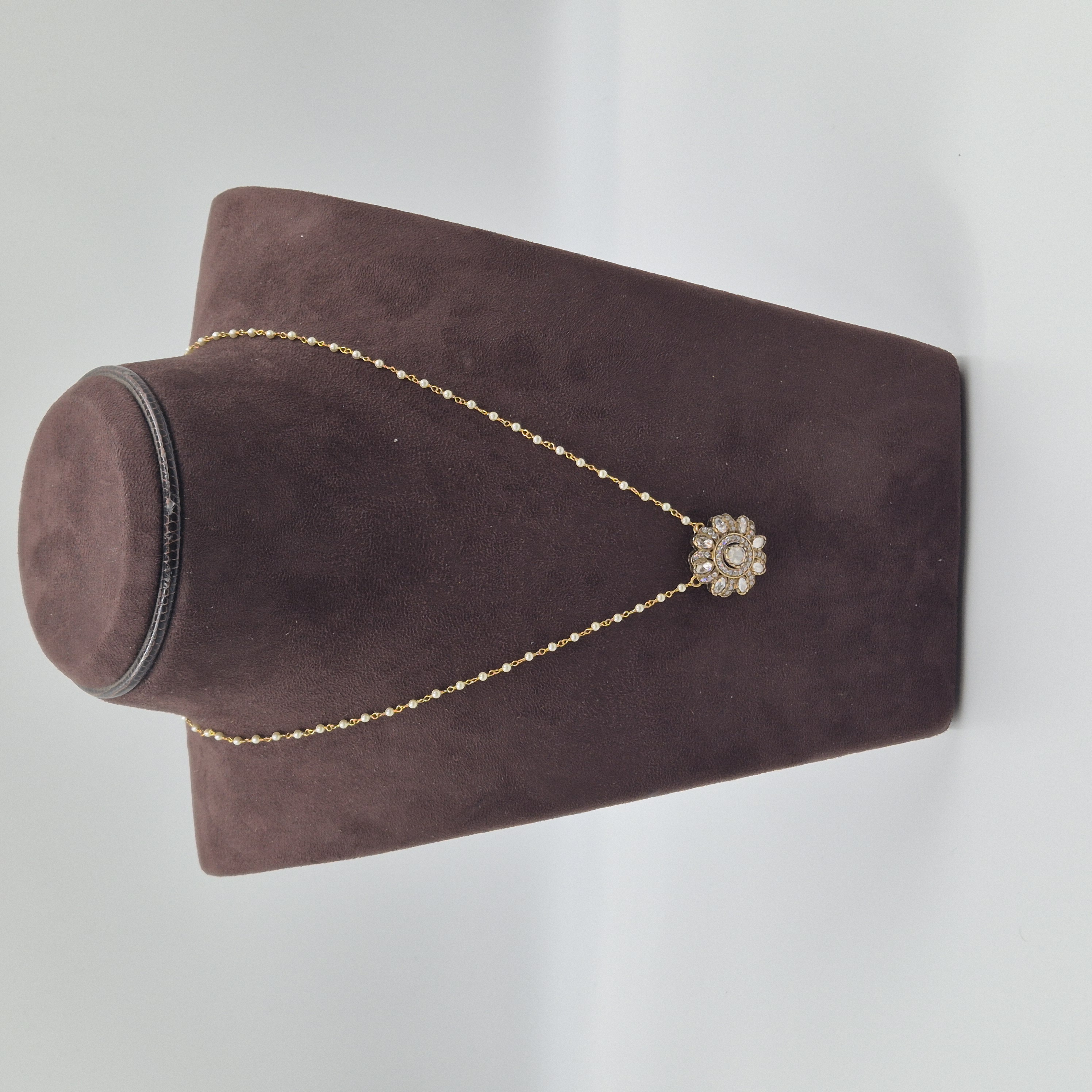 This artistic necklace features a floral pendant enhanced with vibrant stones and a graceful pearl drop. Made in silver with a 92.5 purity rate, it beautifully elevates ethnic and fusion outfits. CARE TIP: Store in a dry, airtight pouch and avoid contact with water, perfumes, and chemicals to maintain its shine.