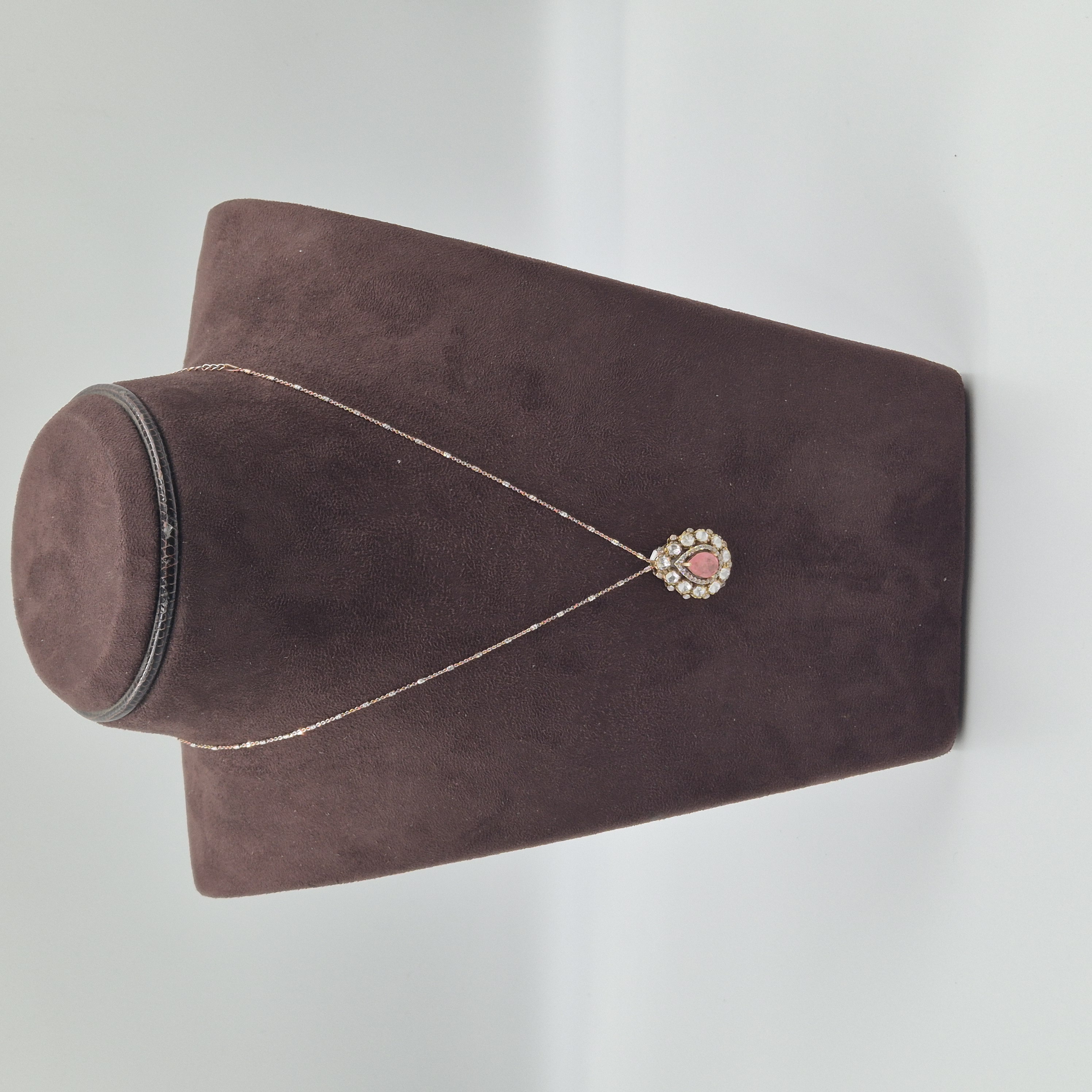 A charming necklace featuring a soft pink tear-drop stone framed with brilliant detailing. Crafted in silver with a 92.5 purity rate, it reflects subtle elegance for any occasion. CARE TIP: Store in a dry, airtight pouch and avoid contact with water, perfumes, and chemicals to maintain its shine.