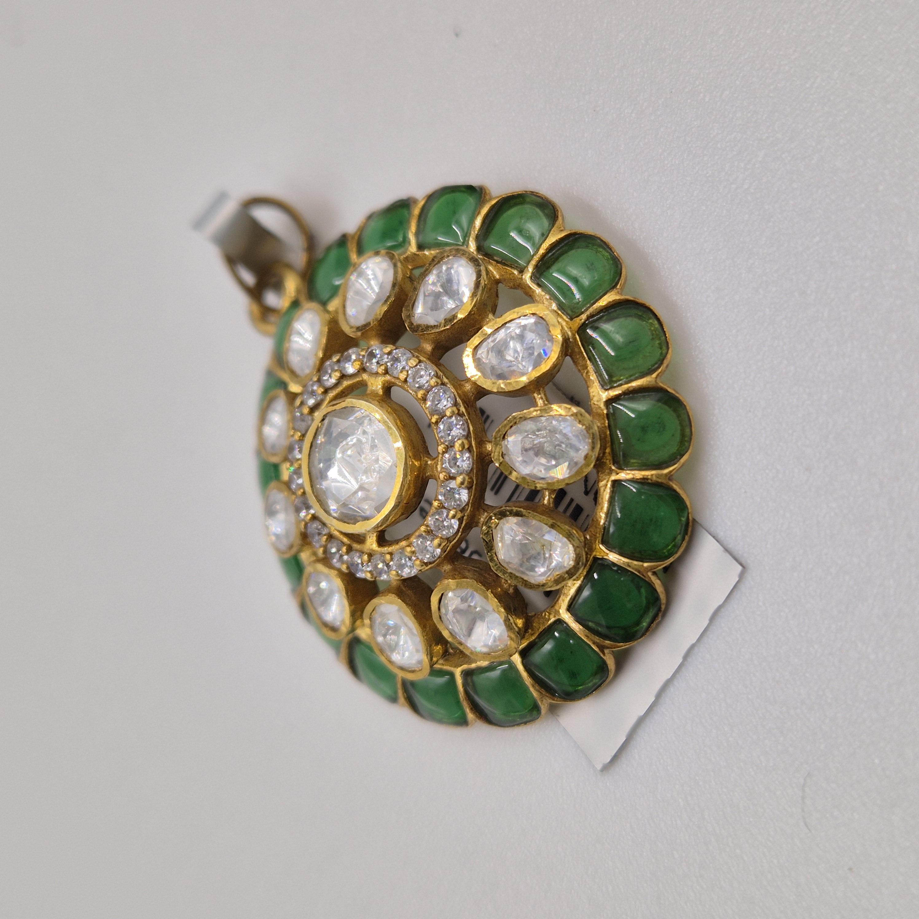 Designed in 92.5 purity silver, this round pendant showcases a radiant center framed with rich green accents and sparkling stones. A graceful silver piece ideal for ethnic occasions. CARE TIP: Keep away from water, perfume and chemicals. Store in an airtight box and wipe gently with a soft cloth after use.