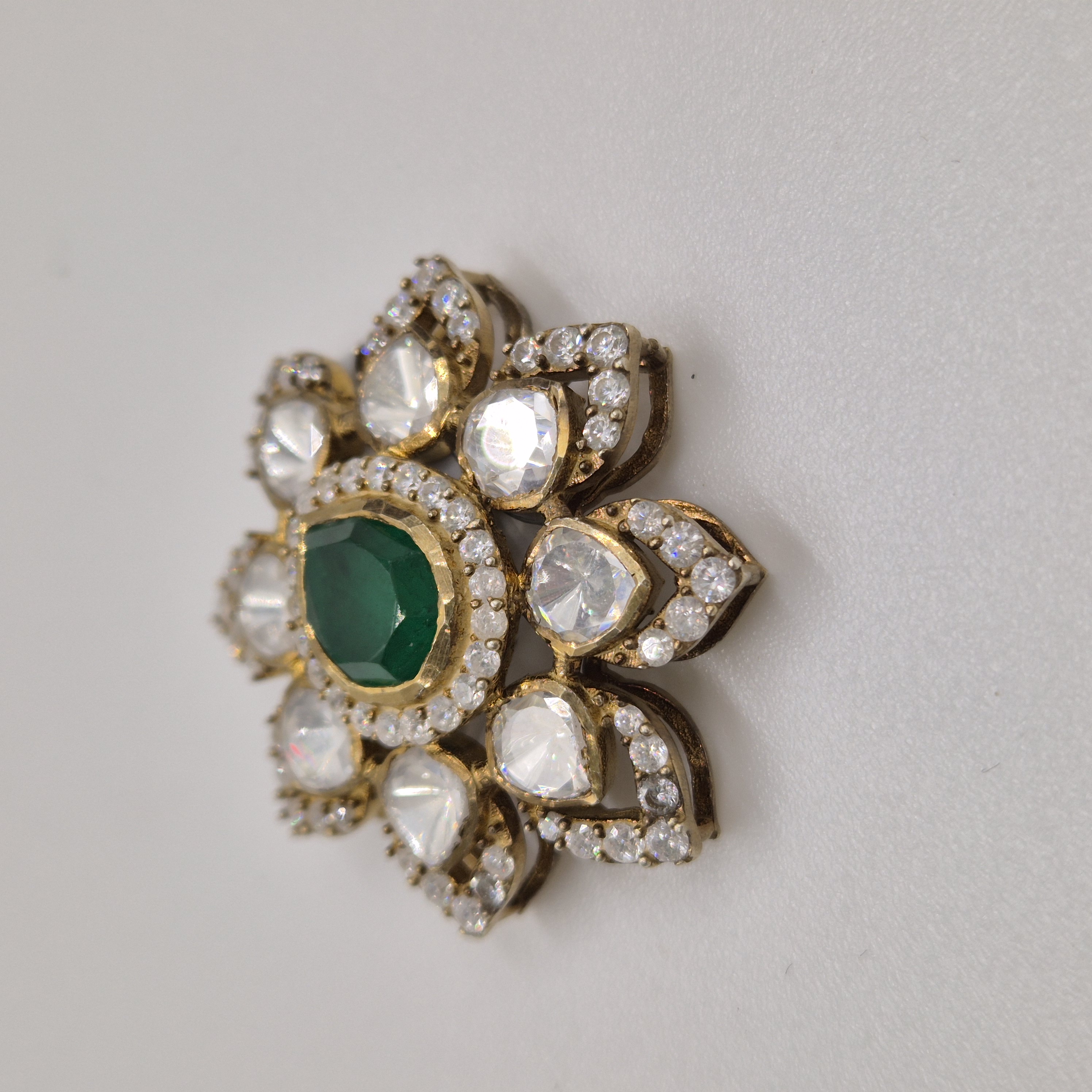 Crafted in 92.5 purity silver, this floral pendant features a vibrant green centerpiece with shimmering stones. A refined silver statement for traditional looks. CARE TIP: Keep away from water, perfume and chemicals. Store in an airtight box and wipe gently with a soft cloth after use.