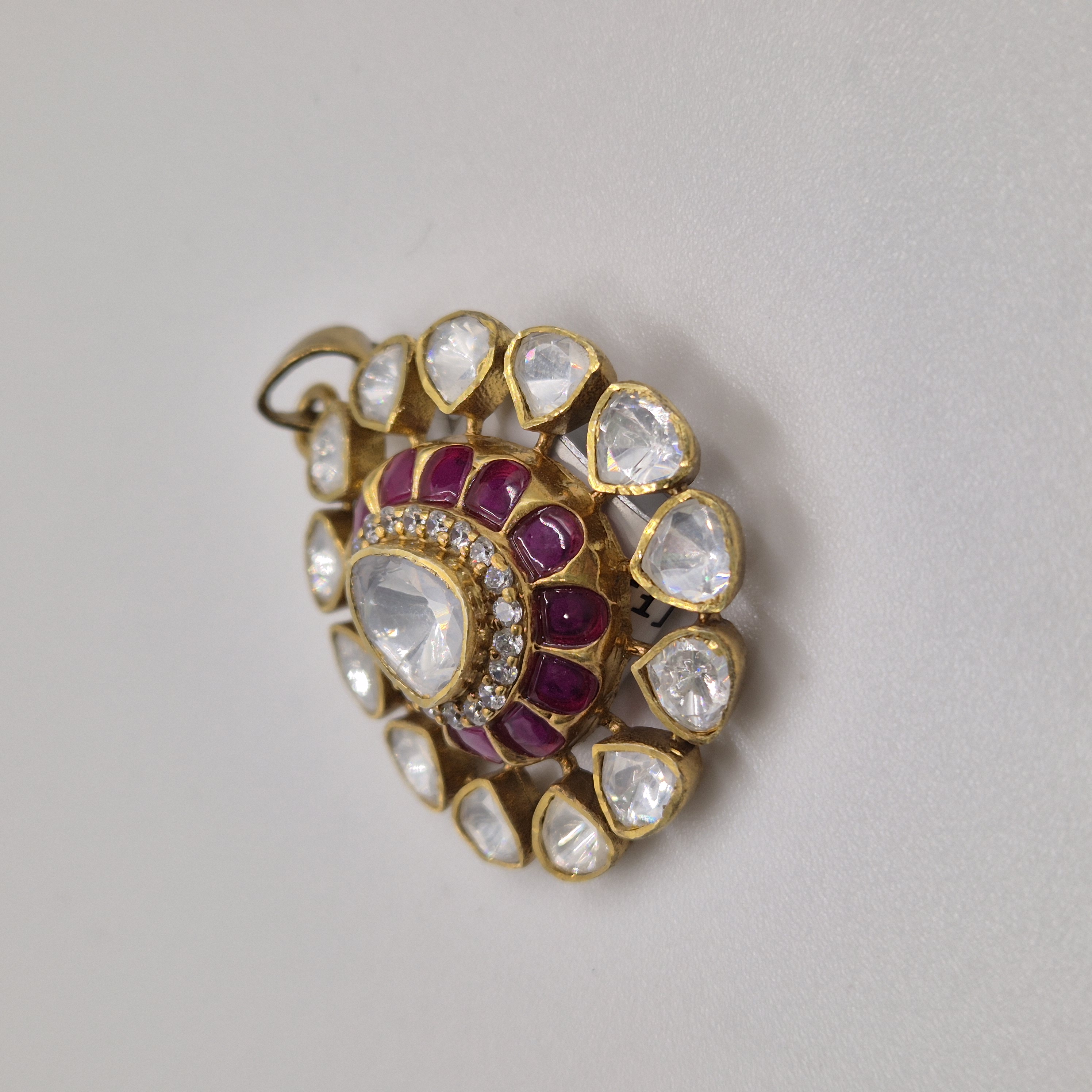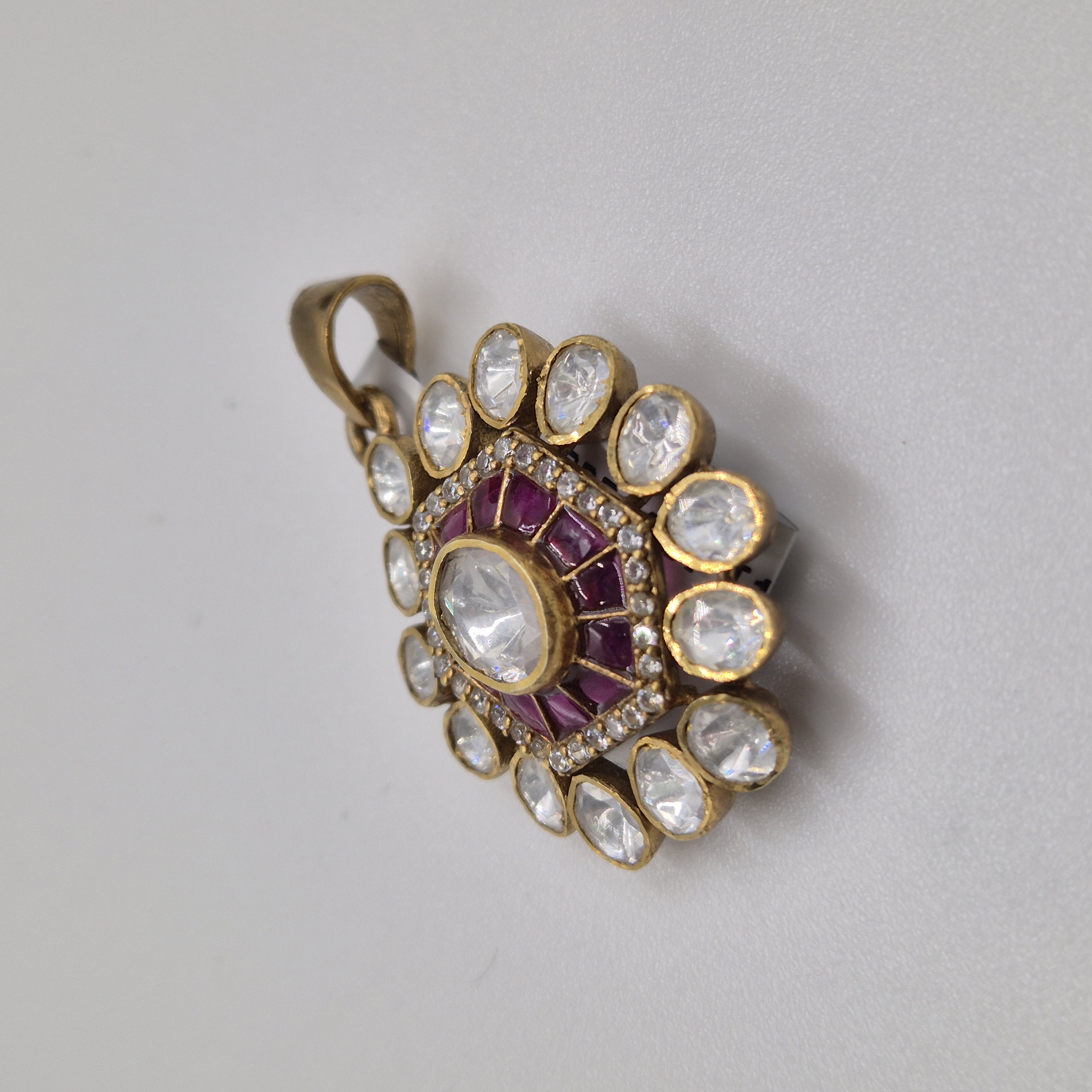 Designed with ruby-toned stones in a floral pattern, this pendant is crafted from silver with a 92.5 purity rate, blending traditional charm with modern elegance. CARE TIP: Store in a dry, airtight pouch and avoid contact with water, perfumes, and chemicals to maintain its shine.