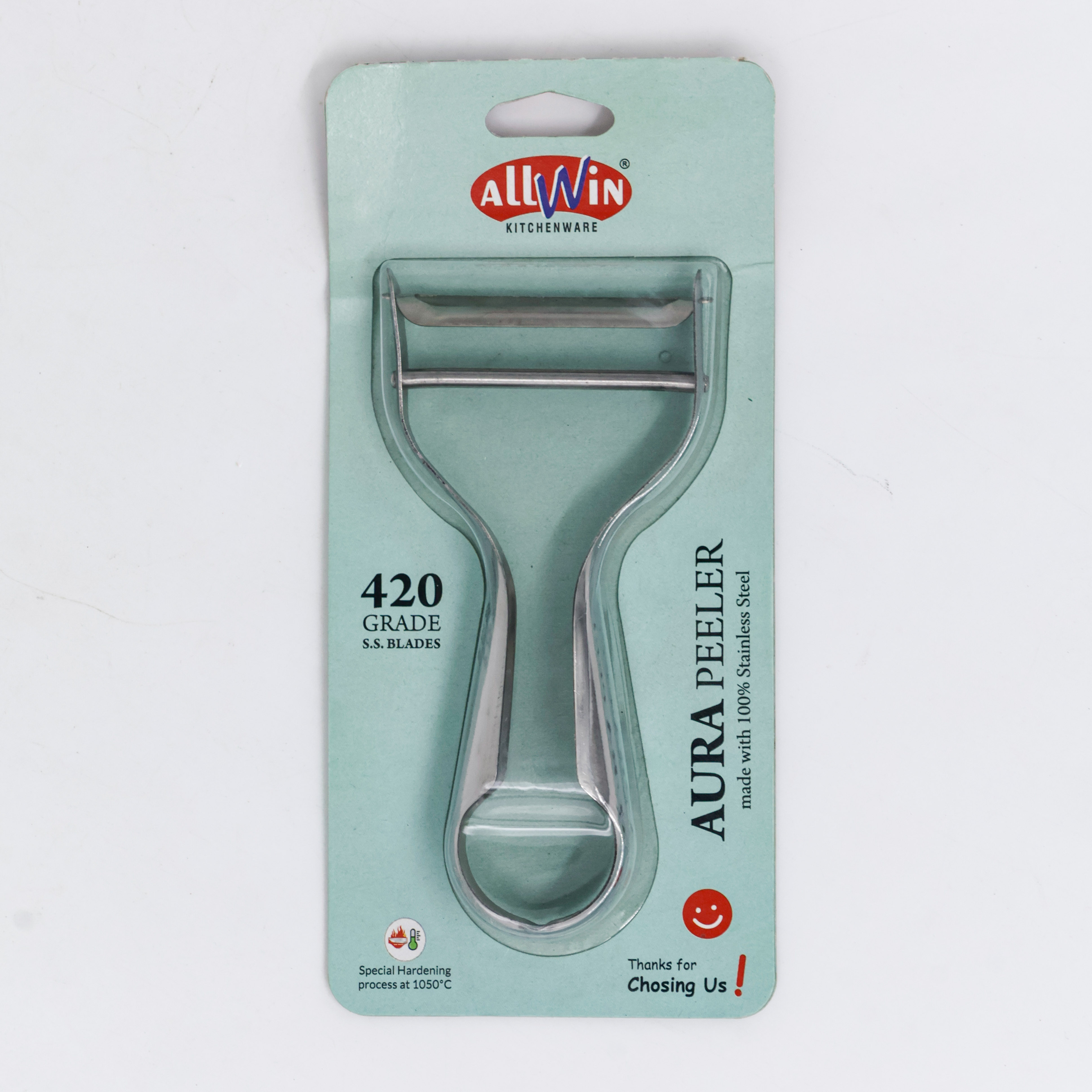 Compact Aura peeler with ergonomic grip for peeling vegetables.