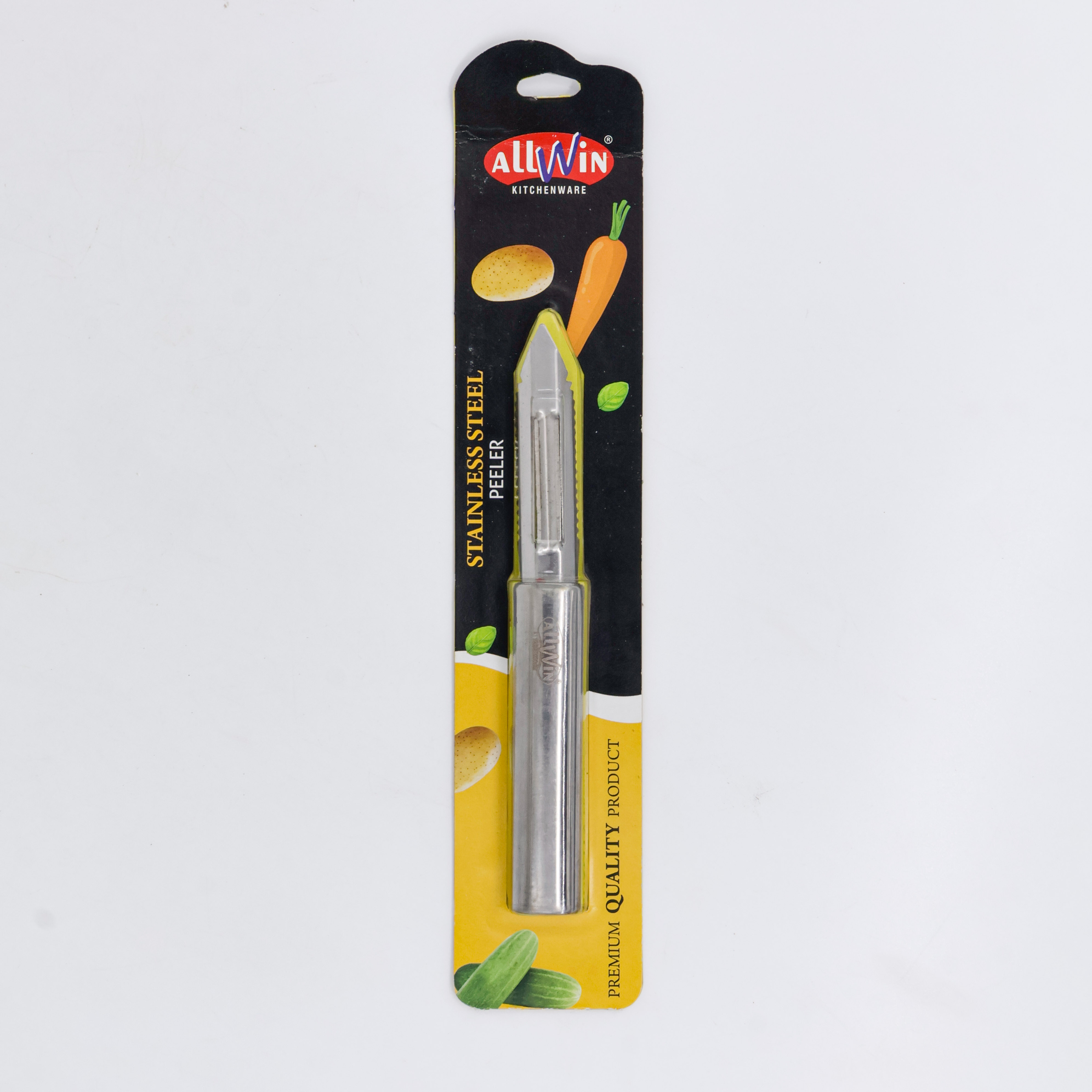 Stainless steel peeler with ergonomic handle for easy peeling.