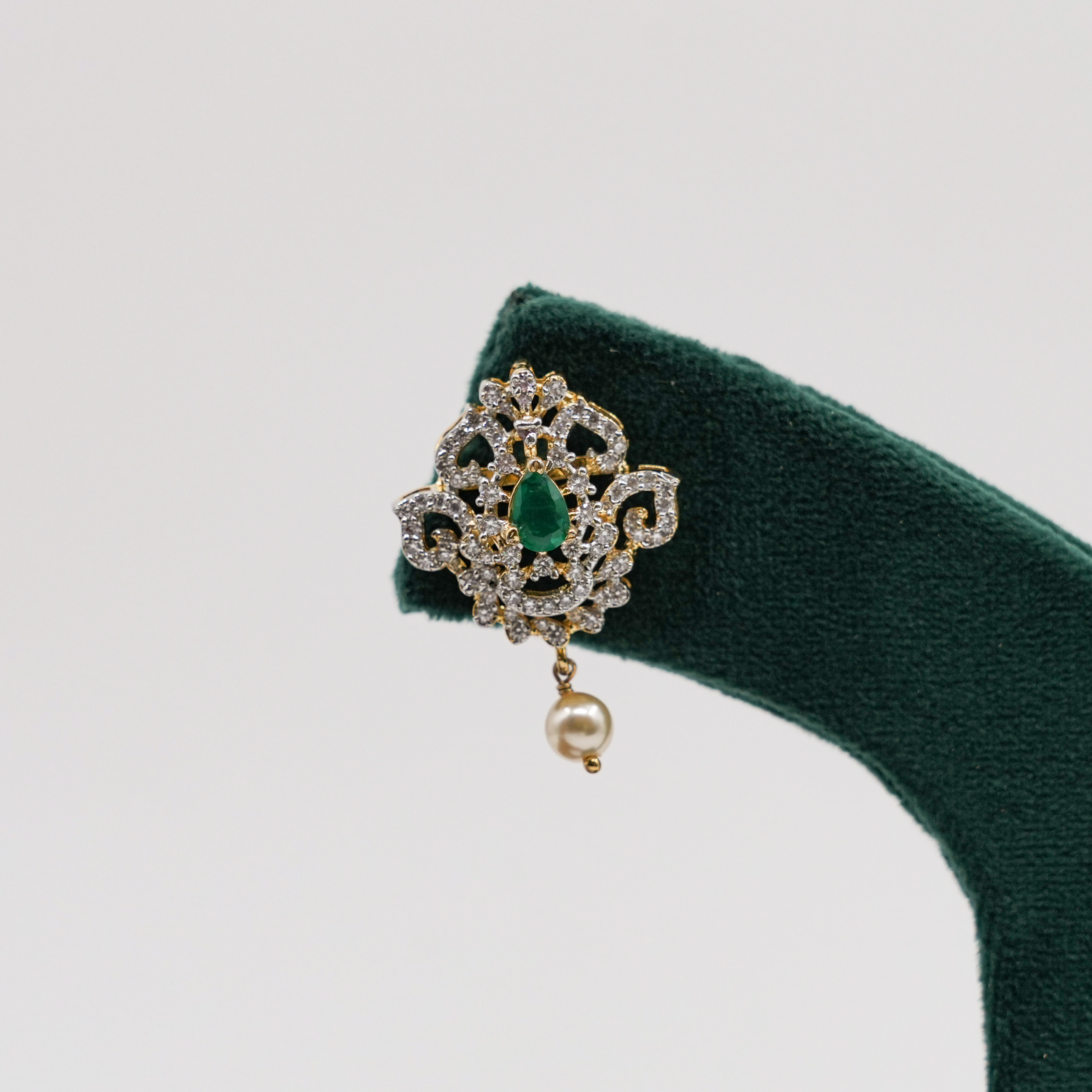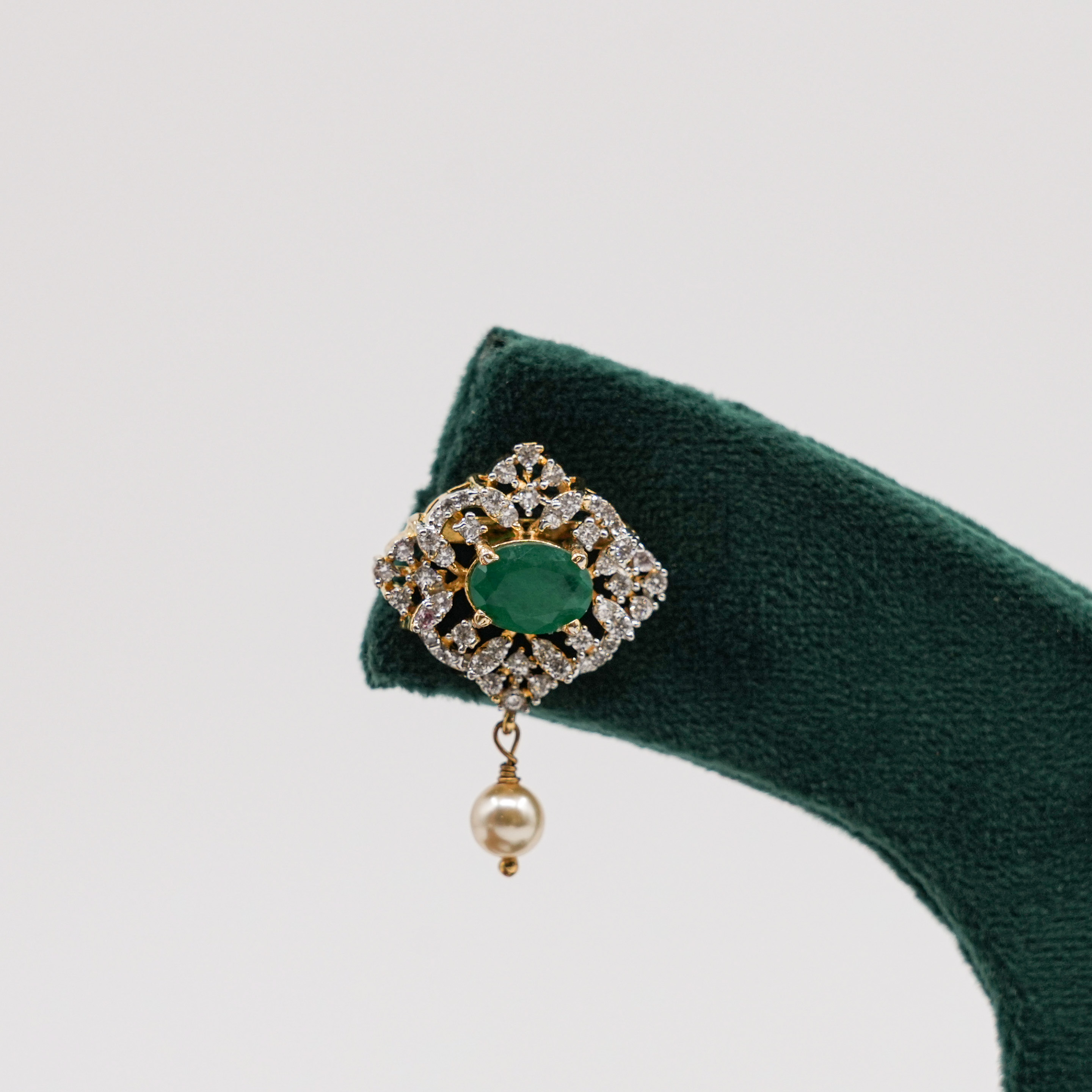 Studded earrings with pearl drops, suitable for everyday wear and special occasions. Buy emerald pearl earrings from Raag Silver Jewellery in Hyderabad.