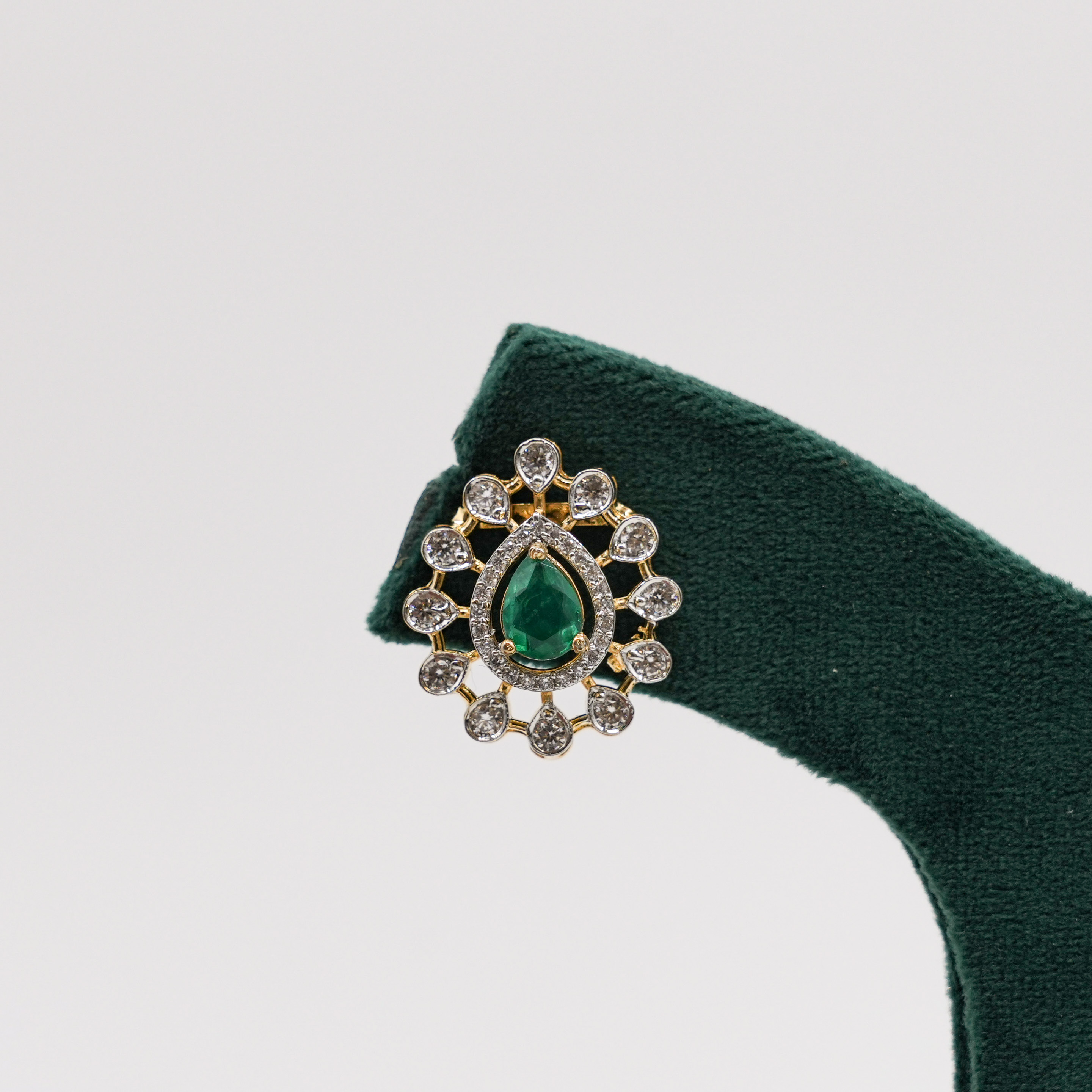 Elegant emerald stud earrings with intricate diamond detailing, perfect for special occasions. Buy emerald stud earrings from Raag Silver Jewellery in Hyderabad.