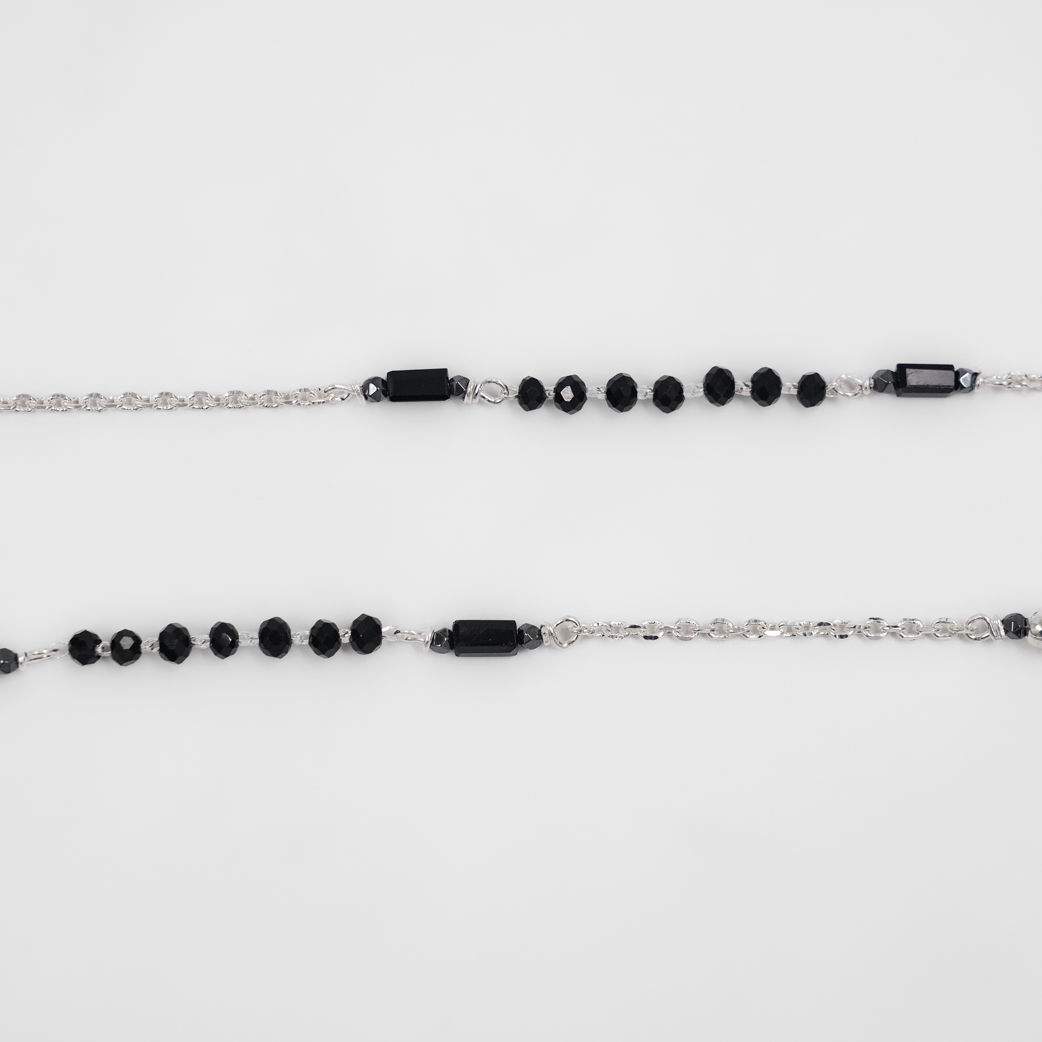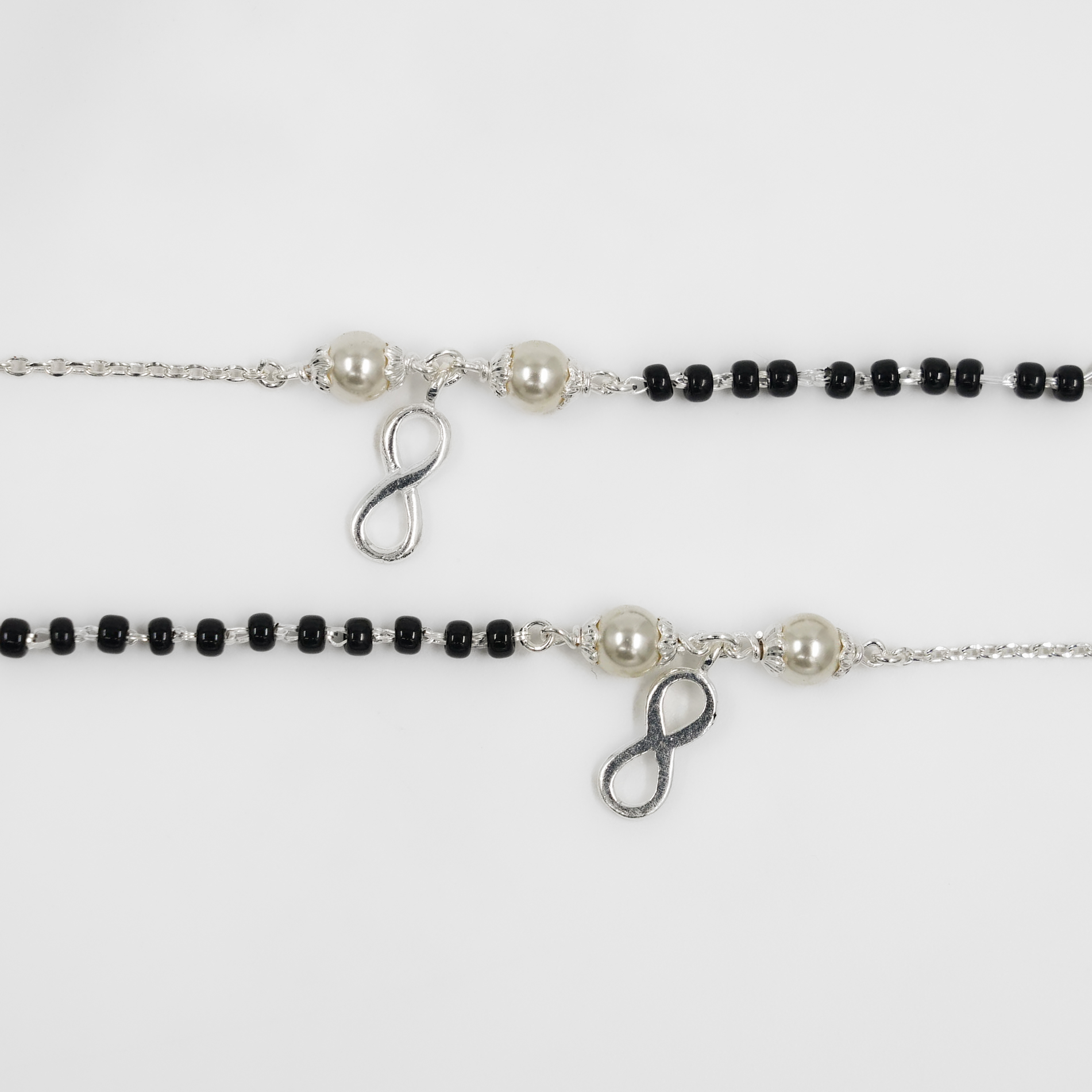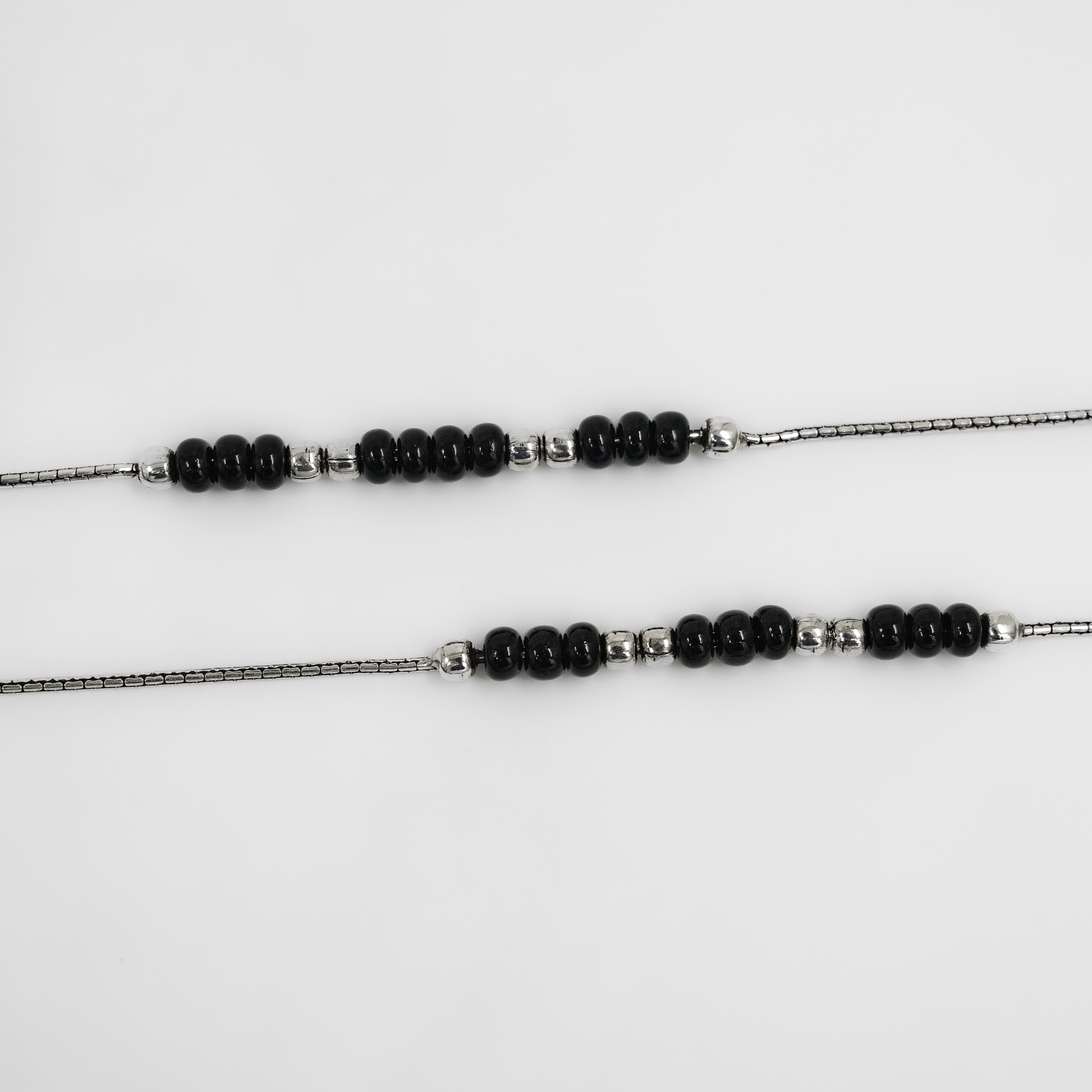 Delicate silver beaded anklet with black beads, perfect for everyday wear or special occasions. Buy Silver Beaded Anklet from Raag Silver Jewellery in Hyderabad.