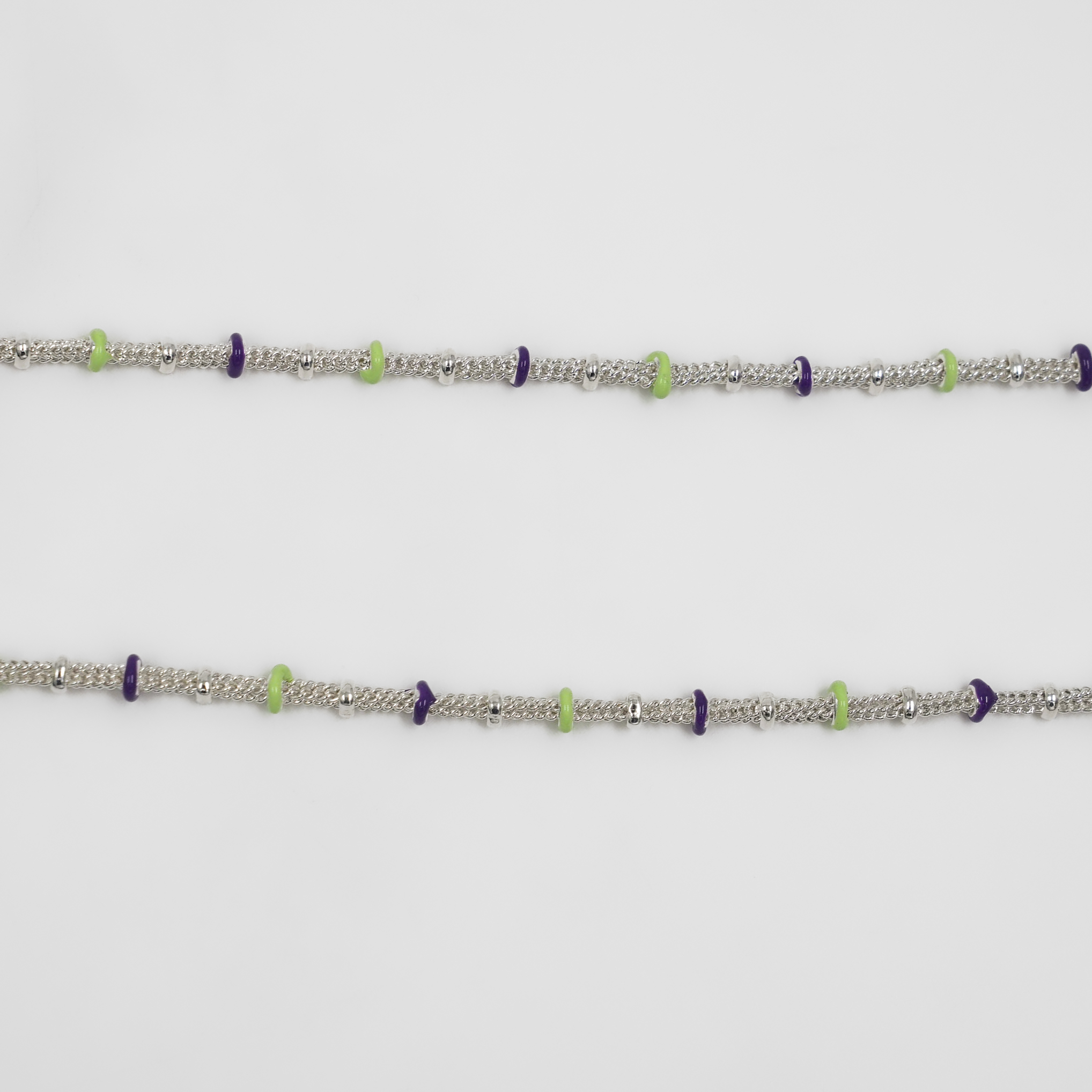 Elegant silver beaded anklet with vibrant green and purple accents, perfect for daily wear. Buy Silver Beaded Anklet from Raag Silver Jewellery in Hyderabad.