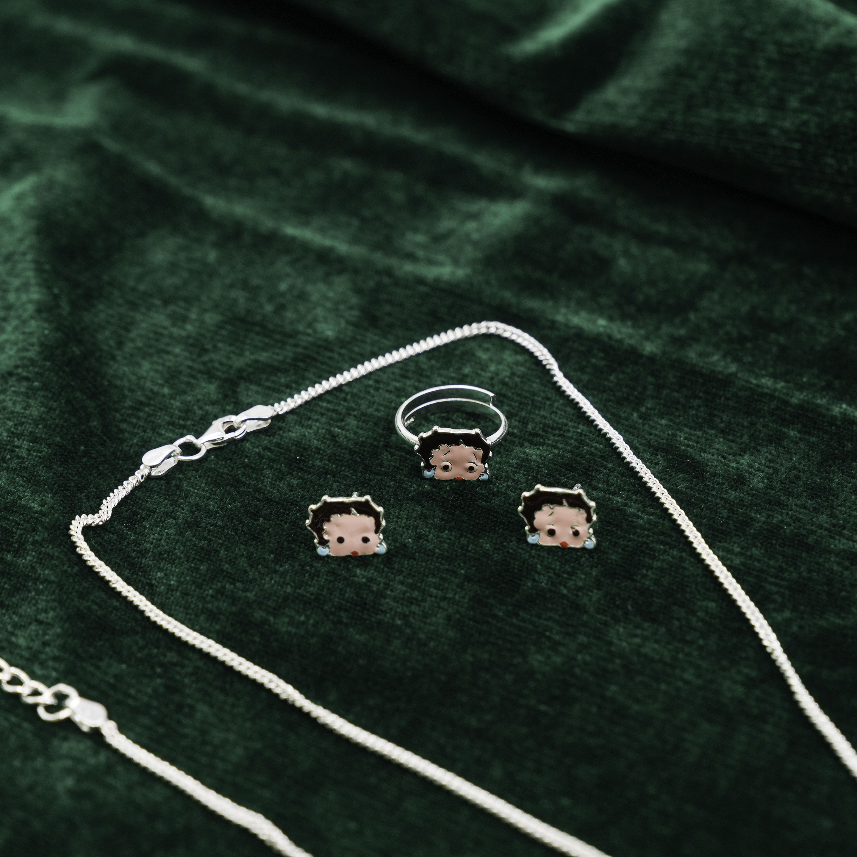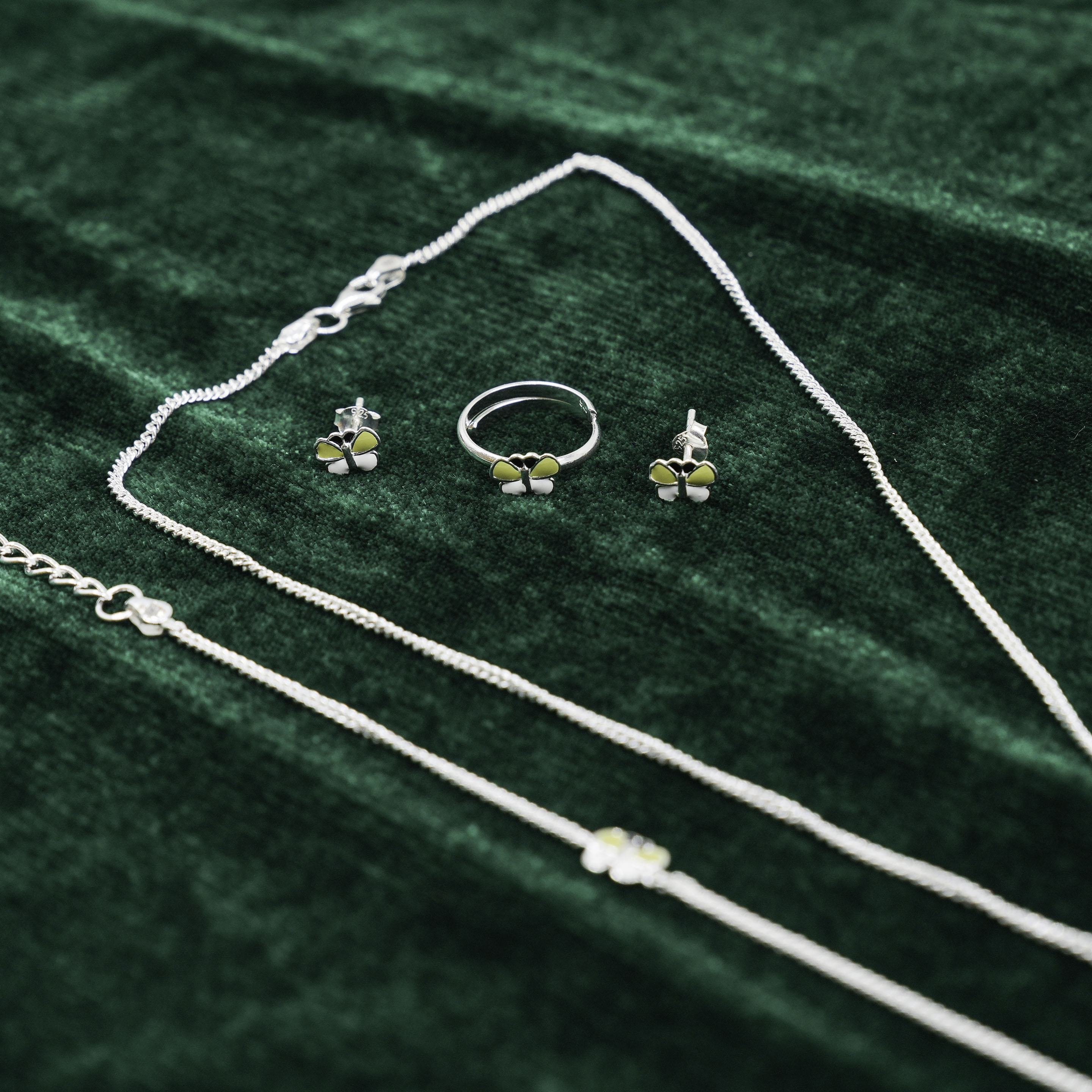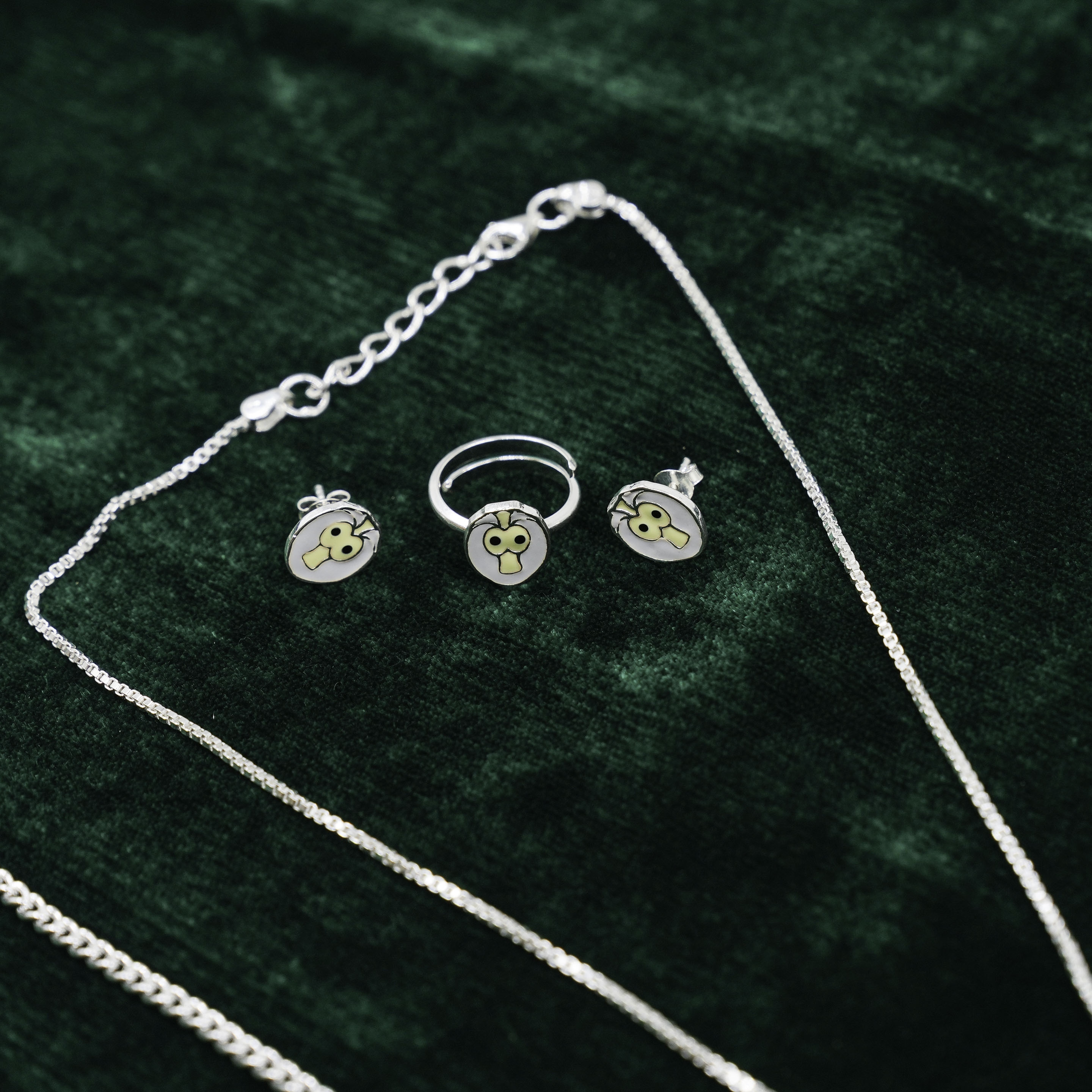 Cute silver charm set featuring necklace, ring and earrings, perfect for gifting. Buy Silver Charm Set from Raag Silver Jewellery in Hyderabad.
