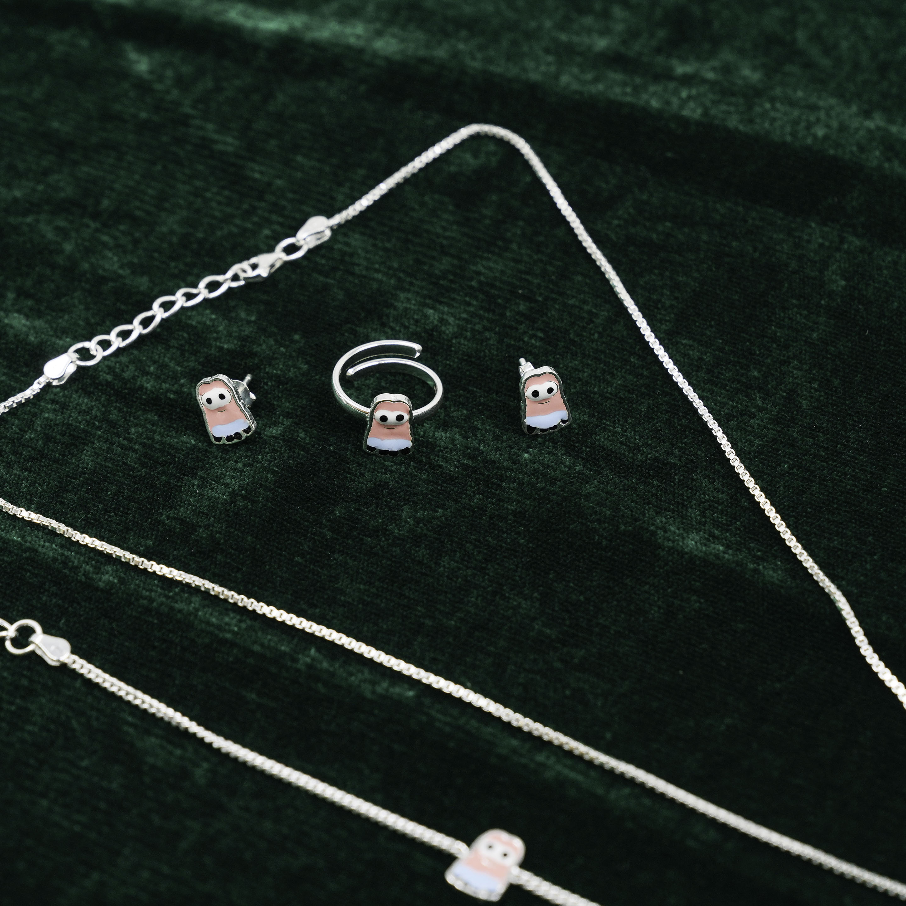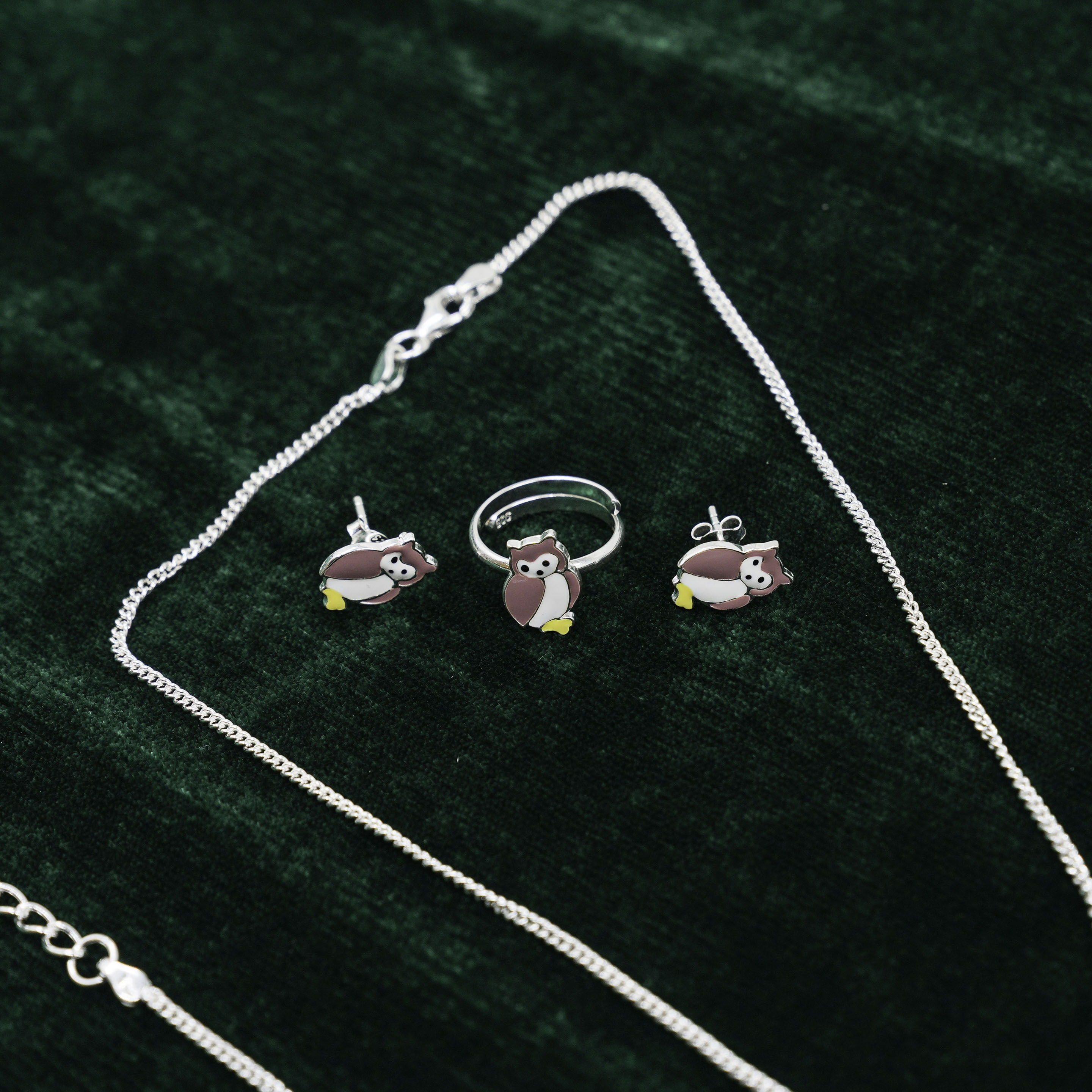 Charming silver owl ring, earrings, necklace and bracelet set, ideal for gifting. Buy Silver Owl Set from Raag Silver Jewellery in Hyderabad.