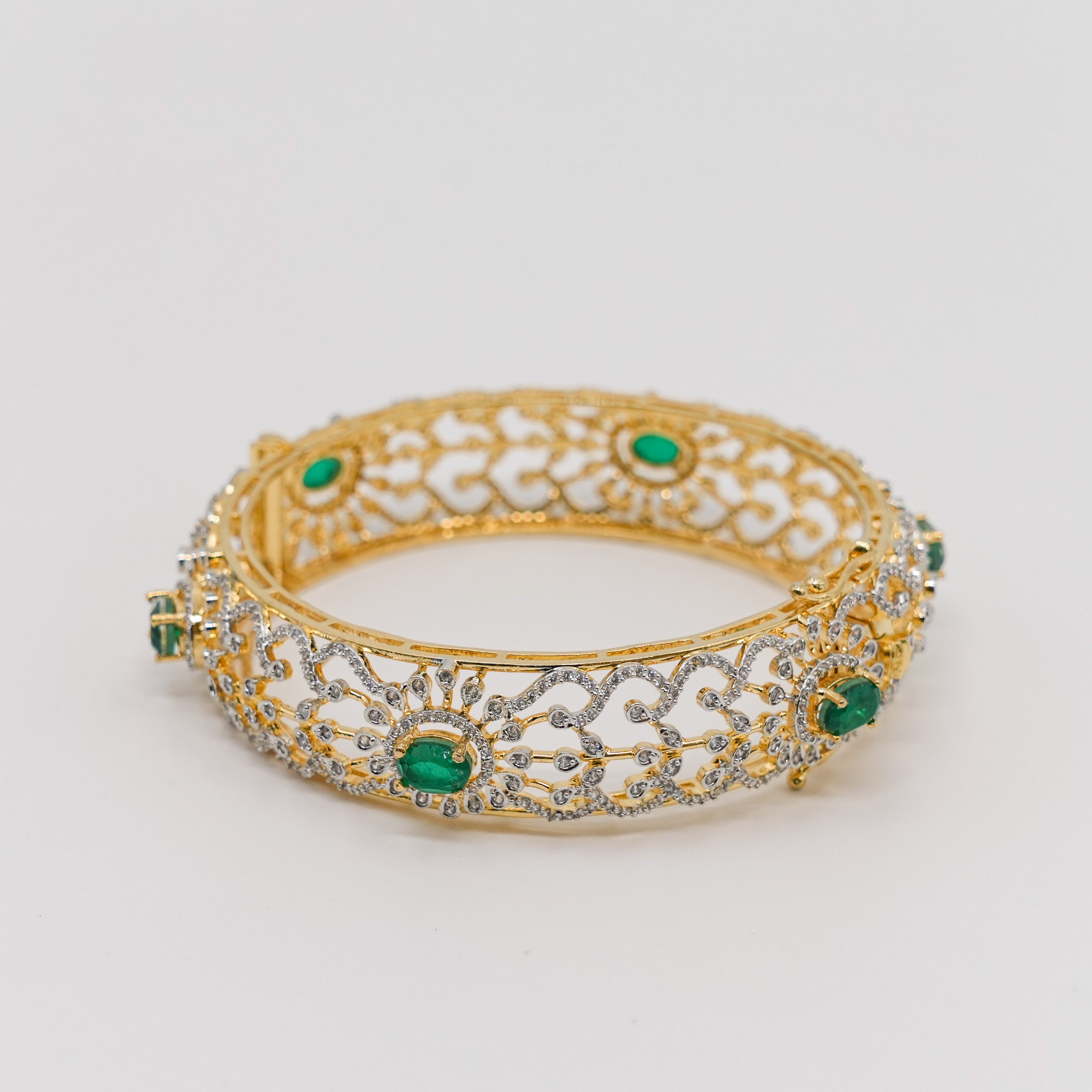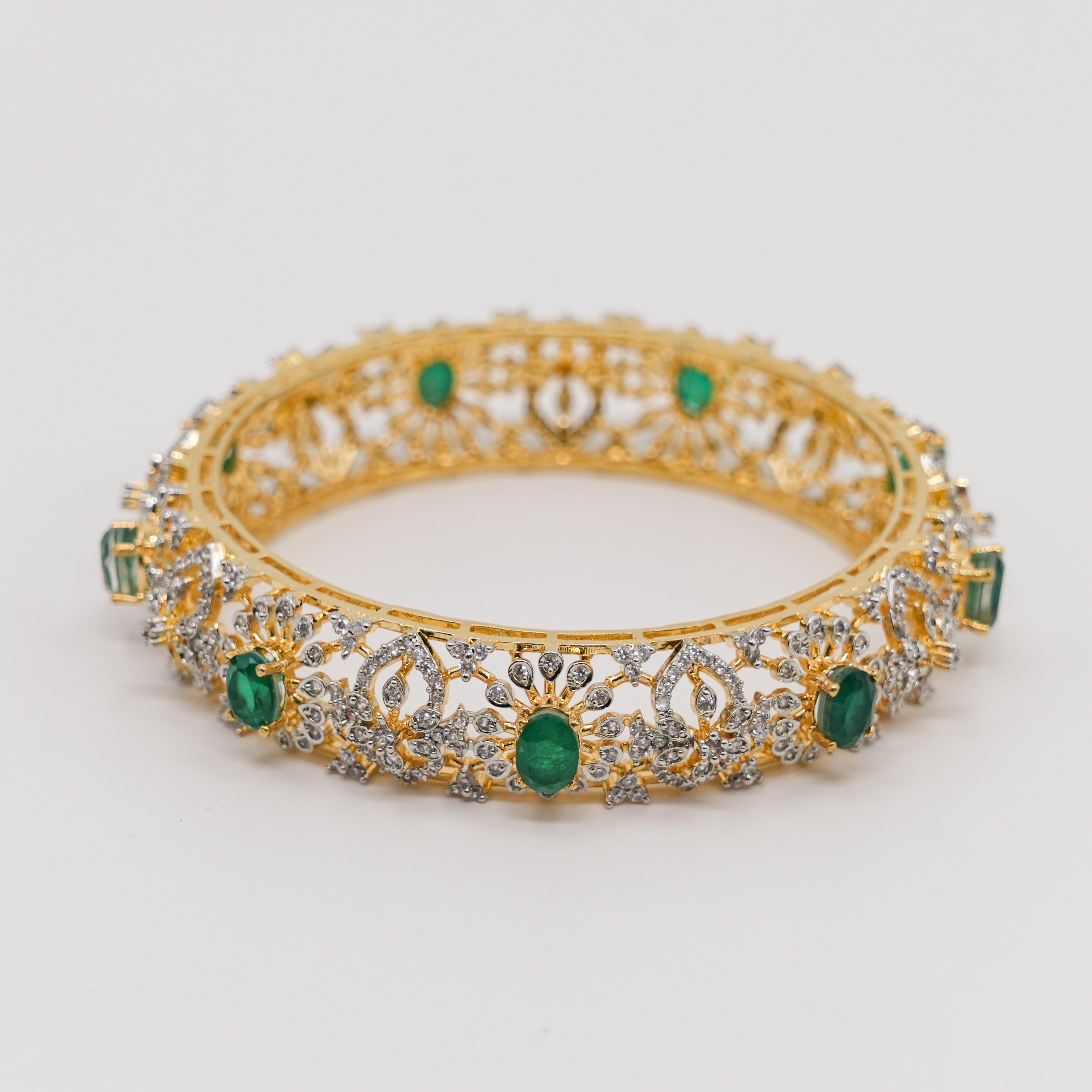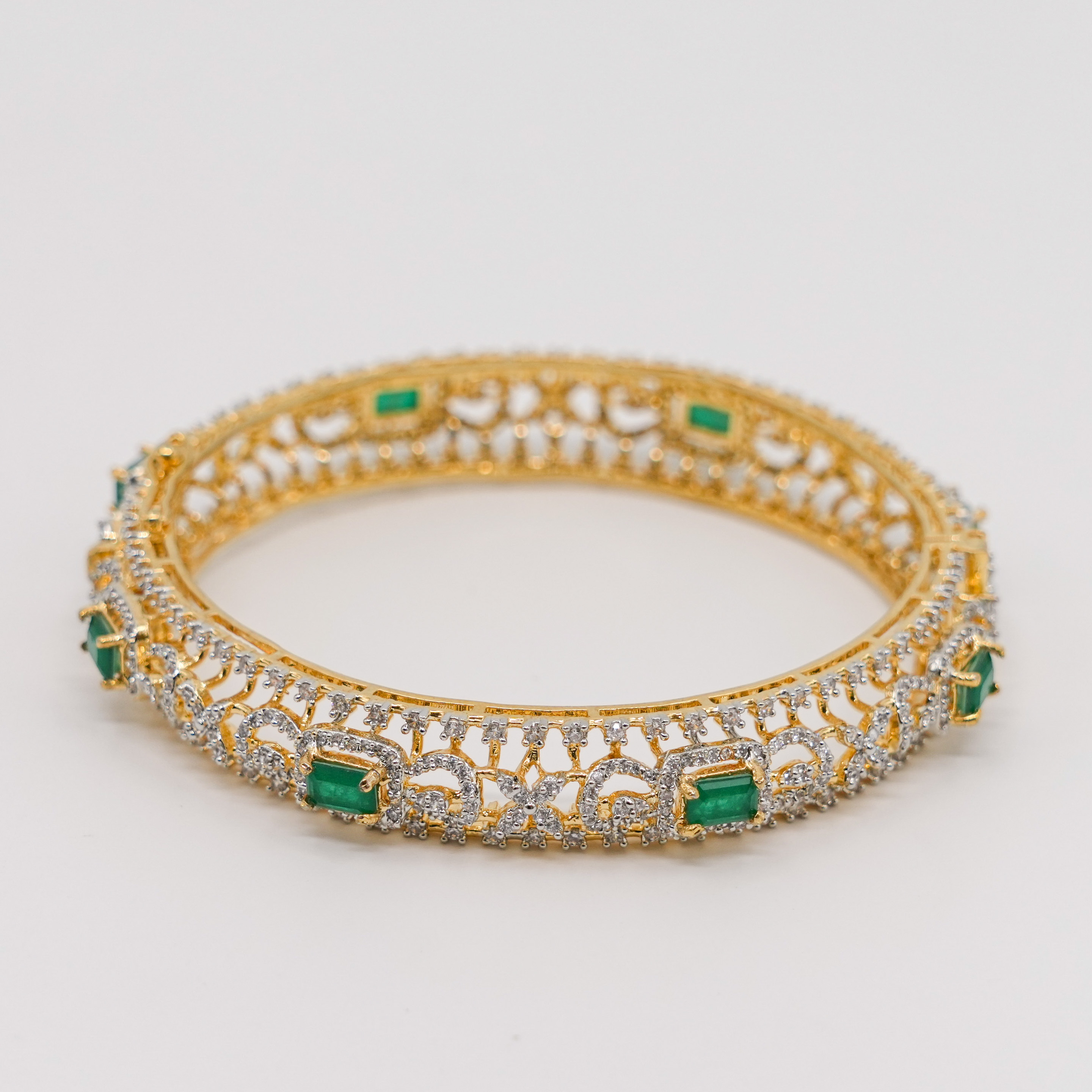 Gold plated bangle set with emerald stones and intricate diamond work. Perfect for weddings. Buy emerald bangle set from Raag Silver Jewellery in Hyderabad.