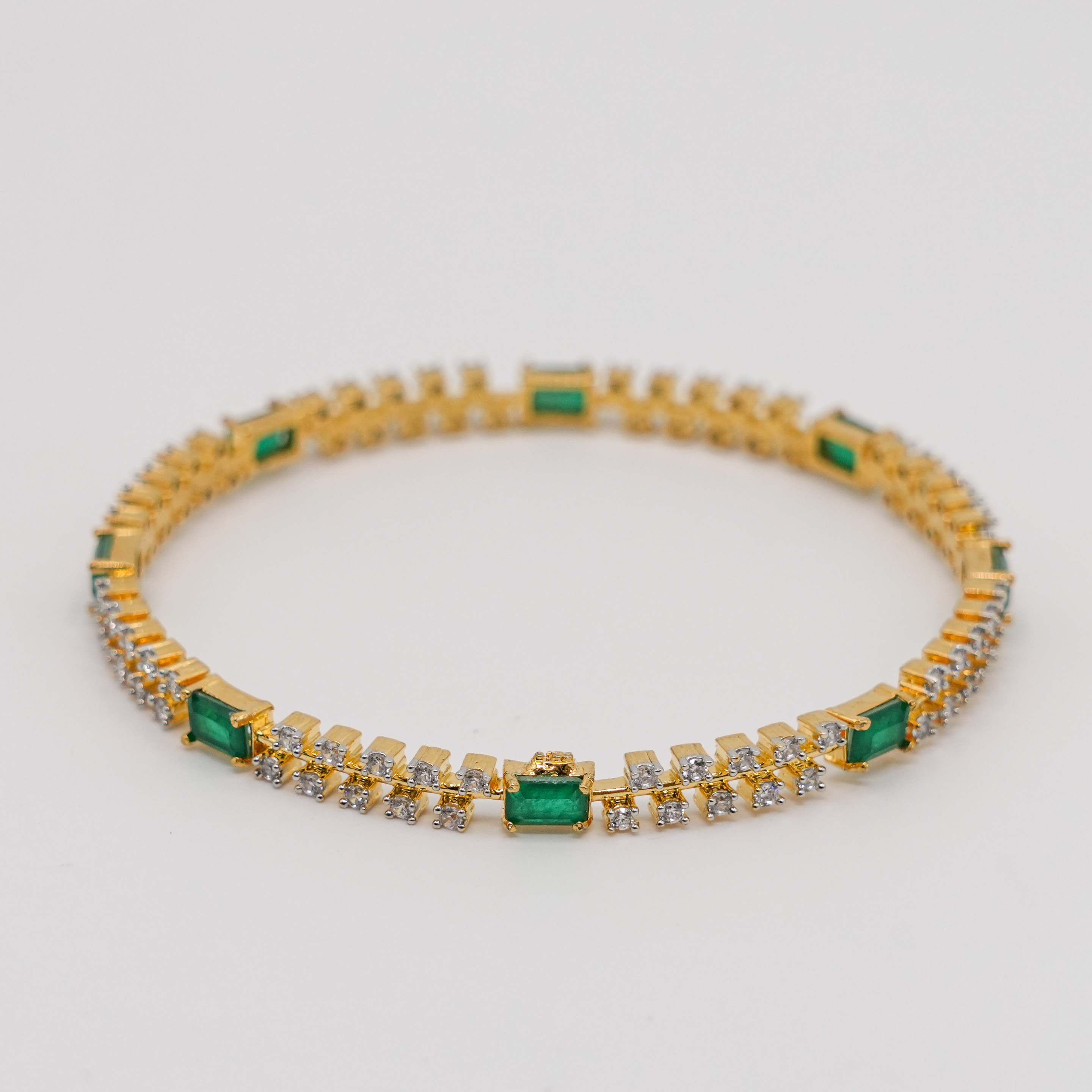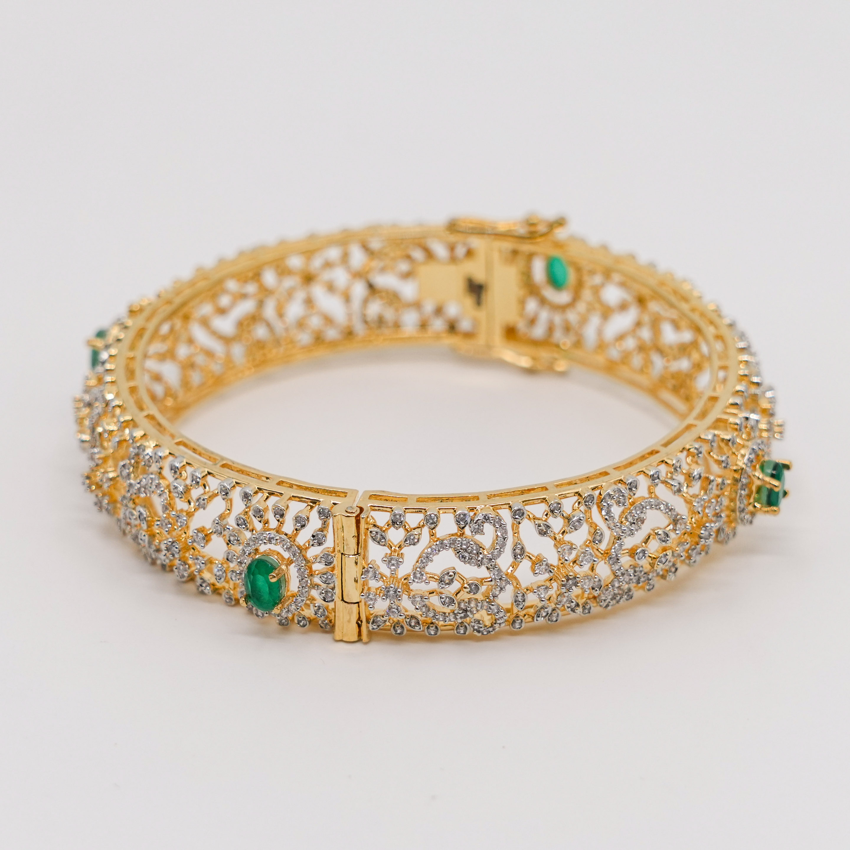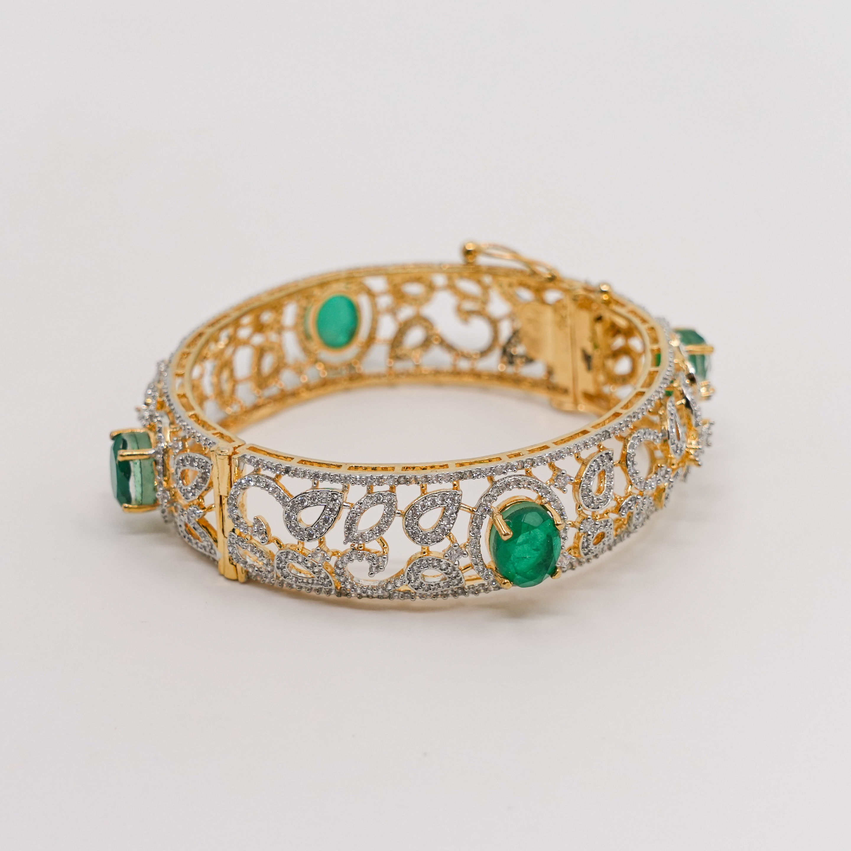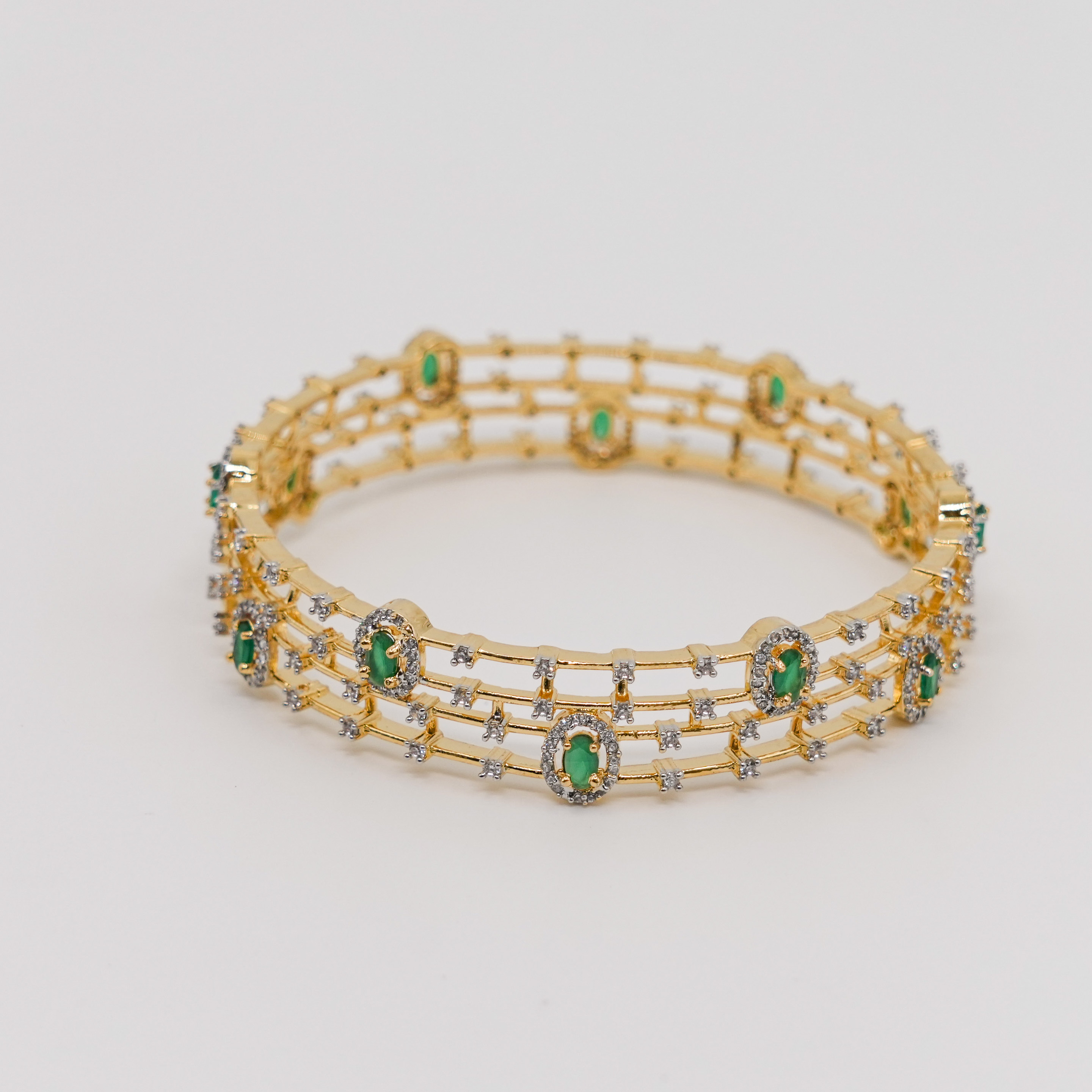 Gold plated bangle set with emerald stones and intricate diamond work. Perfect for weddings. Buy emerald bangle set from Raag Silver Jewellery in Hyderabad.