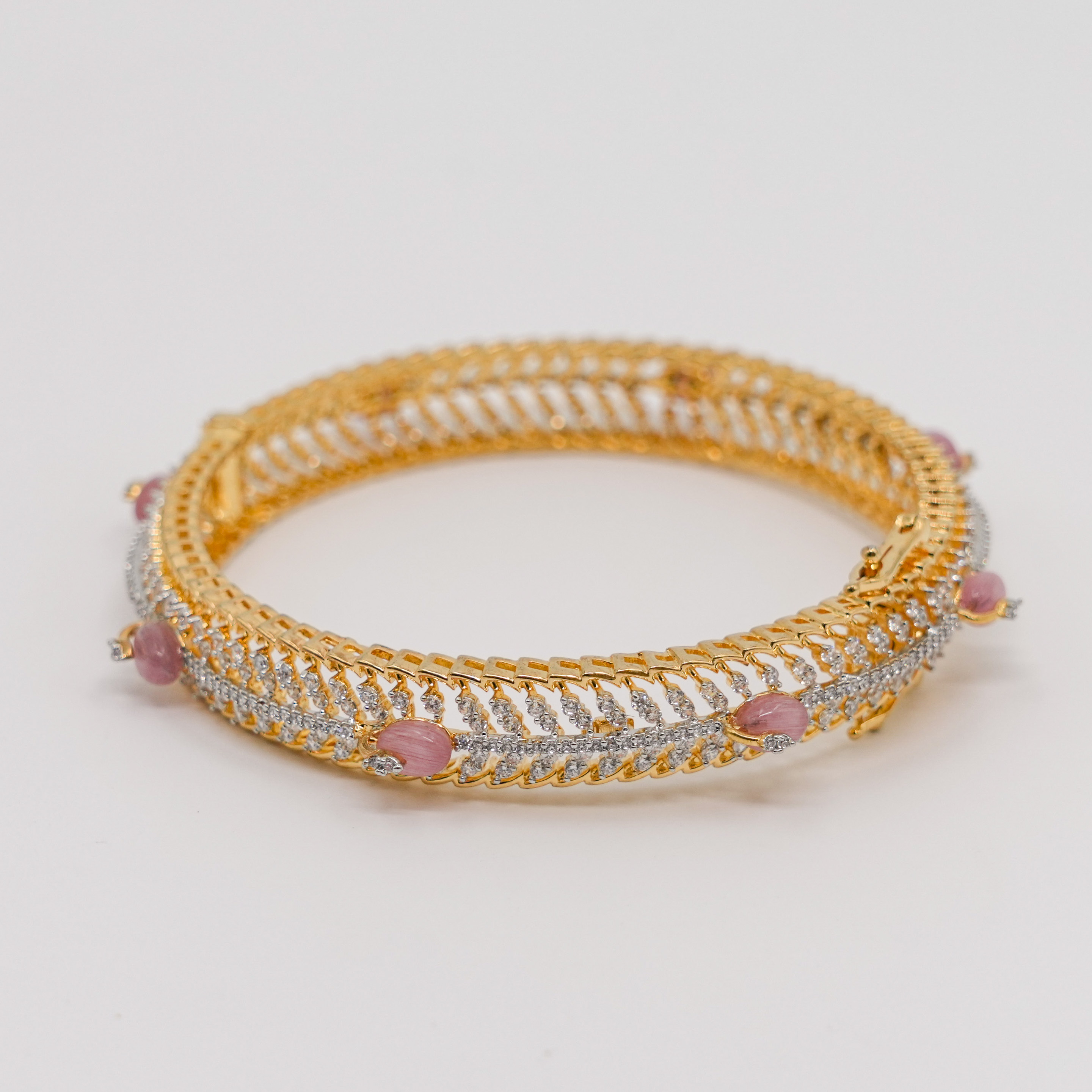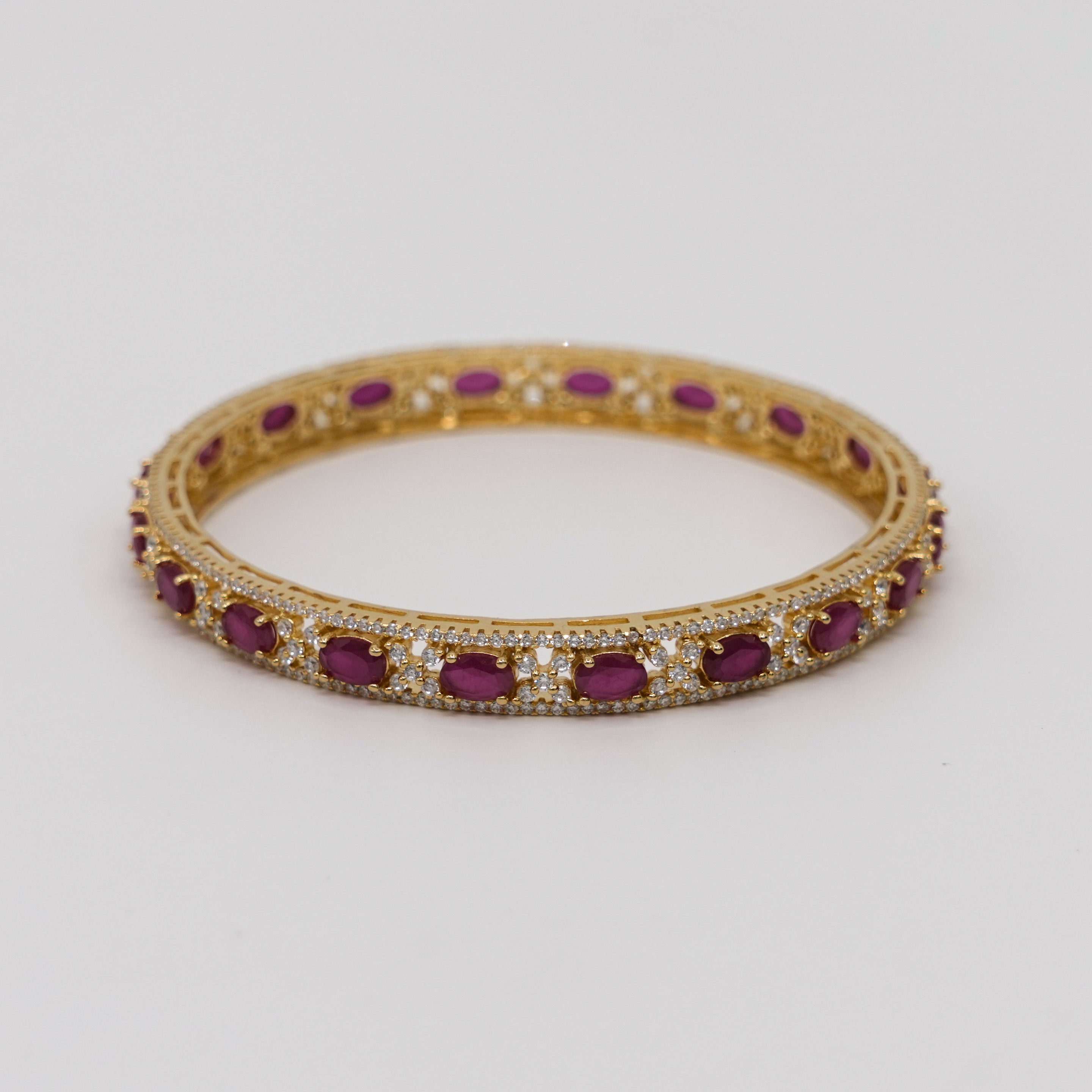 Elegant gold plated bangle with ruby stones and cubic zirconia, ideal for parties and festive wear. Buy ruby gold bangle from Raag Silver Jewellery in Hyderabad.