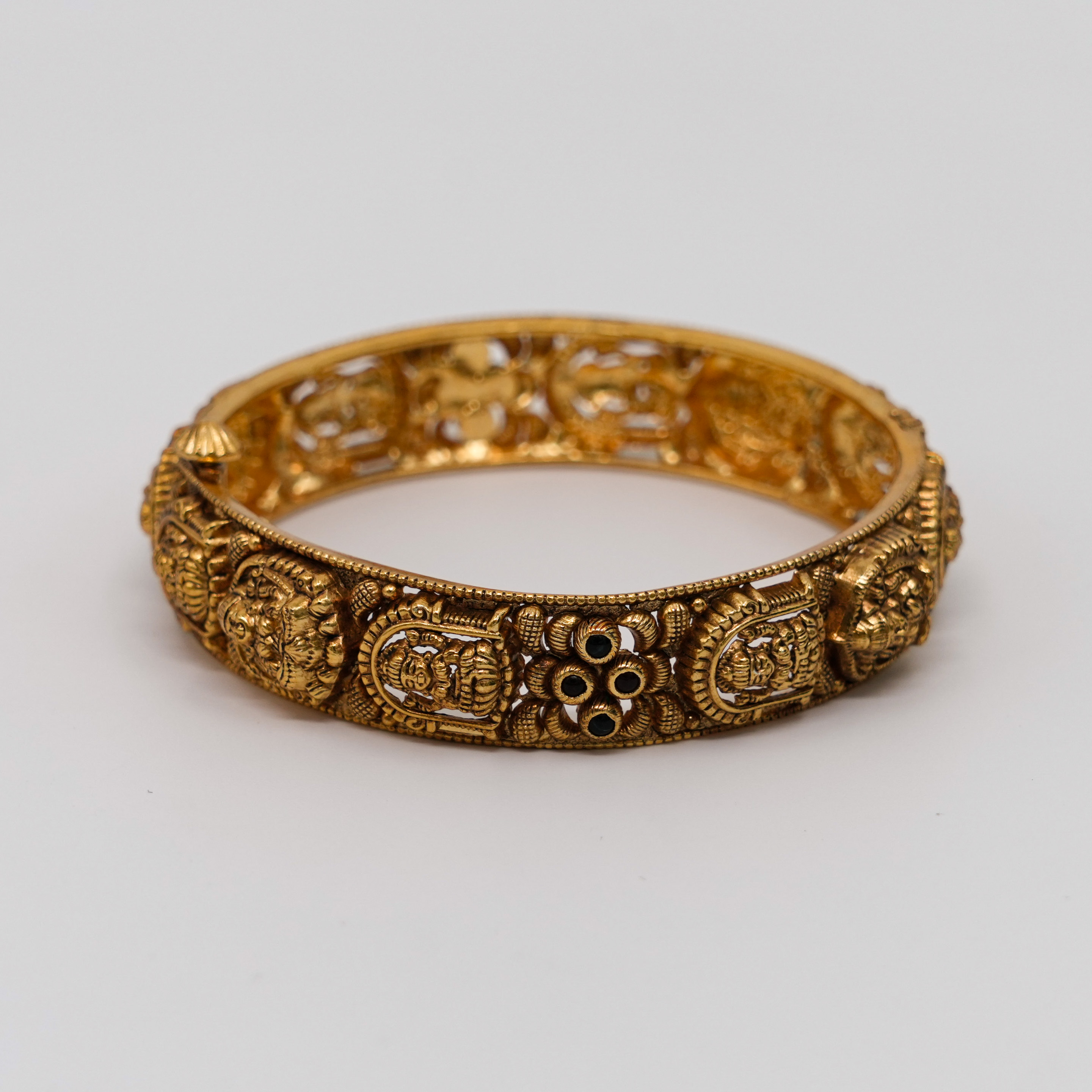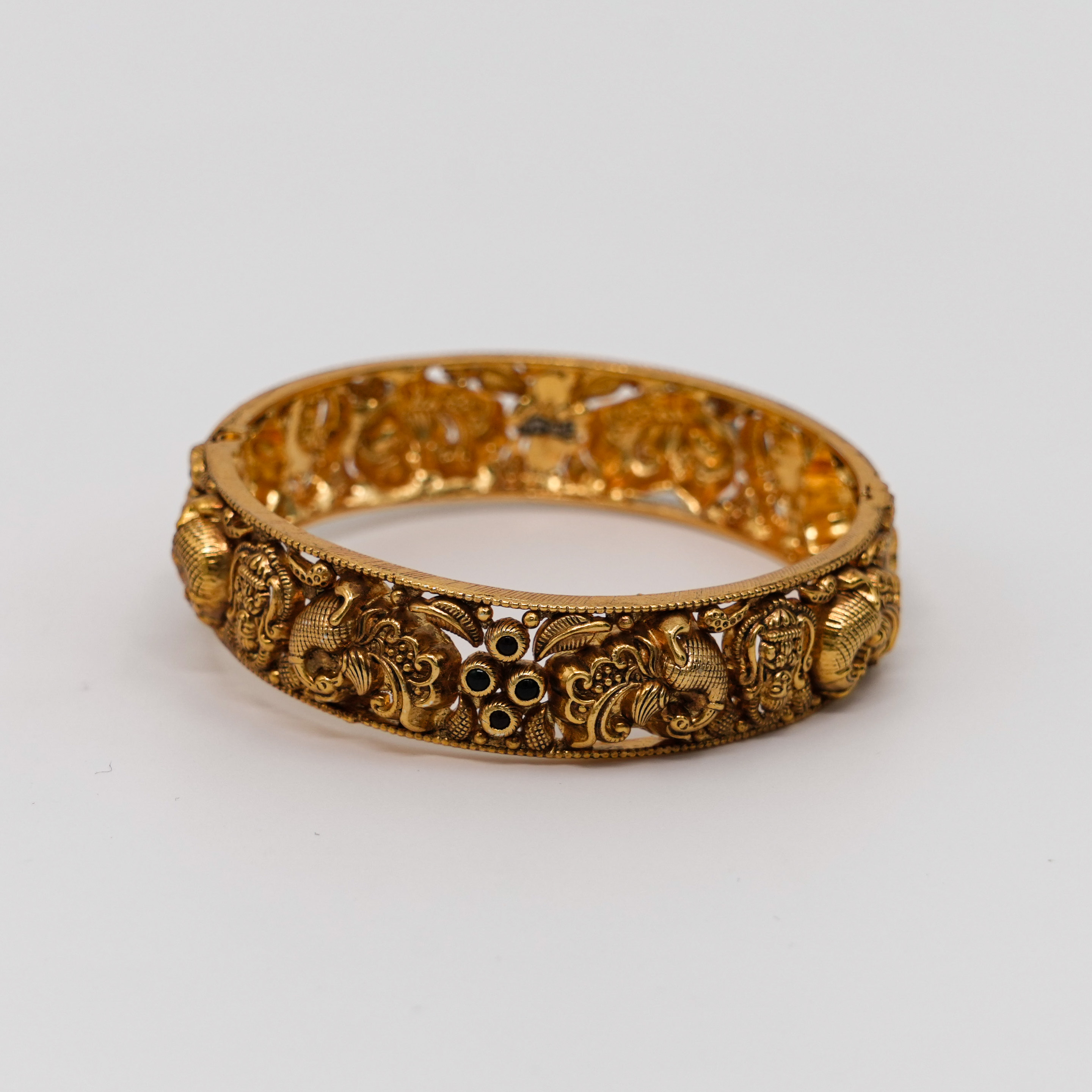 Intricately designed gold plated bangle with floral and peacock motifs, perfect for festive occasions. Buy Gold Plated Bangle from Raag Silver Jewellery in Hyderabad.