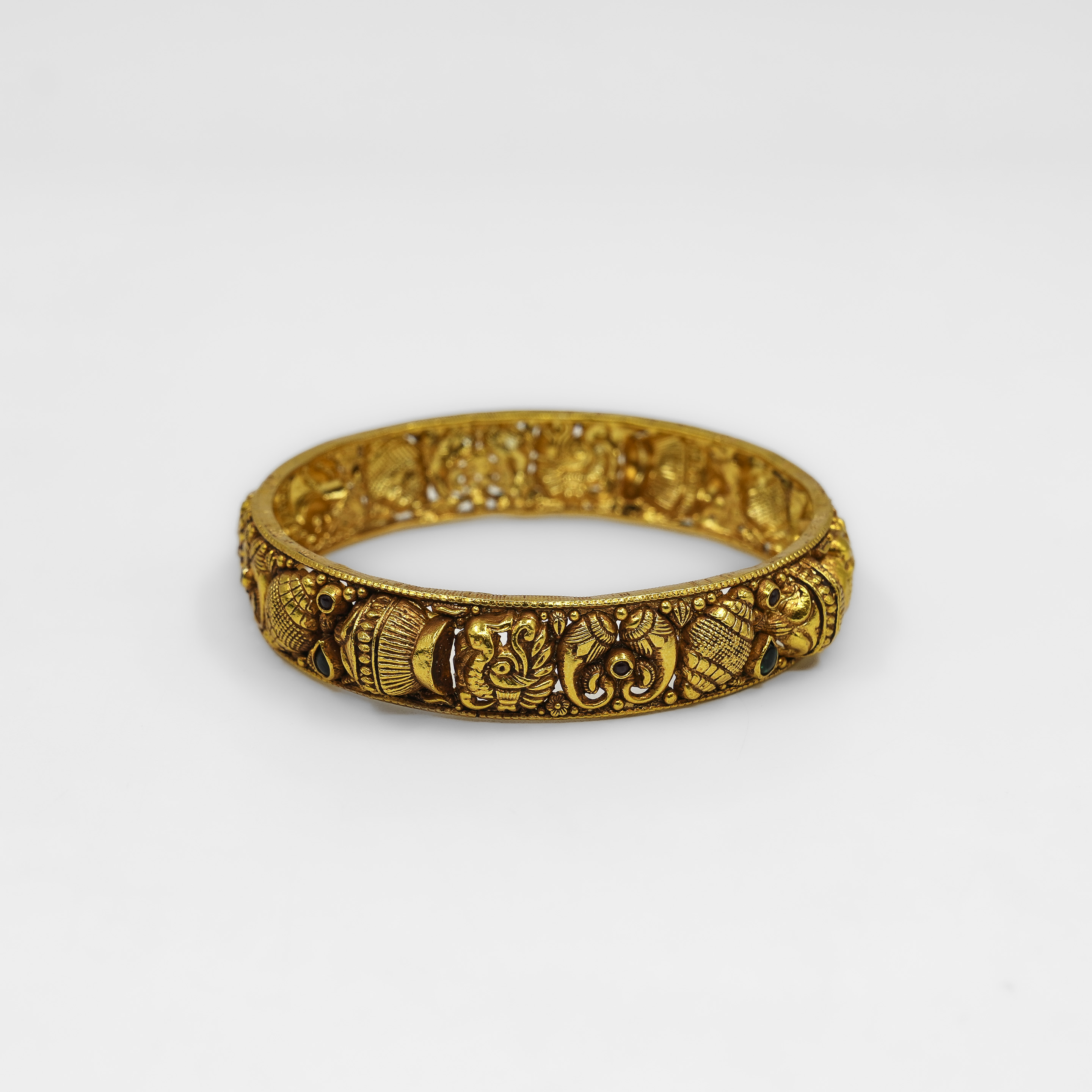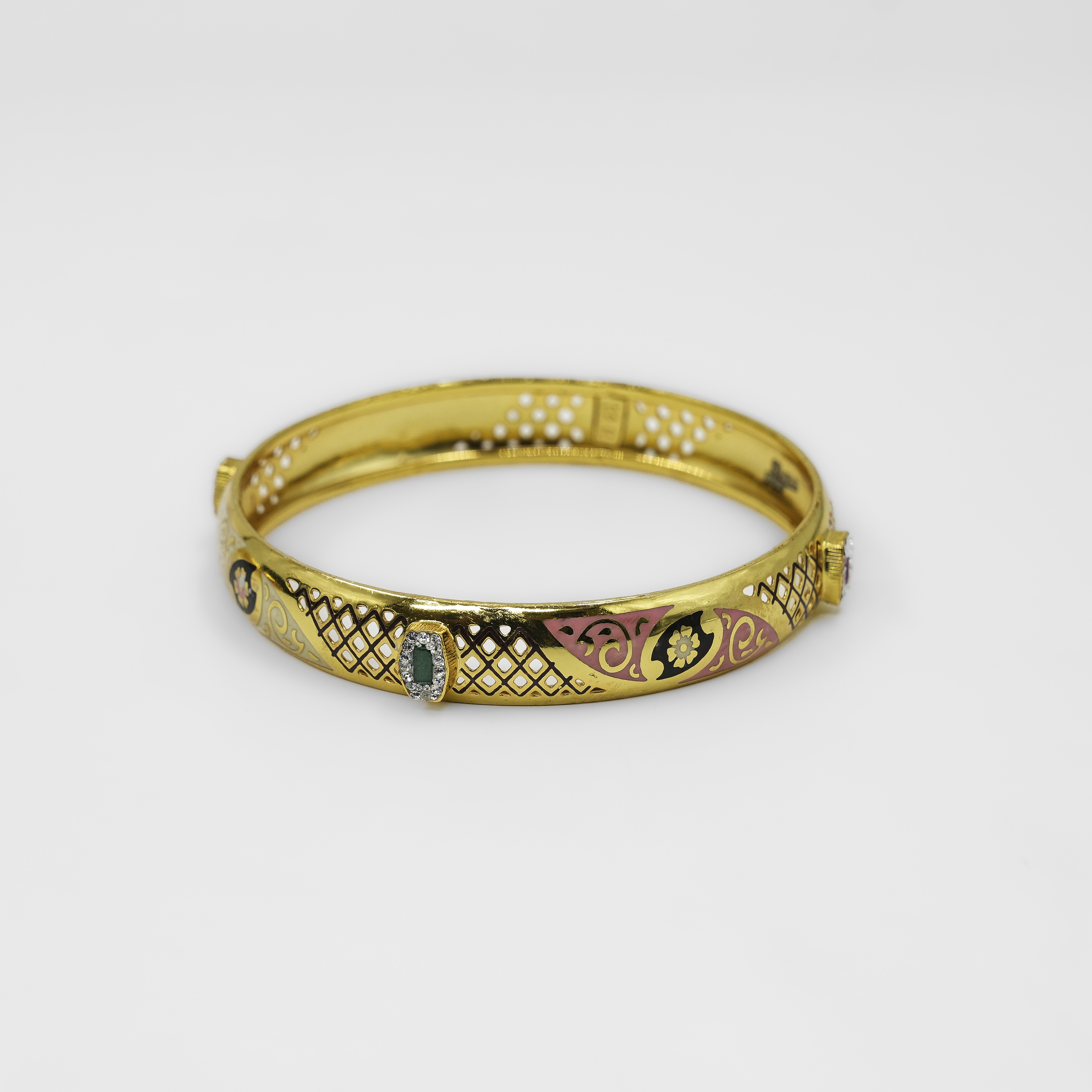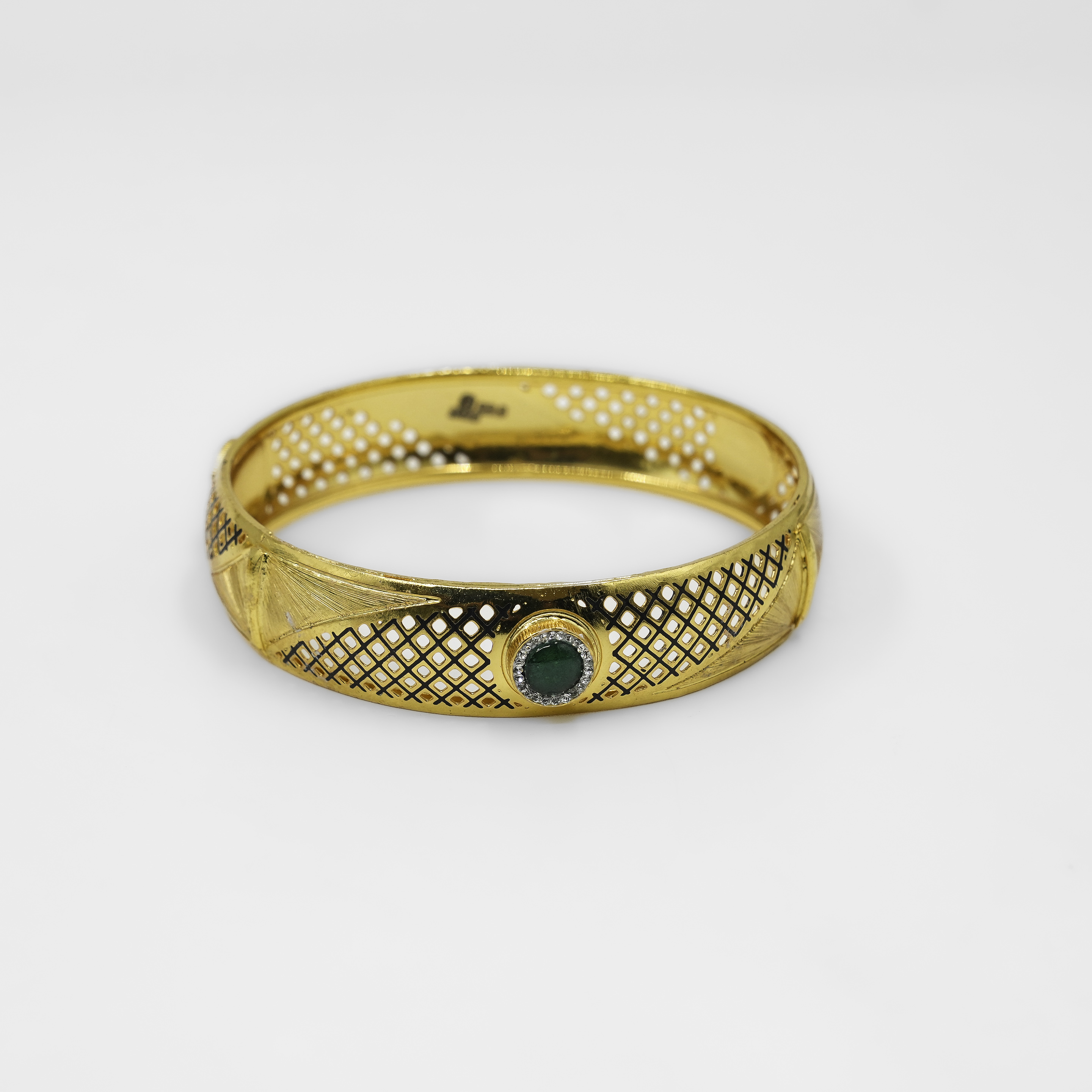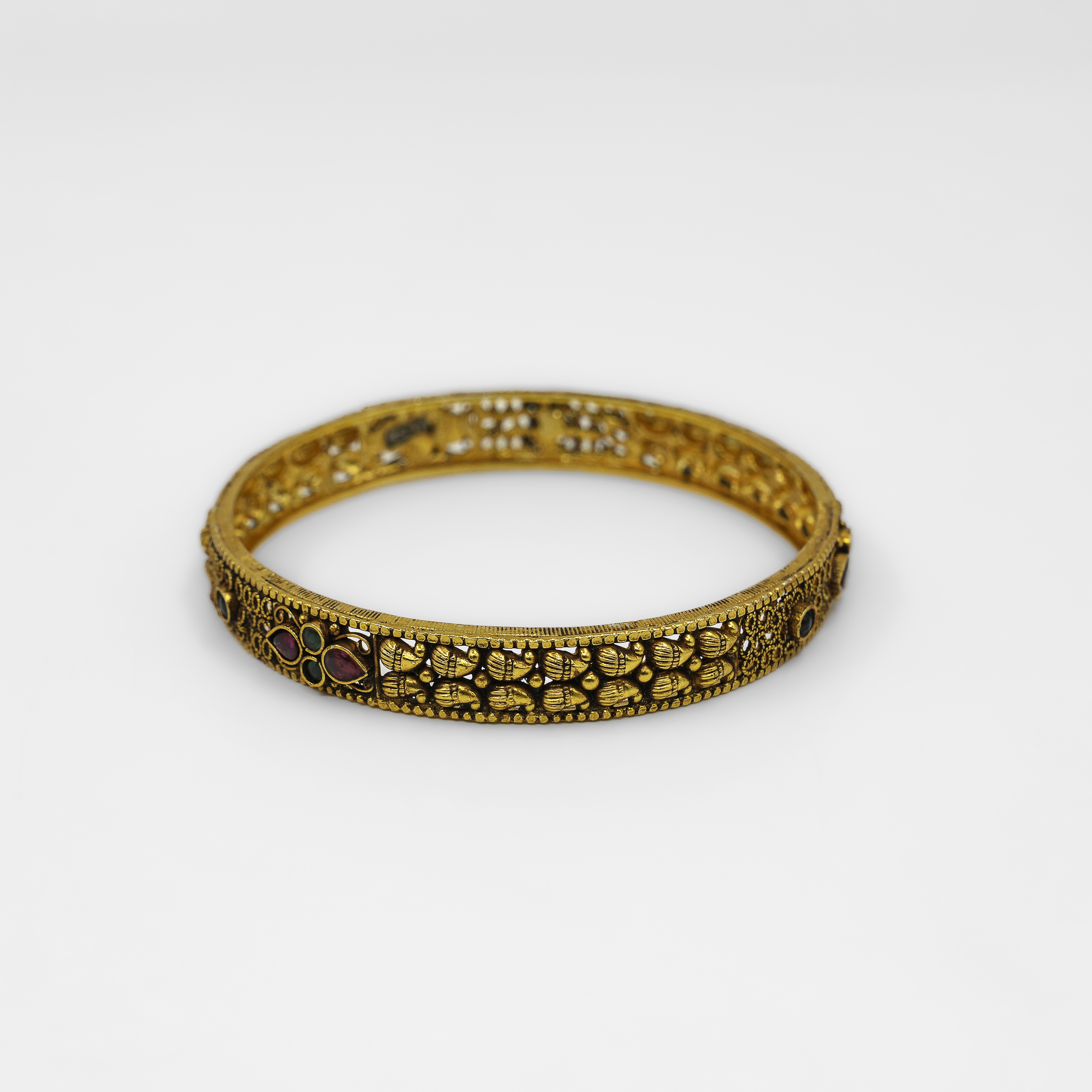 Elegant Gold Polished Silver bangle adorned with ruby, emerald, and crystal stones, perfect for traditional attire. Buy Gold Polished Silver Stone Bangle from Raag Silver Jewellery in Hyderabad.