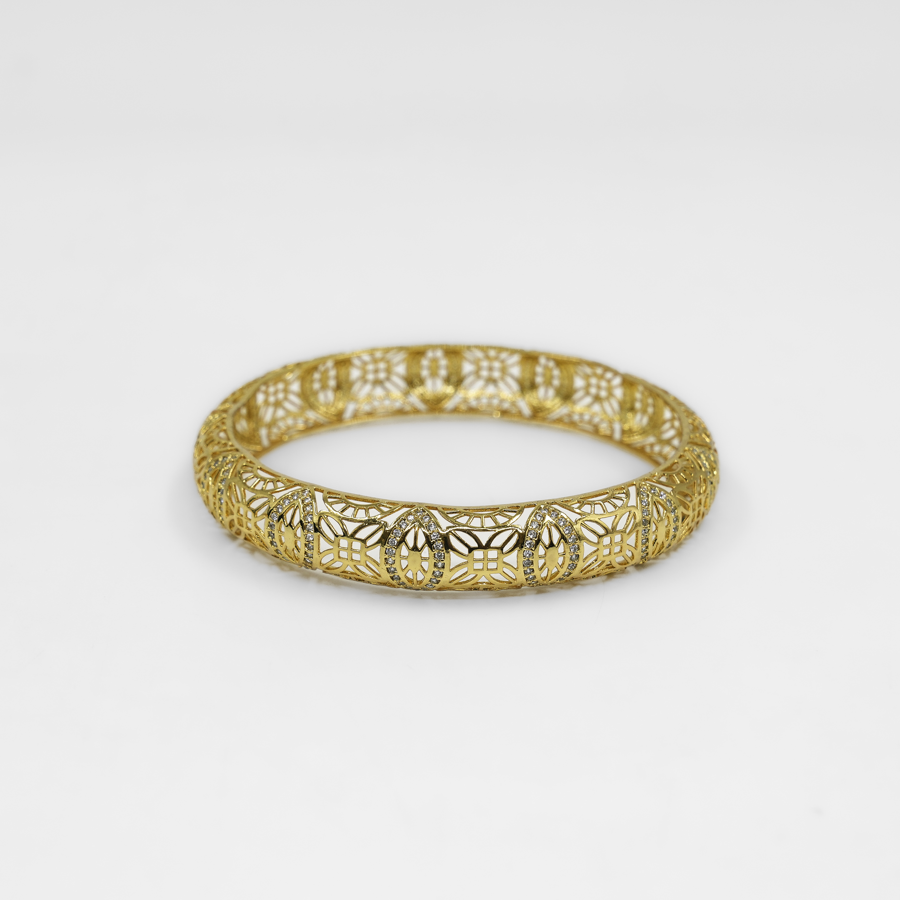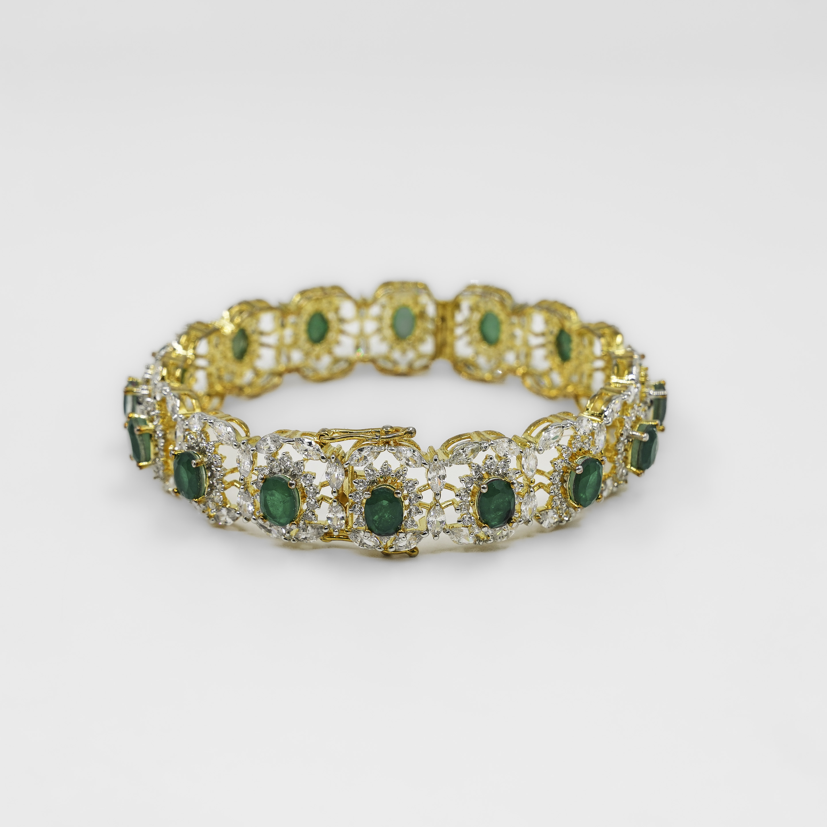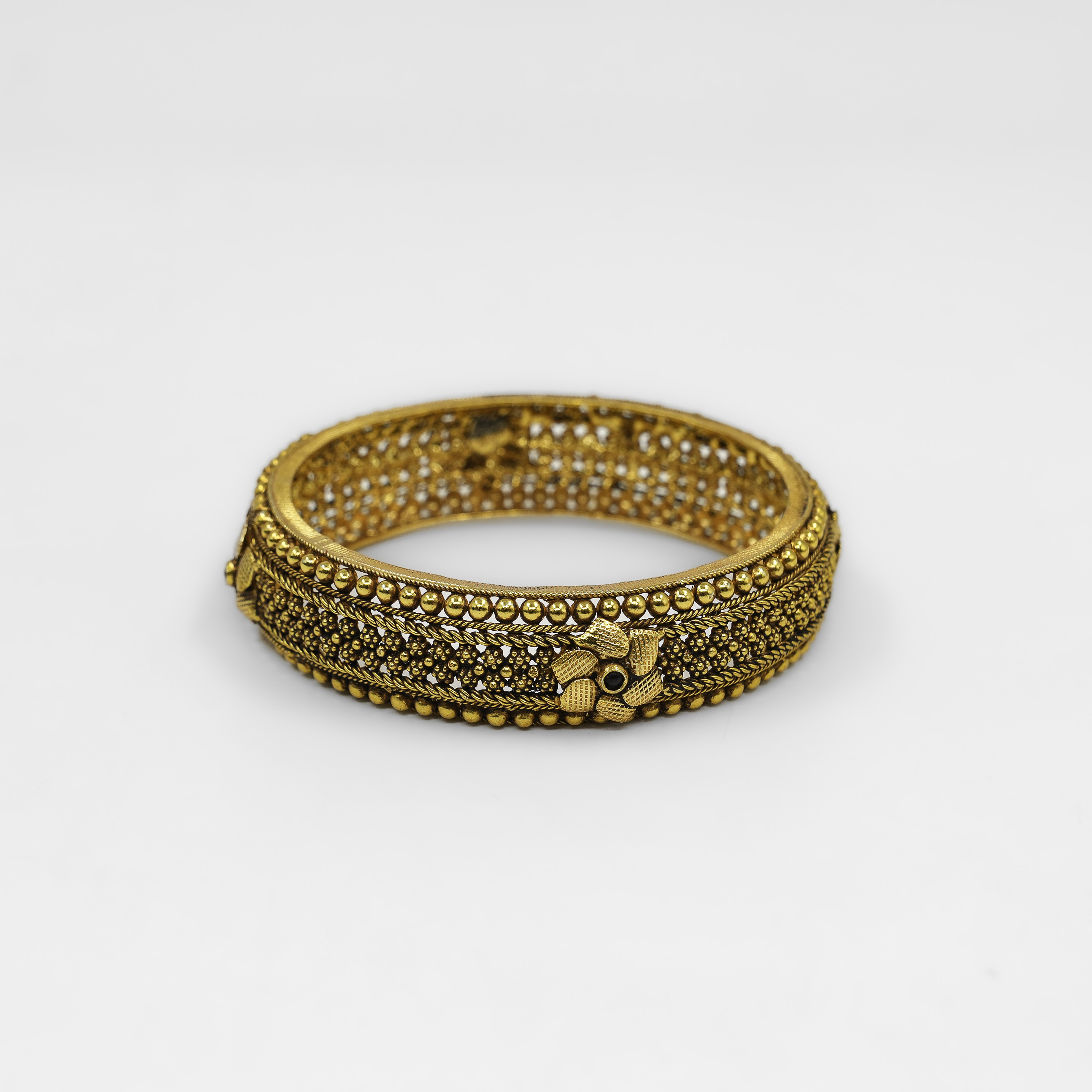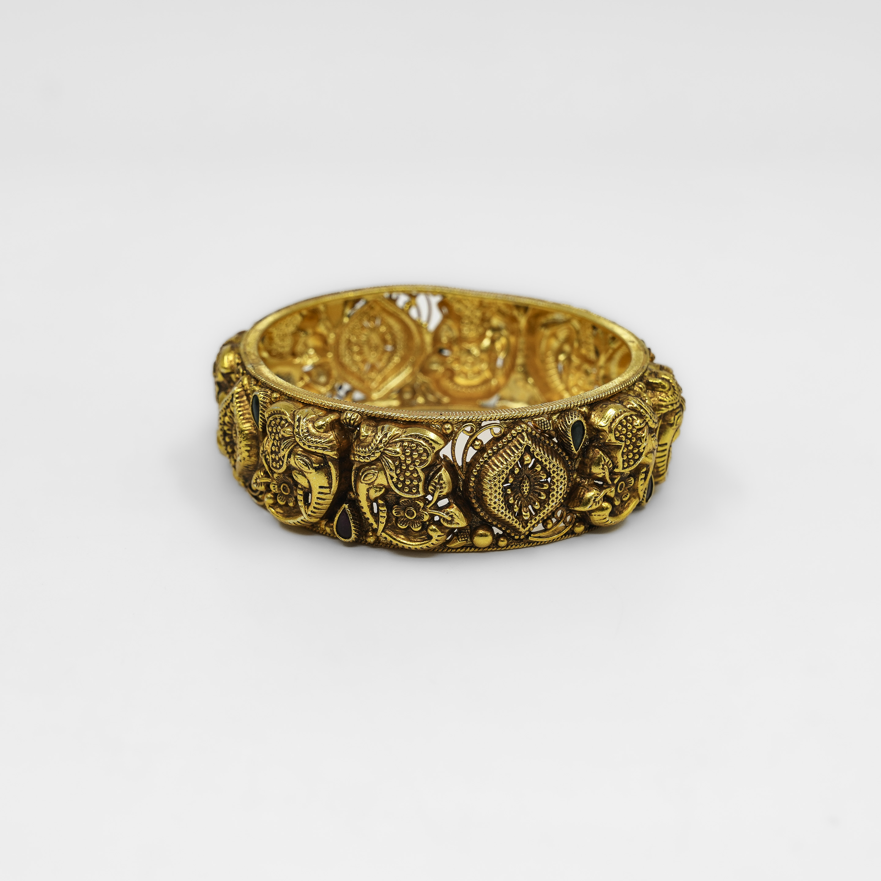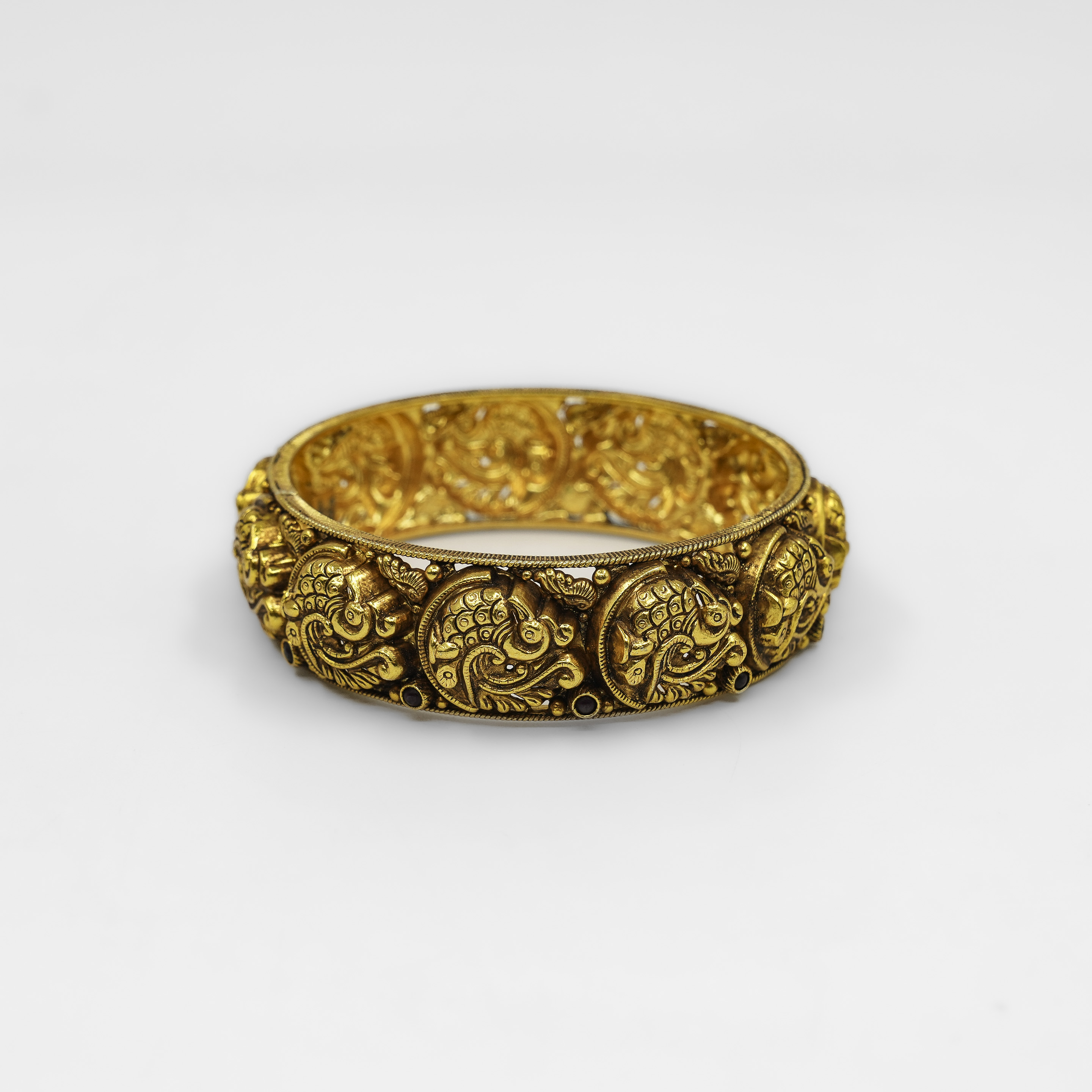 Elegant Gold Polished Silver bangle adorned with ruby, emerald, and crystal stones, perfect for traditional attire. Buy Gold Polished Silver Stone Bangle from Raag Silver Jewellery in Hyderabad.