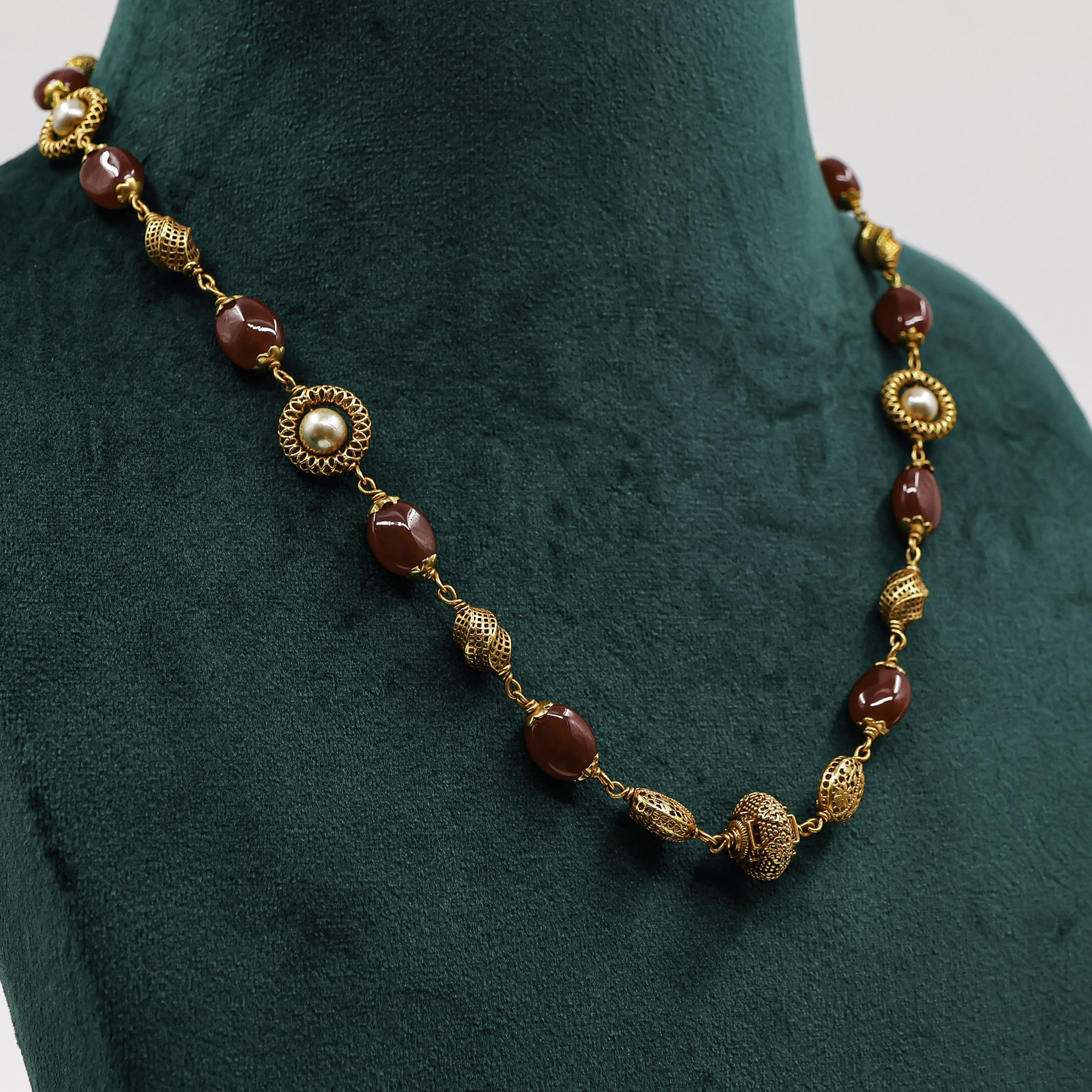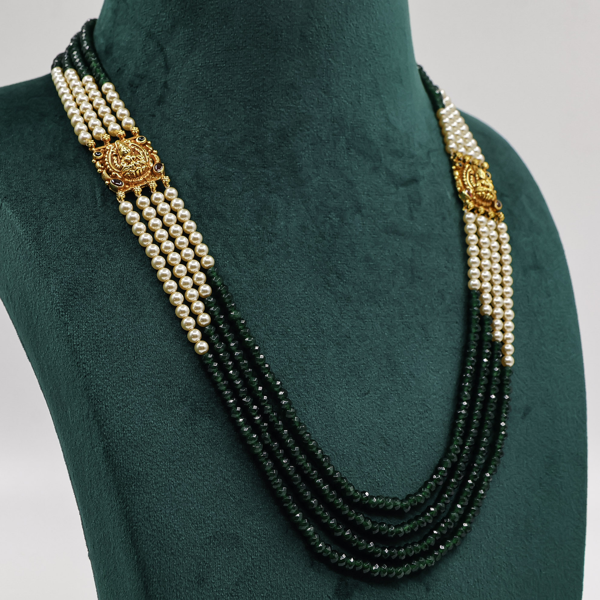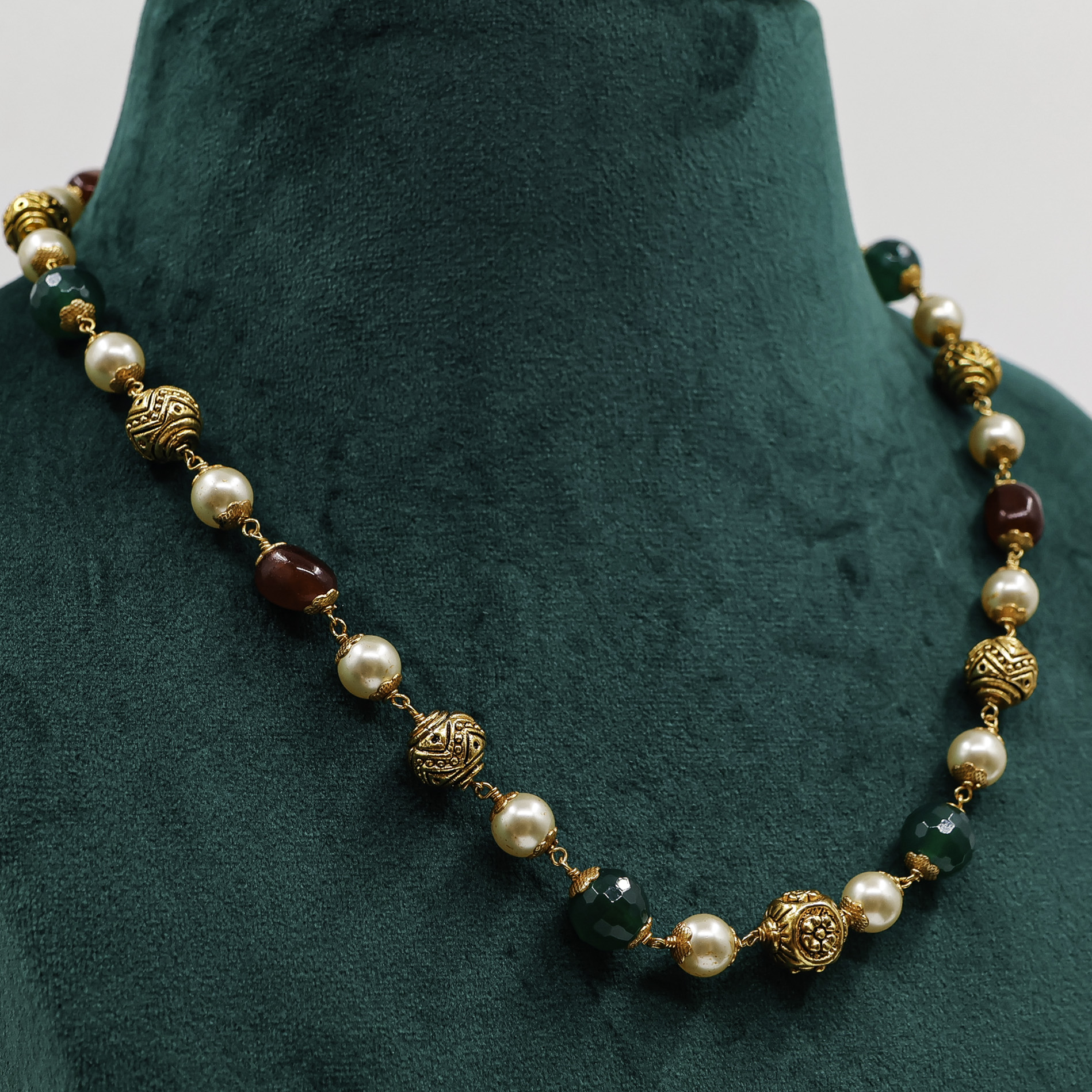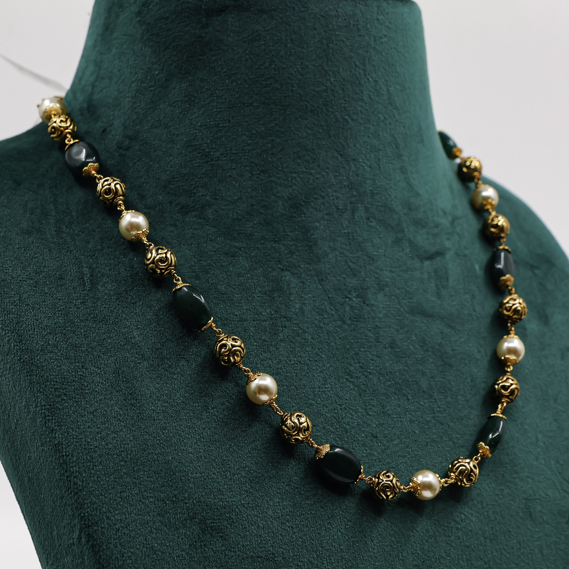 Classic beaded Gold Polished Silver necklace featuring green and pearl beads, suitable for traditional and festive occasions. Buy Beaded Gold Polished Silver Necklace from Raag Silver Jewellery in Hyderabad.