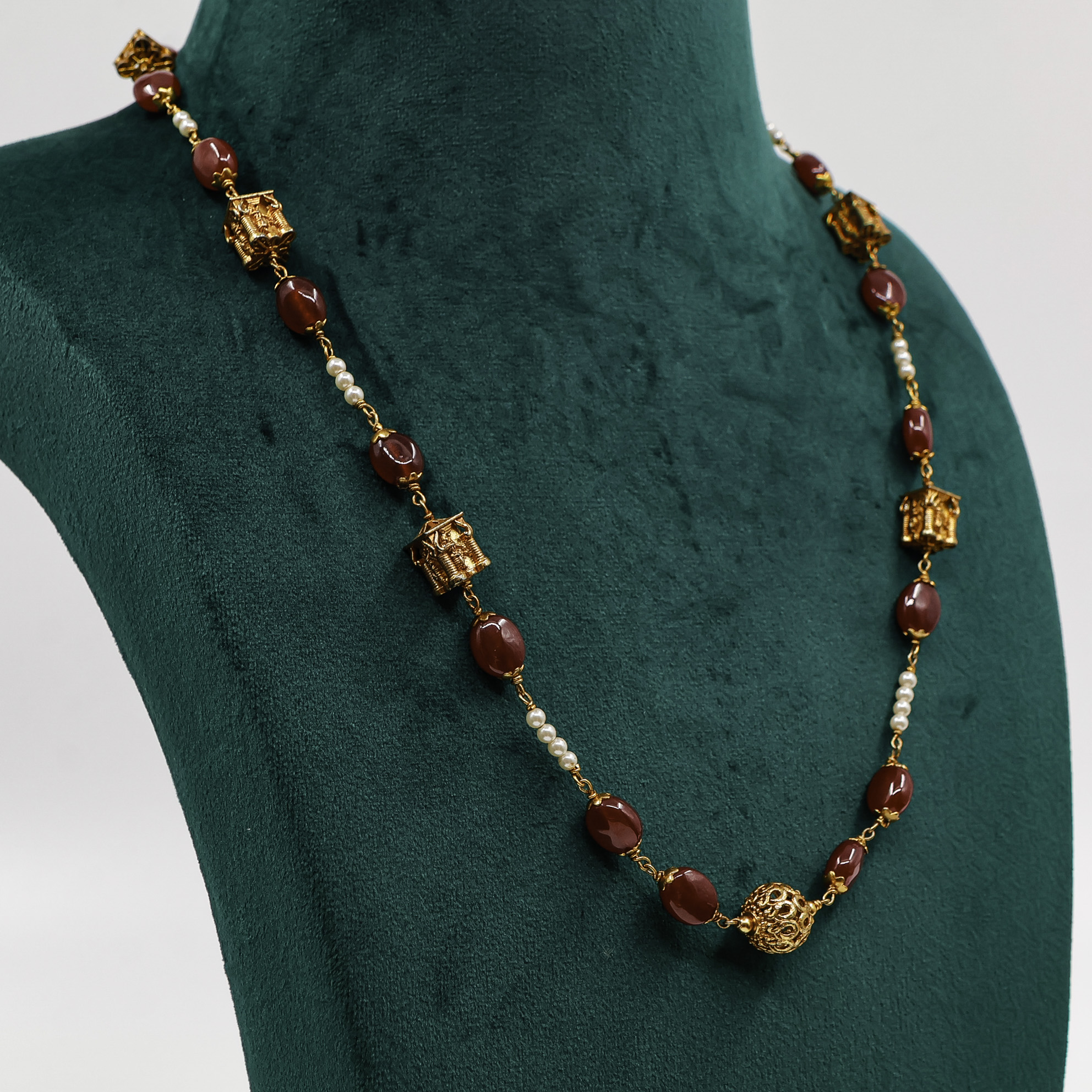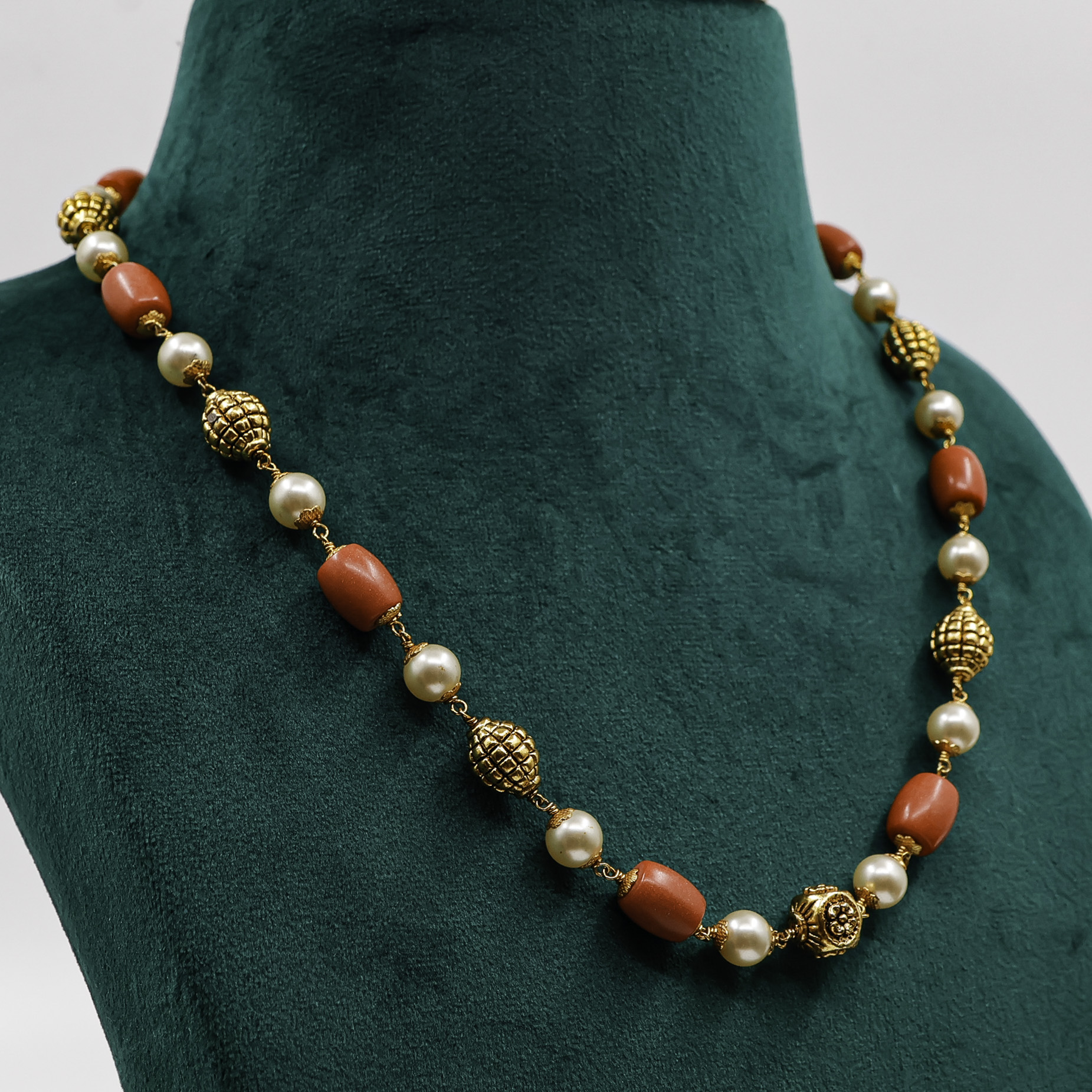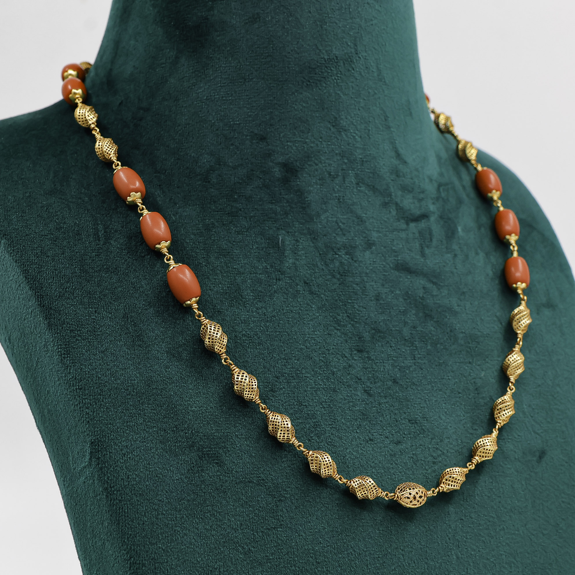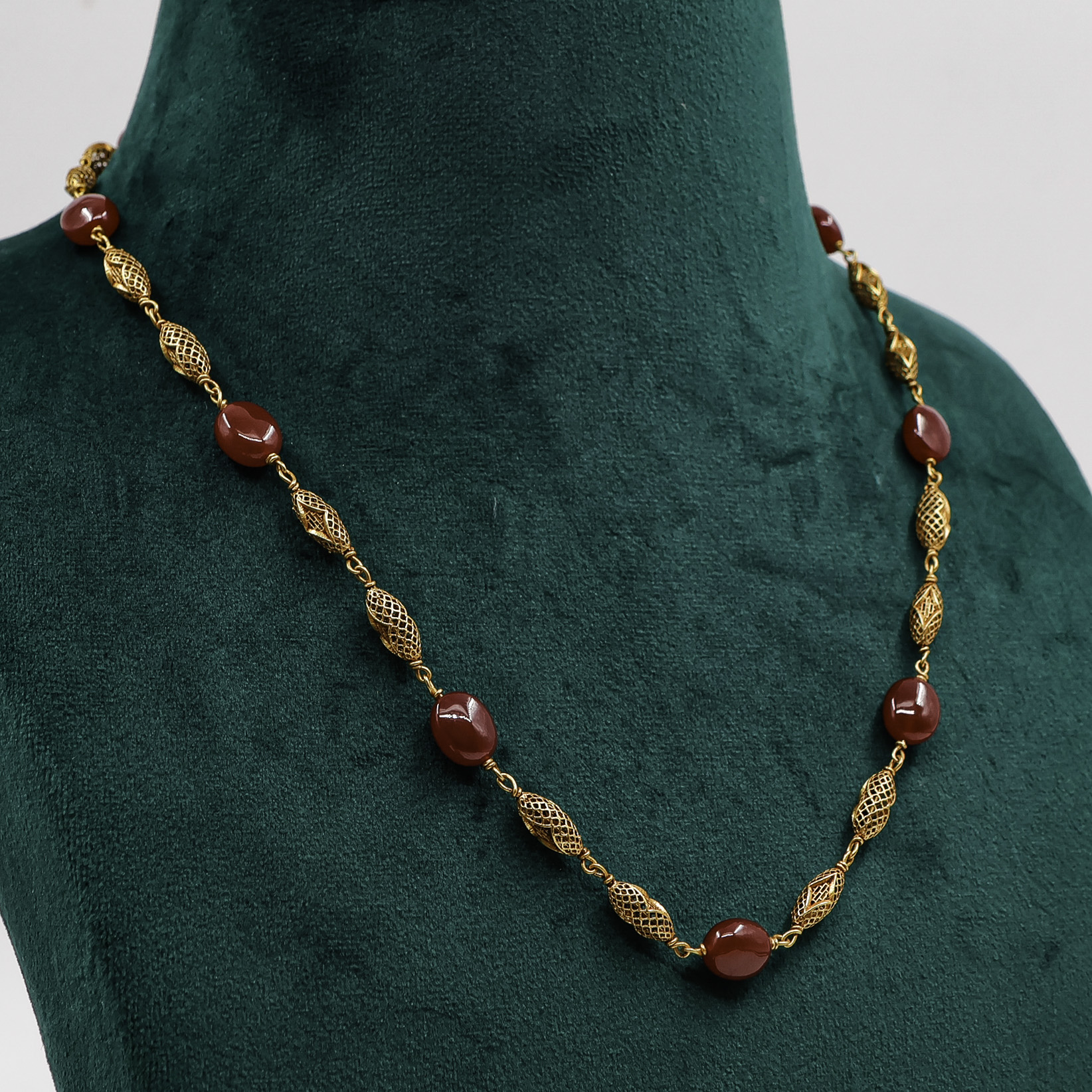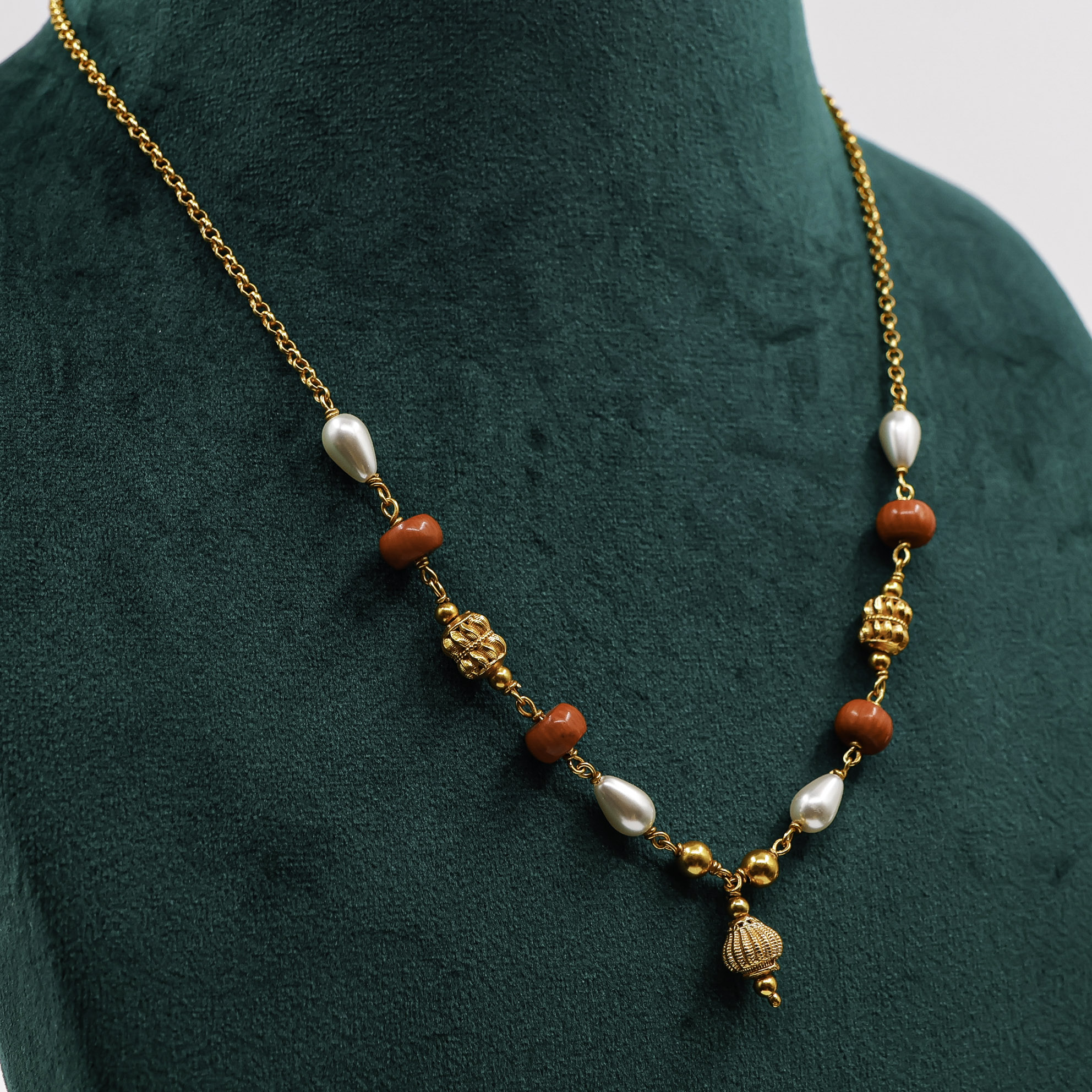 Classic beaded Gold Polished Silver necklace featuring green and pearl beads, suitable for traditional and festive occasions. Buy Beaded Gold Polished Silver Necklace from Raag Silver Jewellery in Hyderabad.
