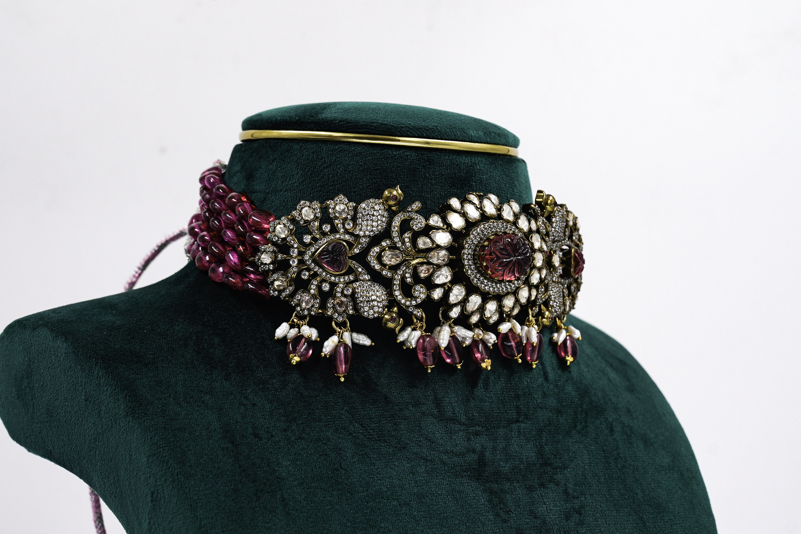 Intricate silver choker necklace with gemstone accents, perfect for weddings and special occasions. Buy silver choker necklace from Raag Silver Jewellery in Hyderabad.
