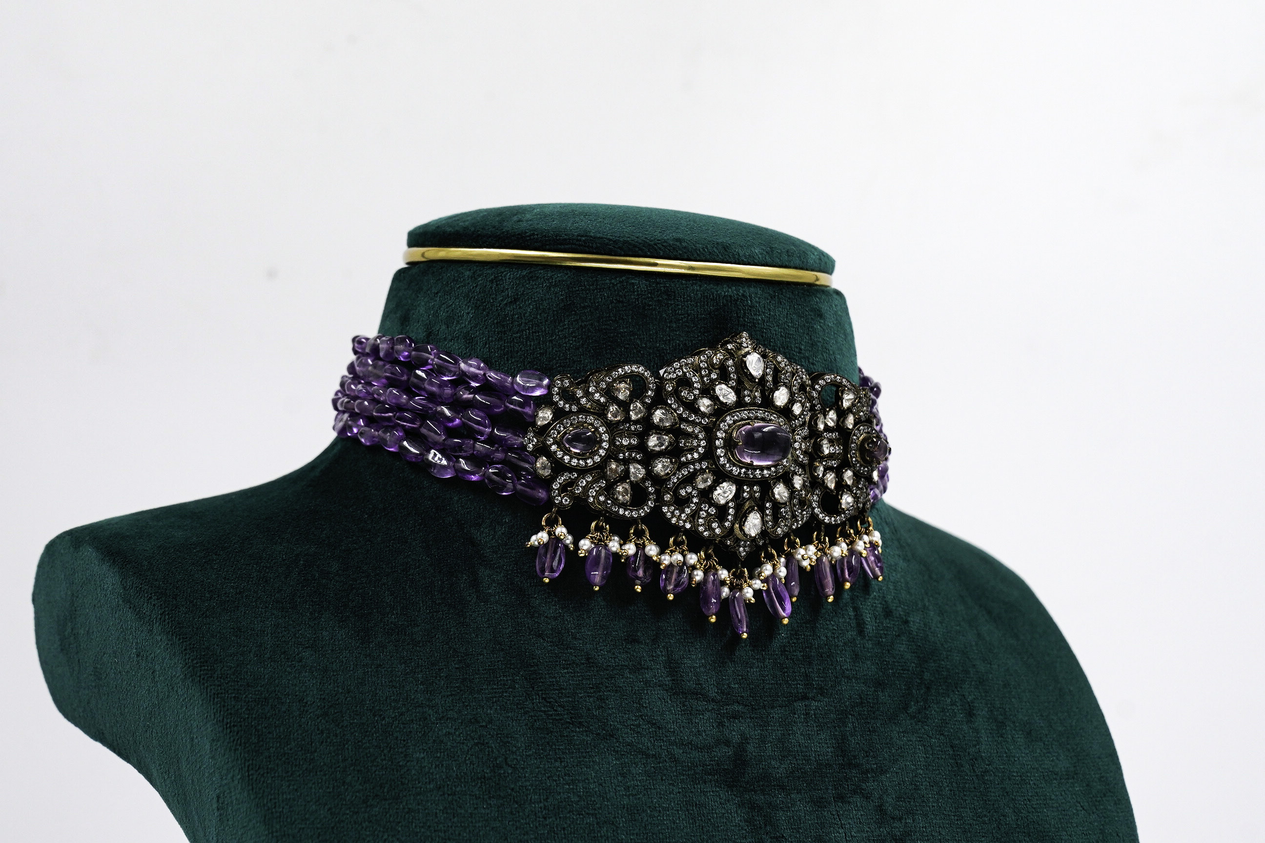 Exquisite amethyst choker necklace with silver accents, perfect for adding elegance to any outfit. Buy amethyst silver choker from Raag Silver Jewellery in Hyderabad.