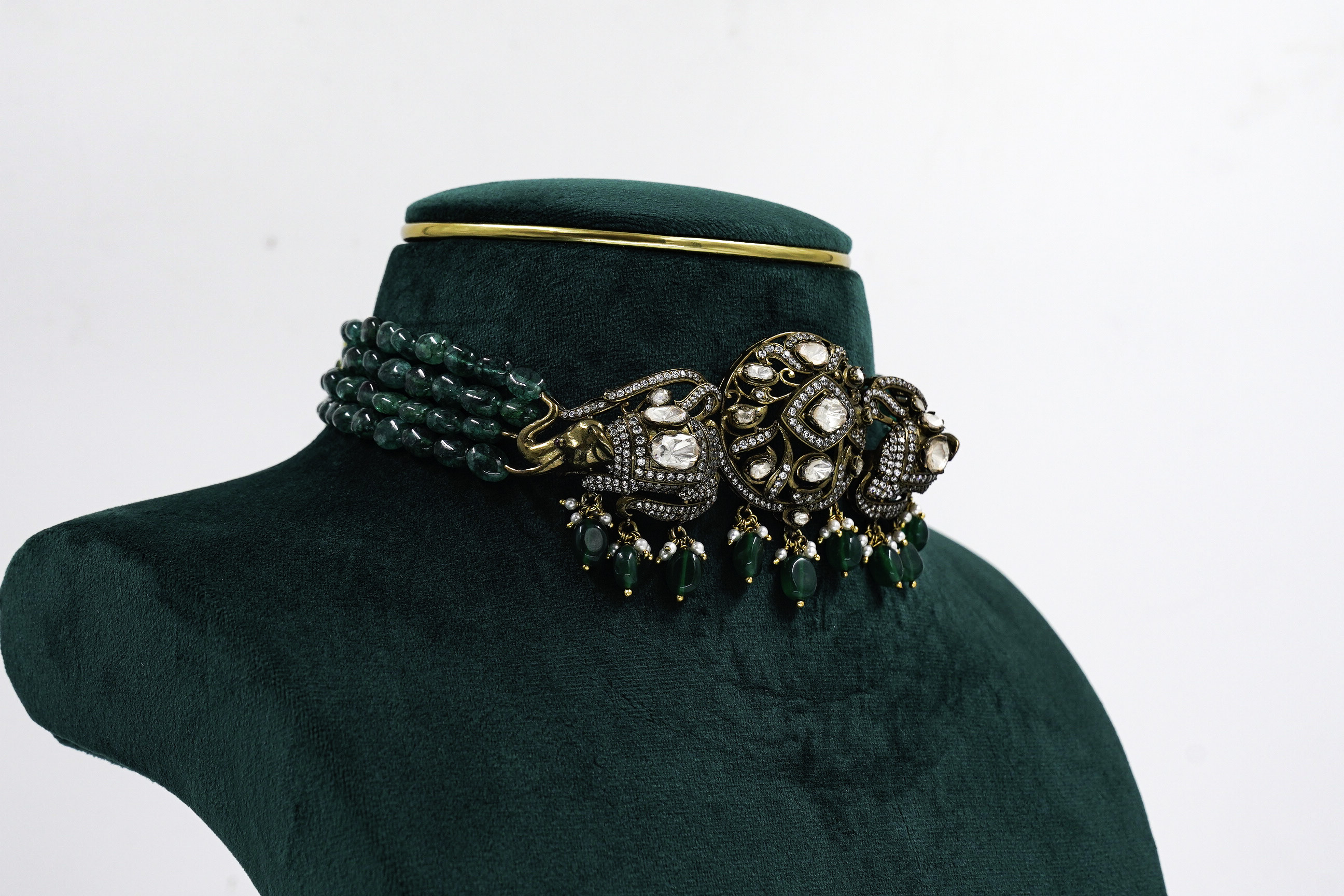 Elegant emerald beaded necklace with antique design, perfect for weddings and special occasions. Buy emerald beaded necklace from Raag Silver Jewellery in Hyderabad.