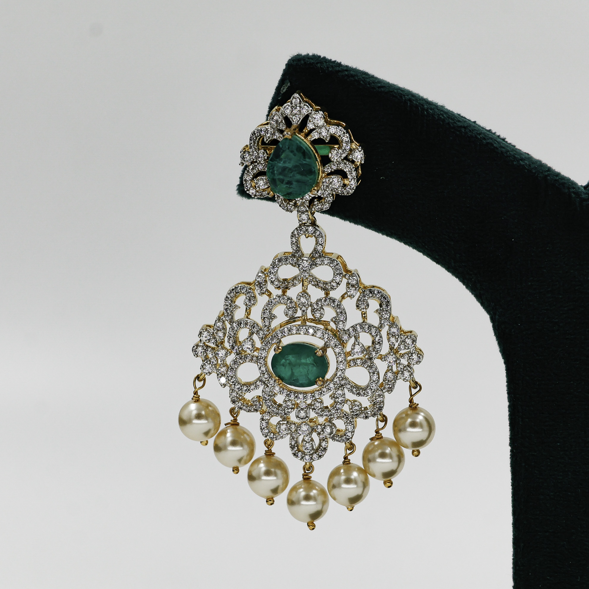 Intricate Gold Polished Silver dangle earrings with pearl and gemstone accents, perfect for weddings and festive occasions. Buy Gold Polished Silver Dangle Earrings from Raag Silver Jewellery in Hyderabad.