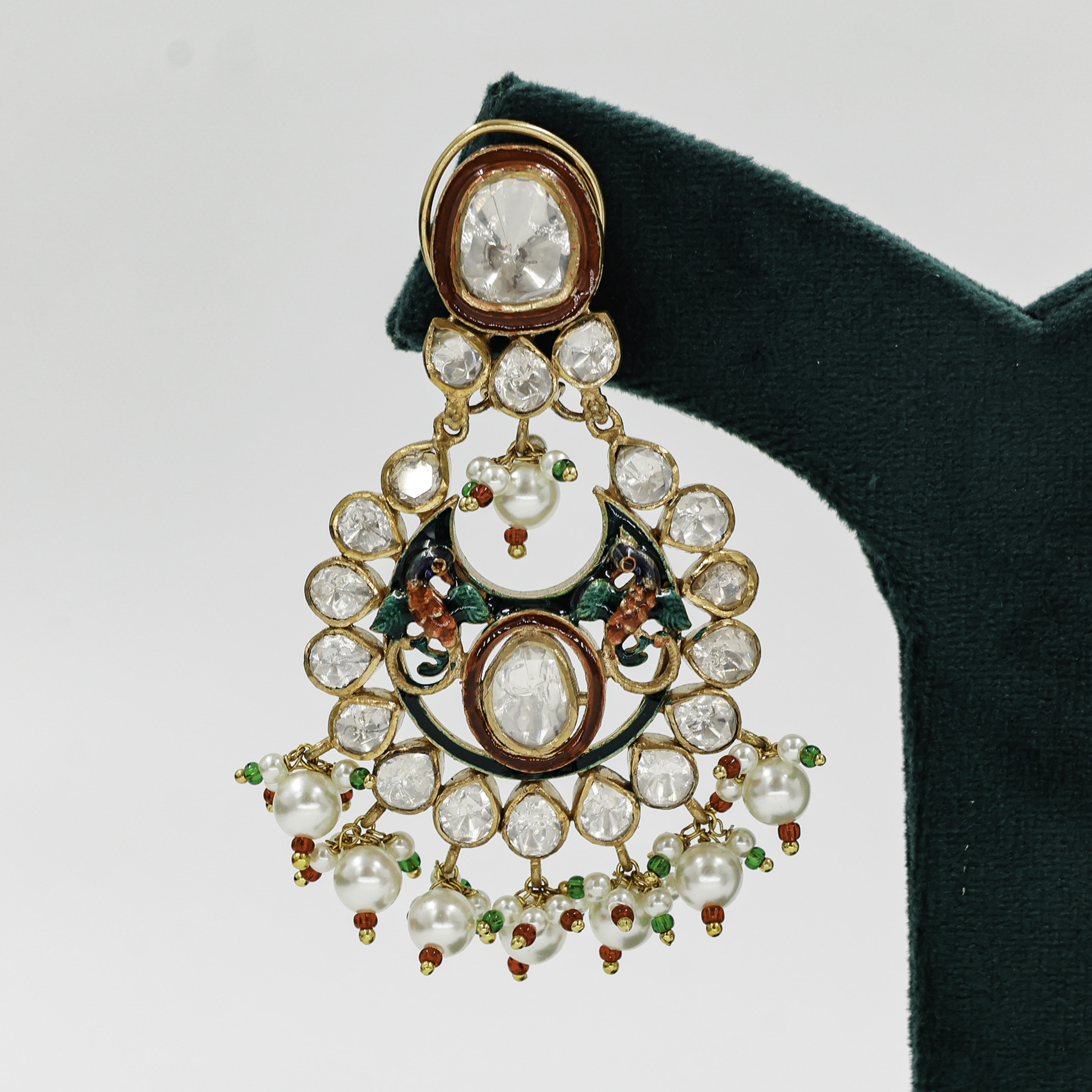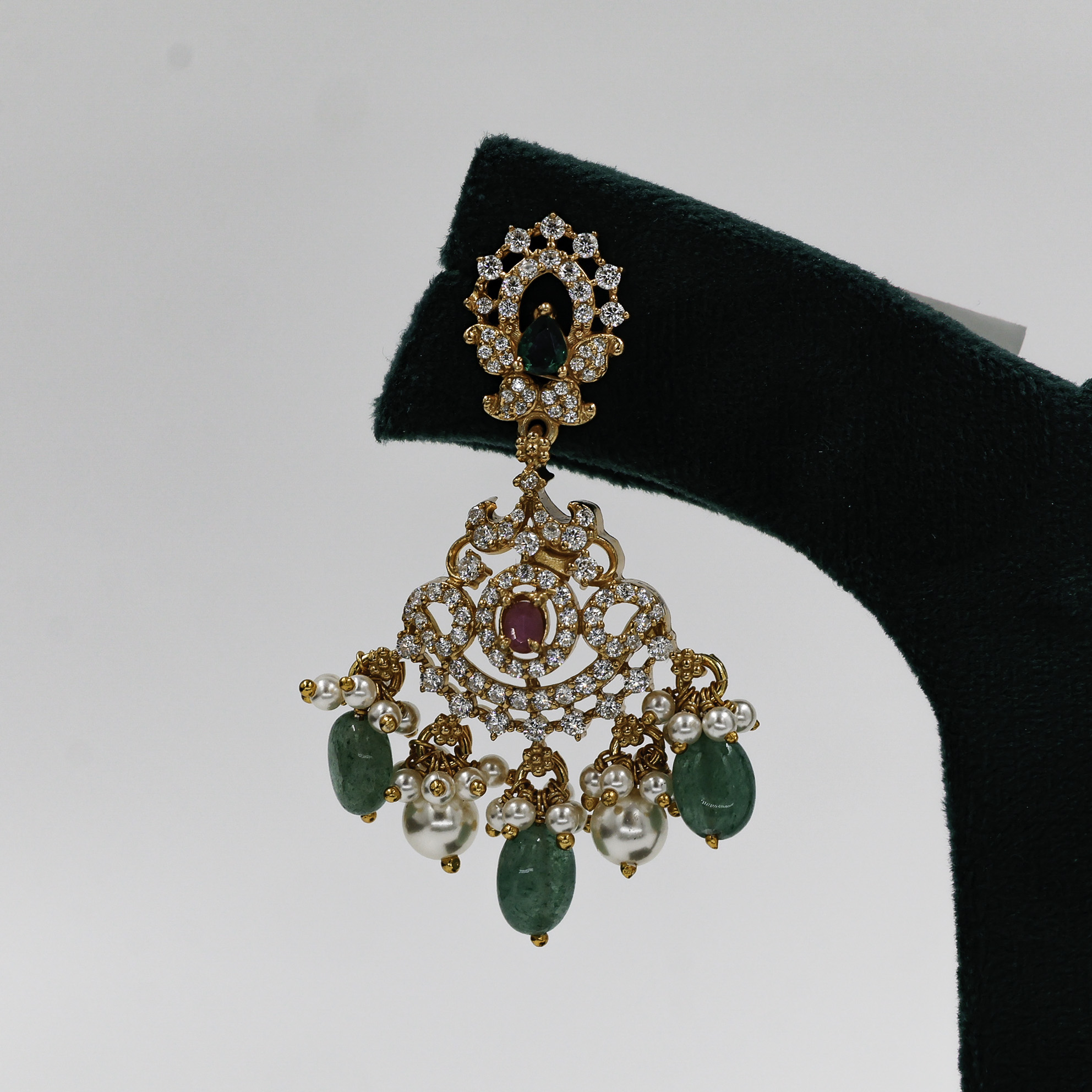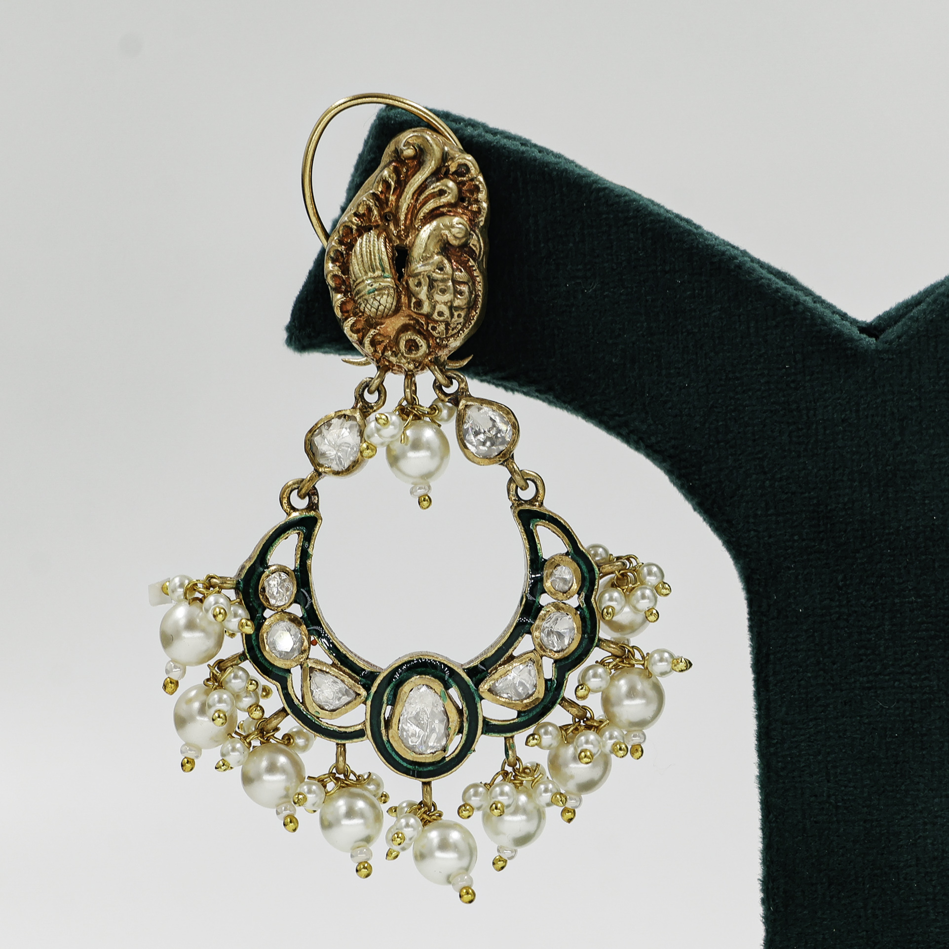 Stunning Gold Polished Silver earrings adorned with emeralds and pearls, perfect for weddings and festive occasions. Buy Gold Polished Silver Emerald Earrings from Raag Silver Jewellery in Hyderabad.