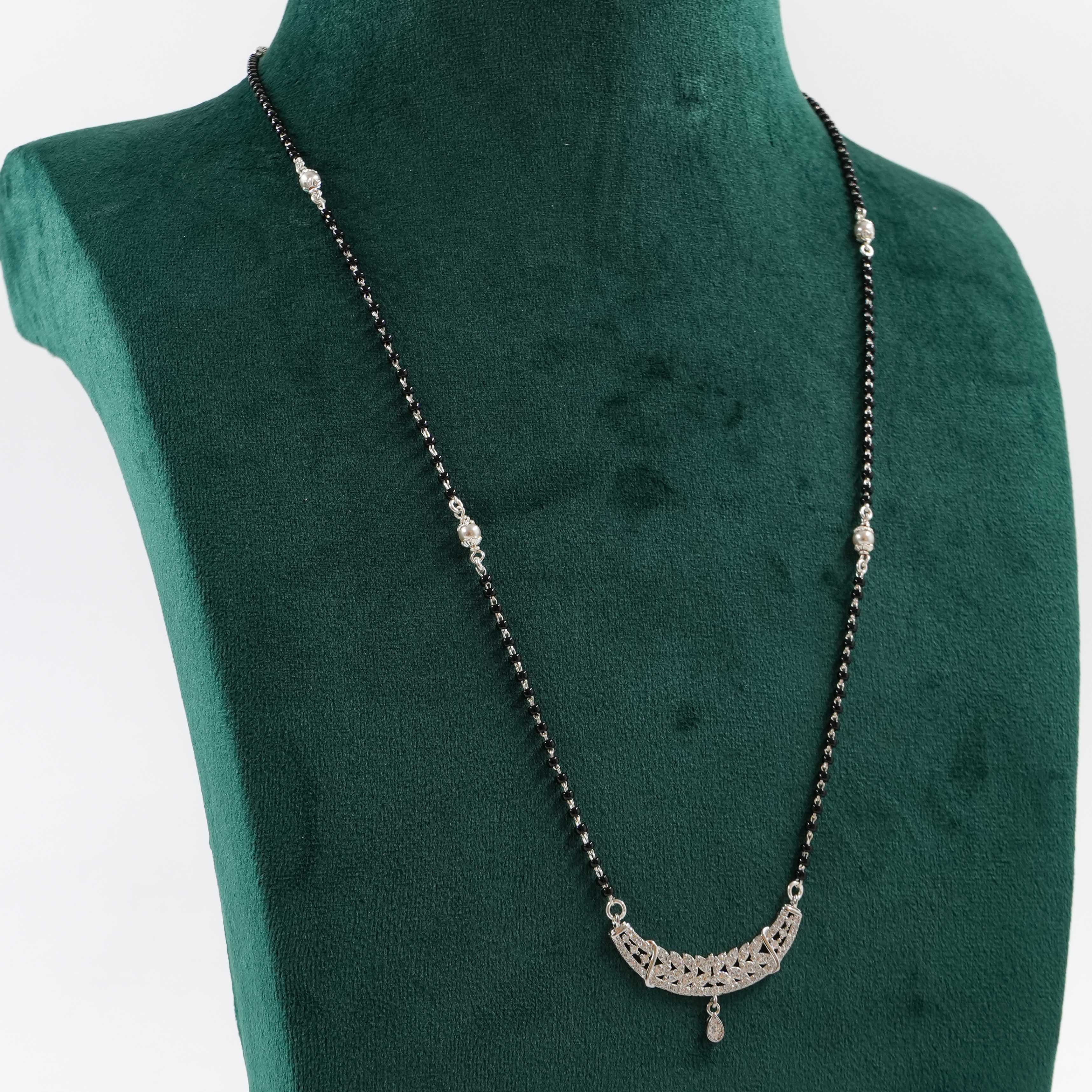 Elegant silver mangalsutra necklace with a delicate pendant, perfect for daily wear or special occasions. Buy Silver Mangalsutra Necklace from Raag Silver Jewellery in Hyderabad.