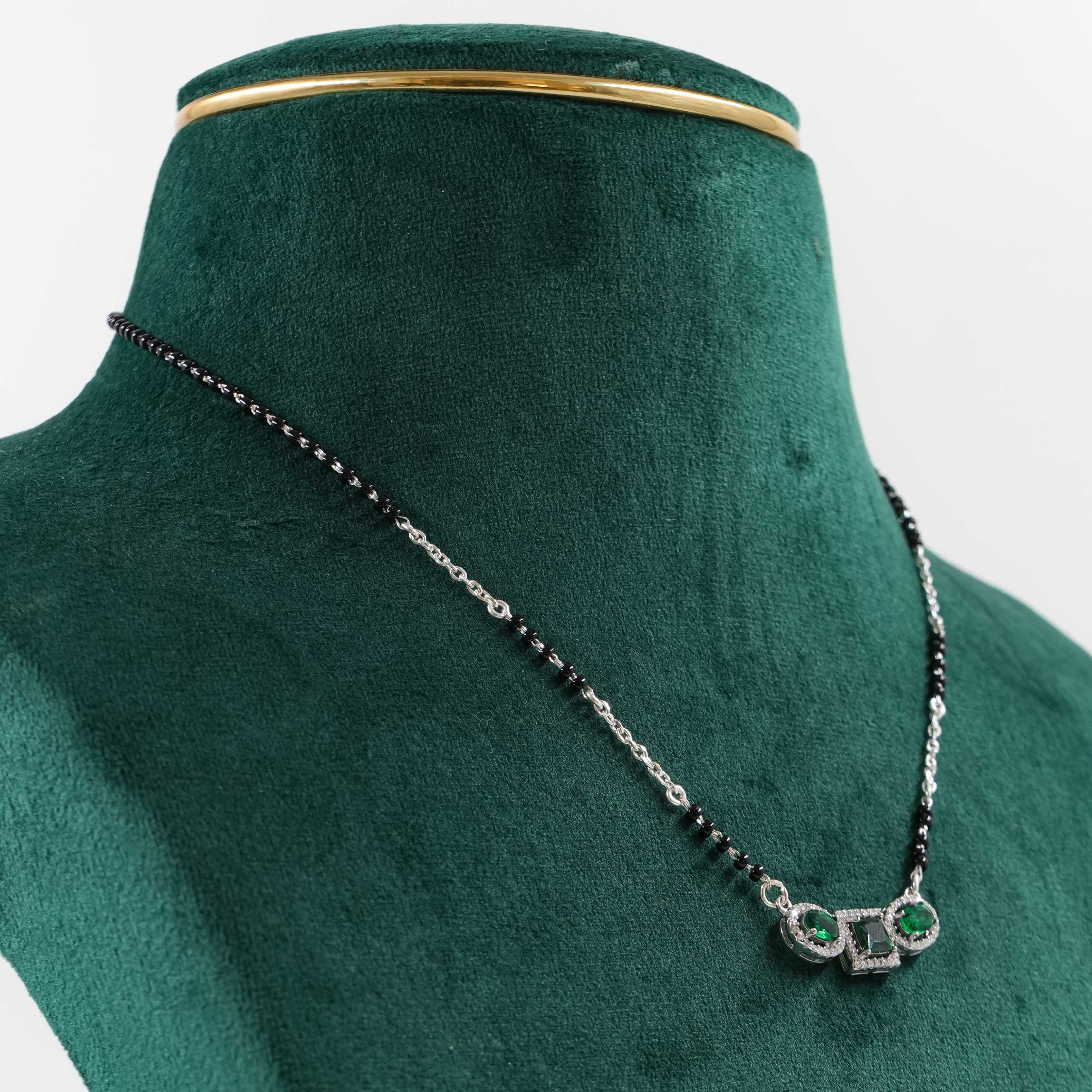 Elegant pendant necklace with emerald stones and silver chain, perfect for parties and special occasions. Buy emerald pendant necklace from Raag Silver Jewellery in Hyderabad.