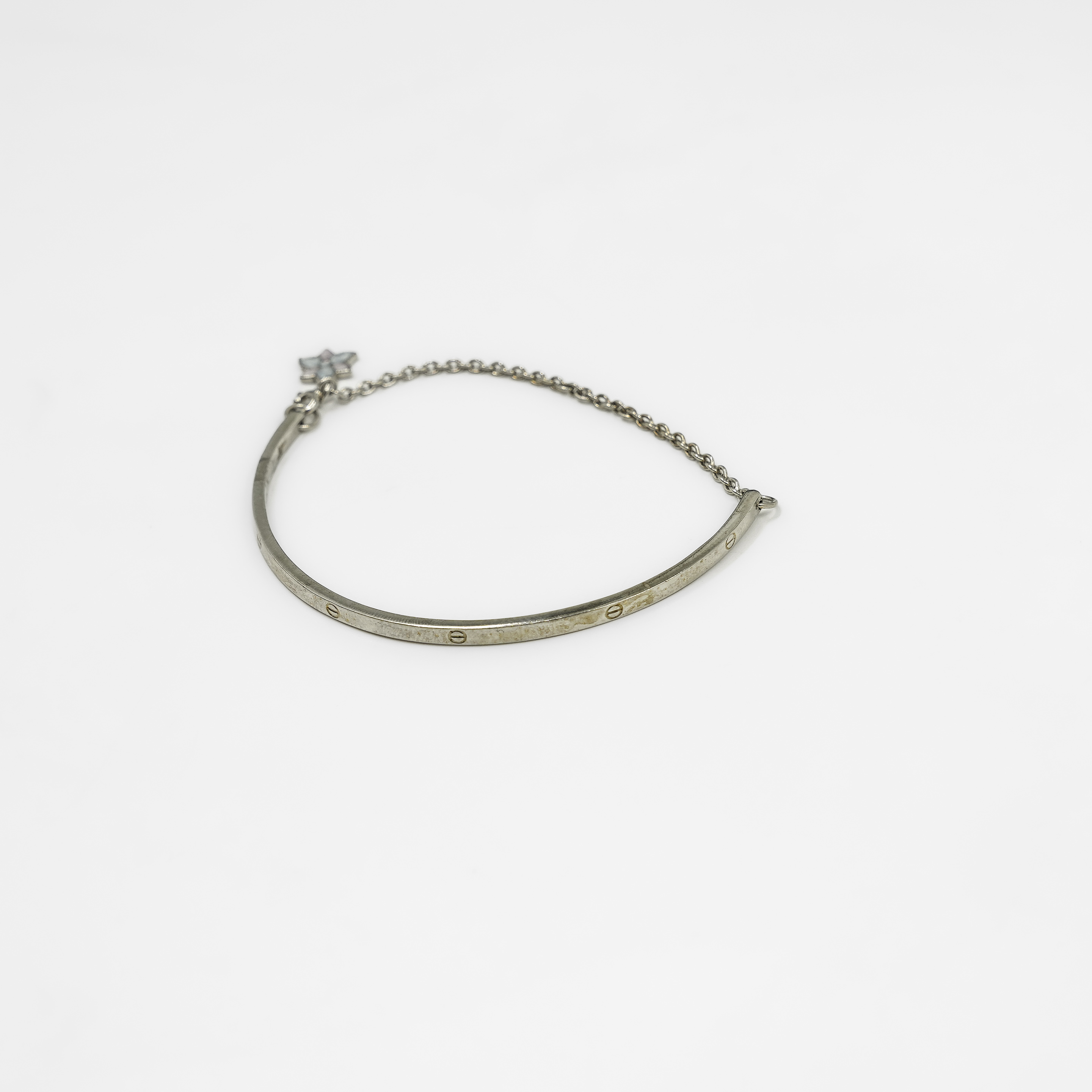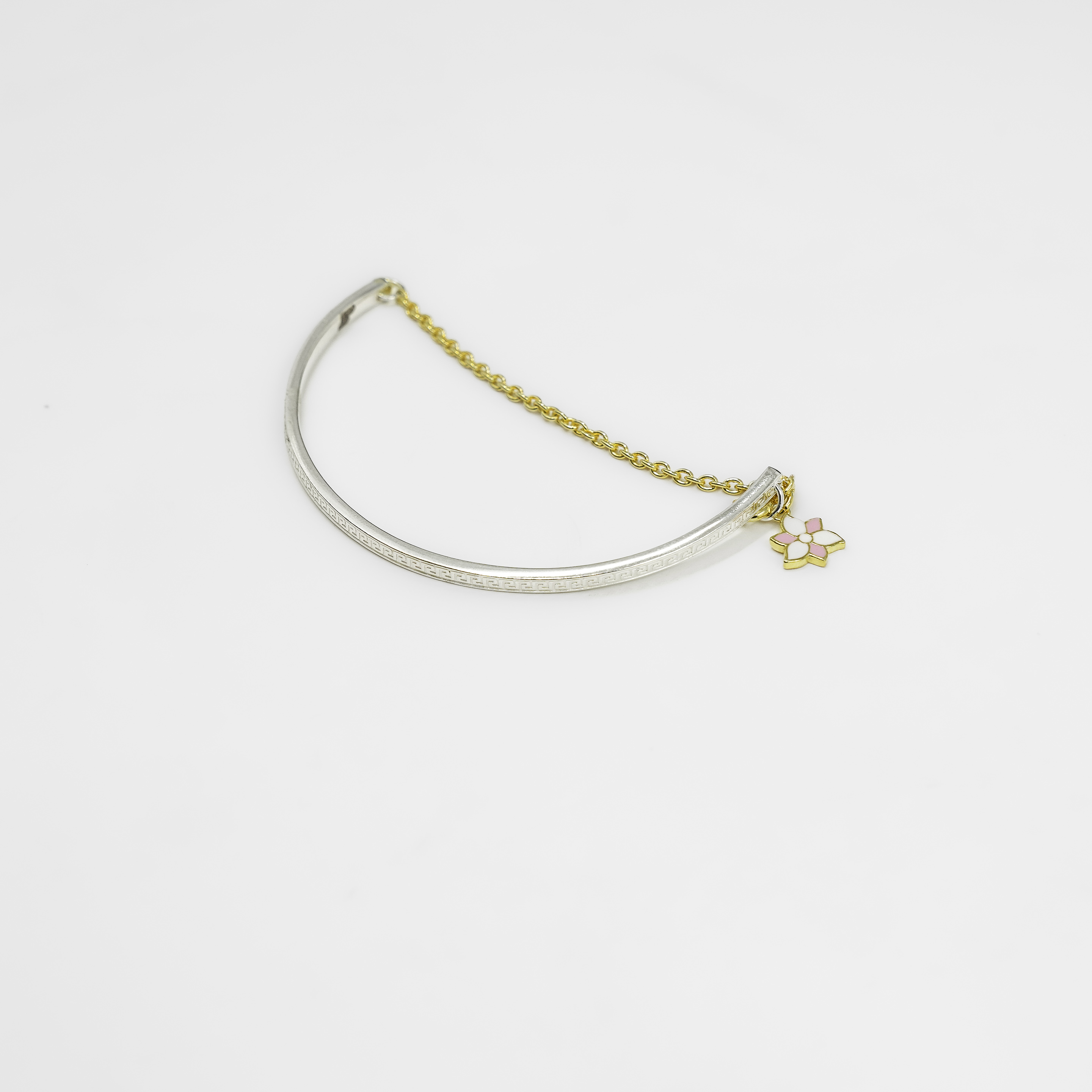 Classic silver bangle bracelet with a chain and flower charm, suitable for everyday wear. Buy silver bangle bracelet from Raag Silver Jewellery in Hyderabad.