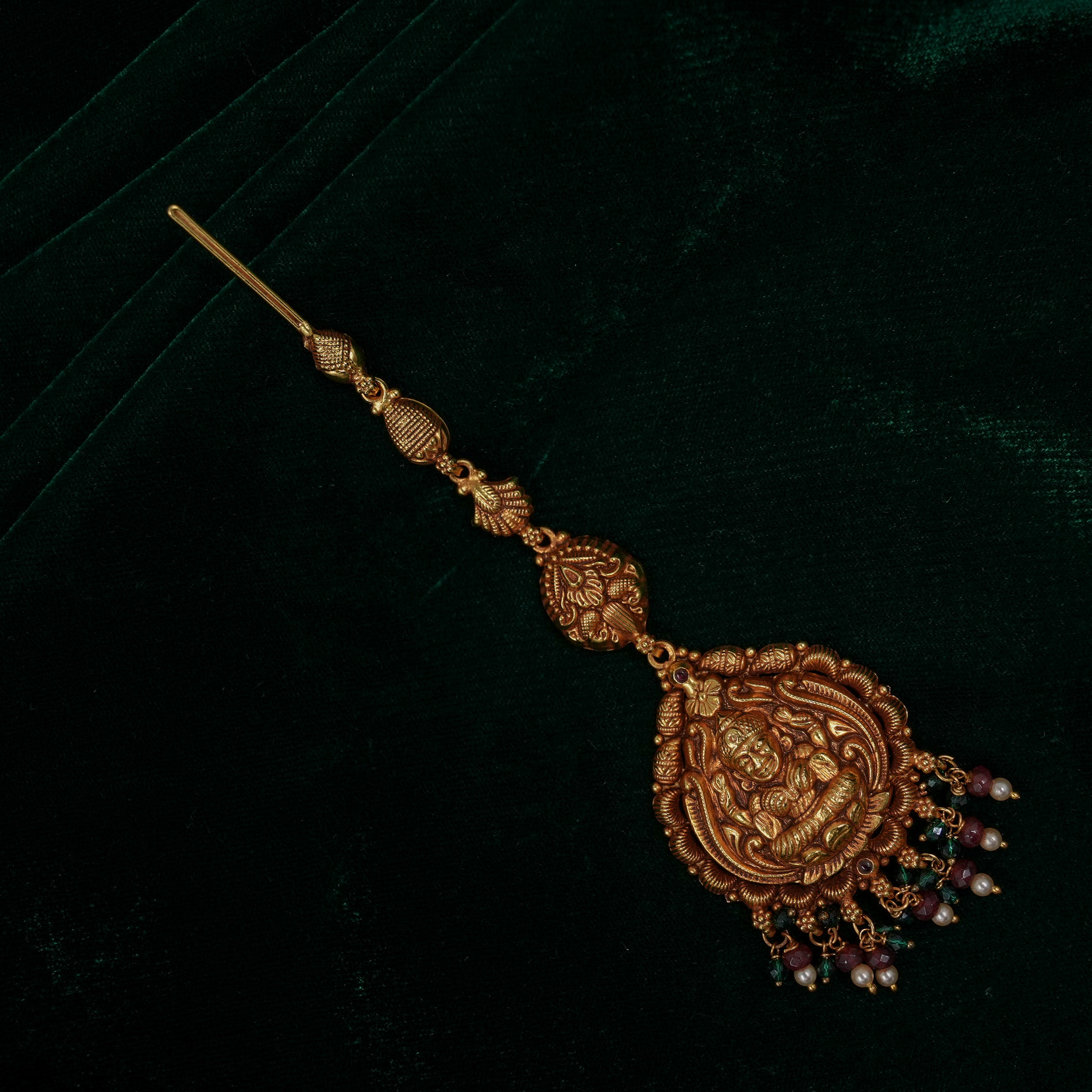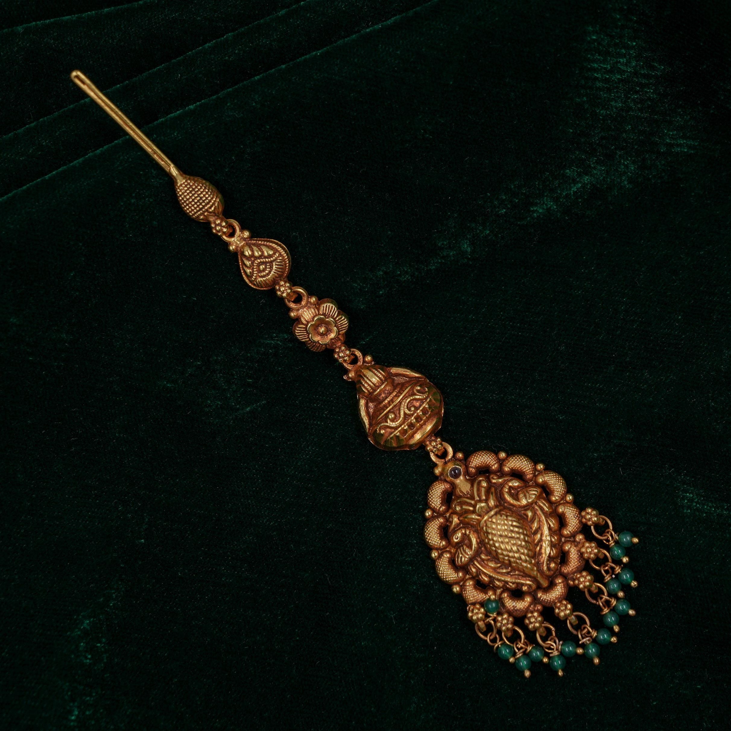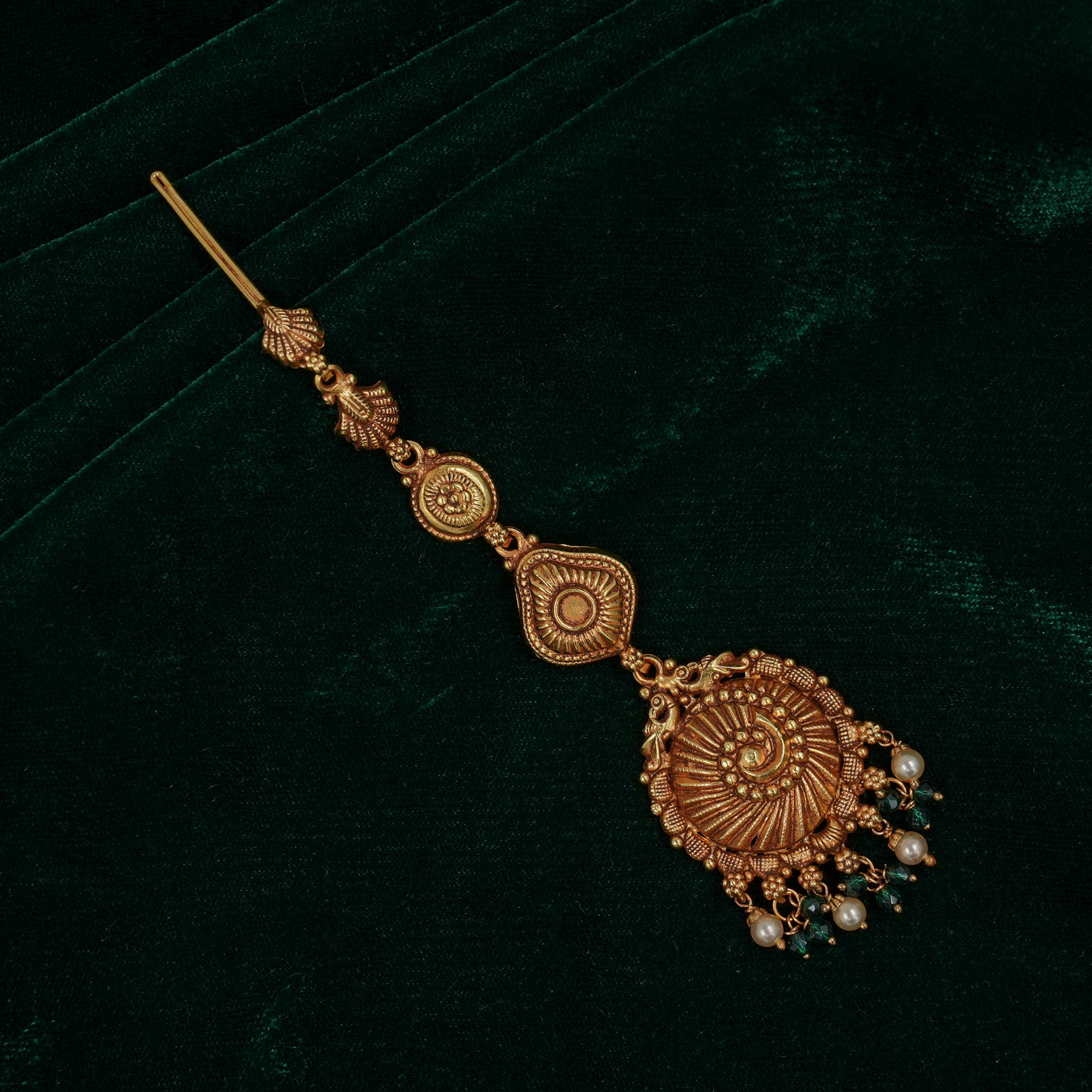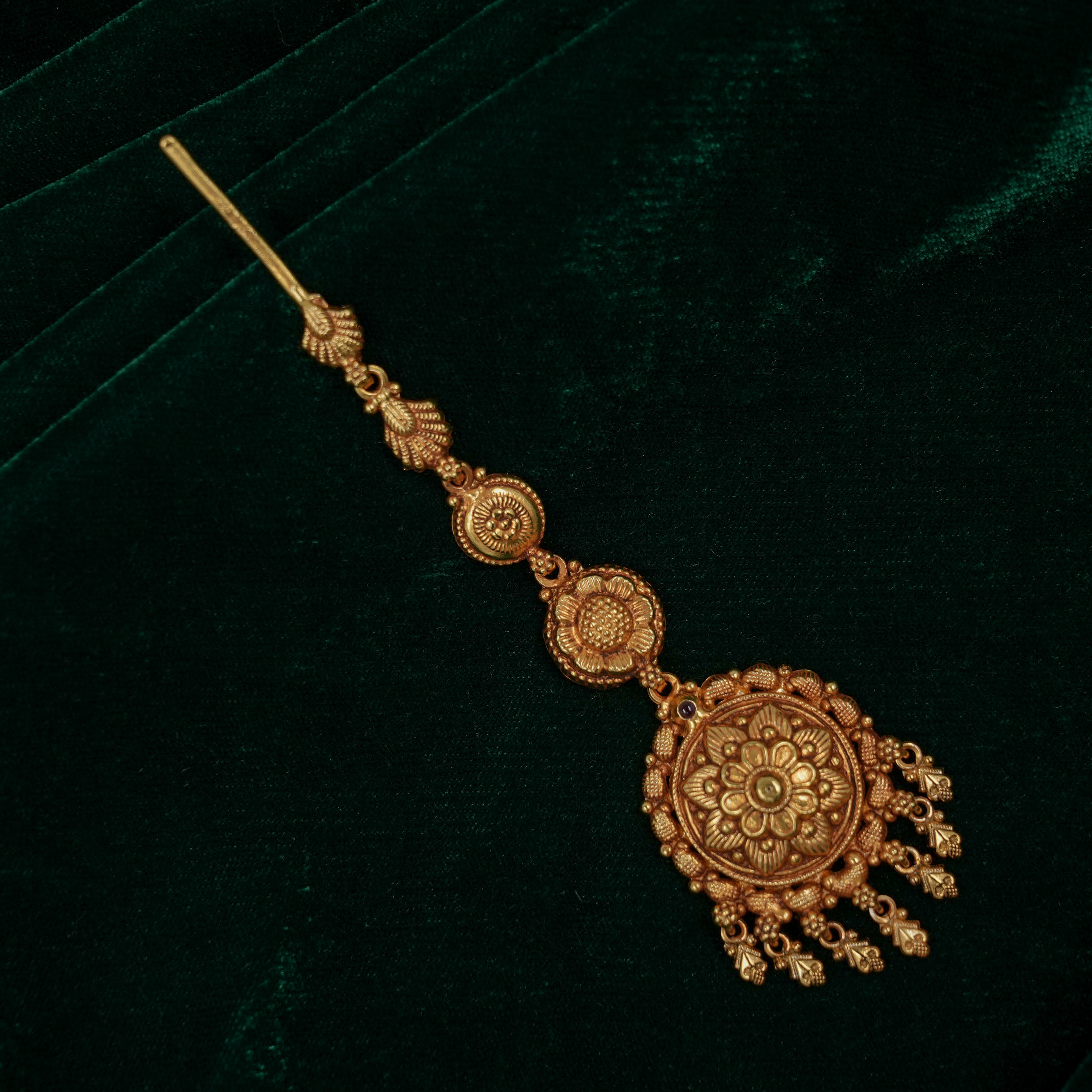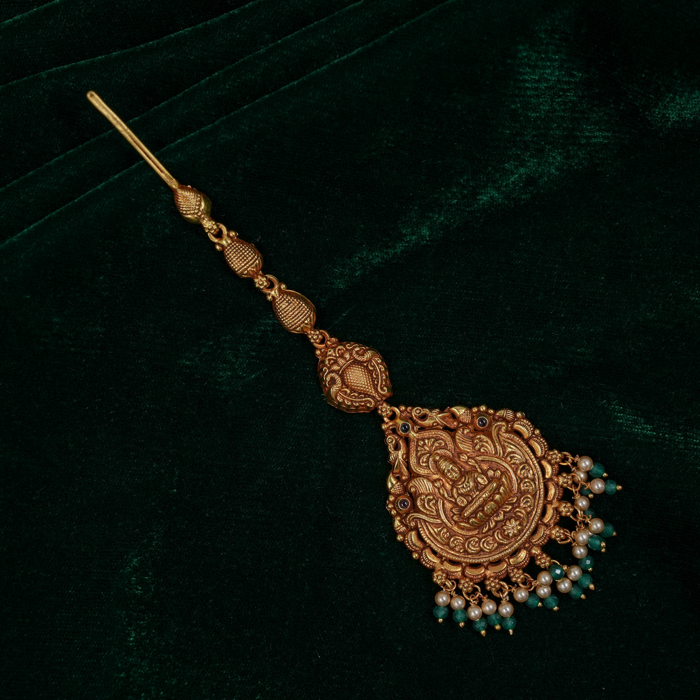 Antique gold maang tikka with intricate detailing, perfect for weddings and traditional occasions. Buy gold maang tikka from Raag Silver Jewellery in Hyderabad.