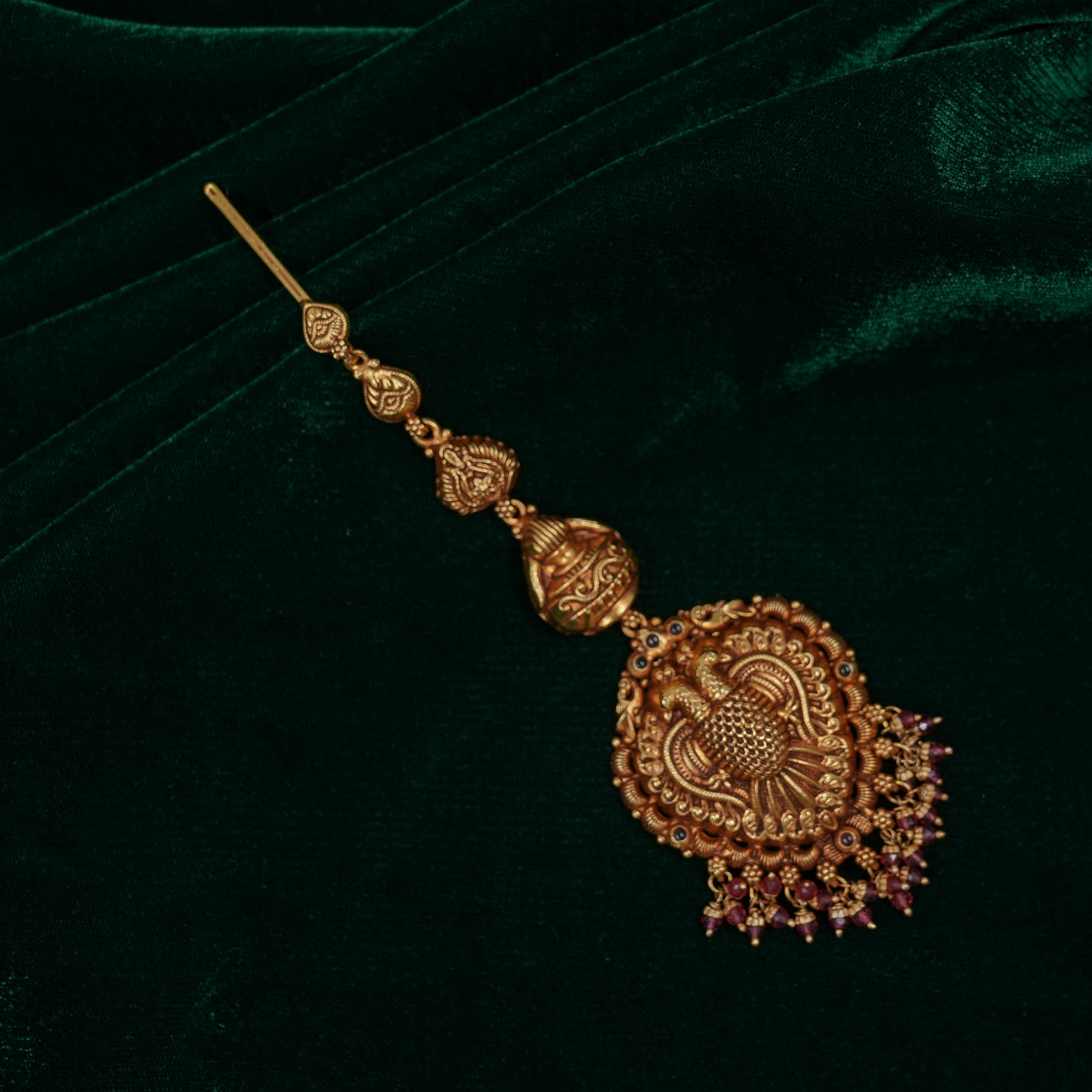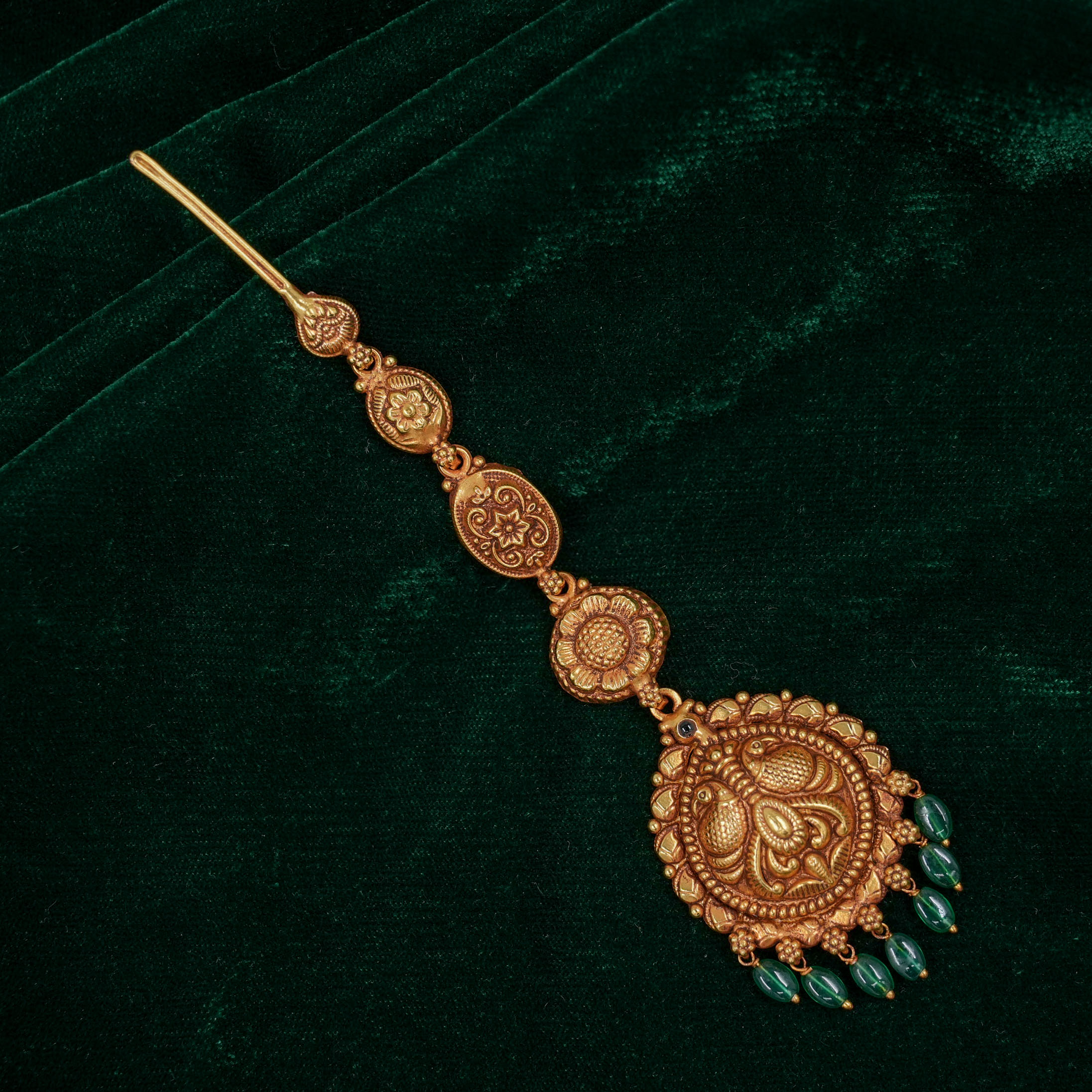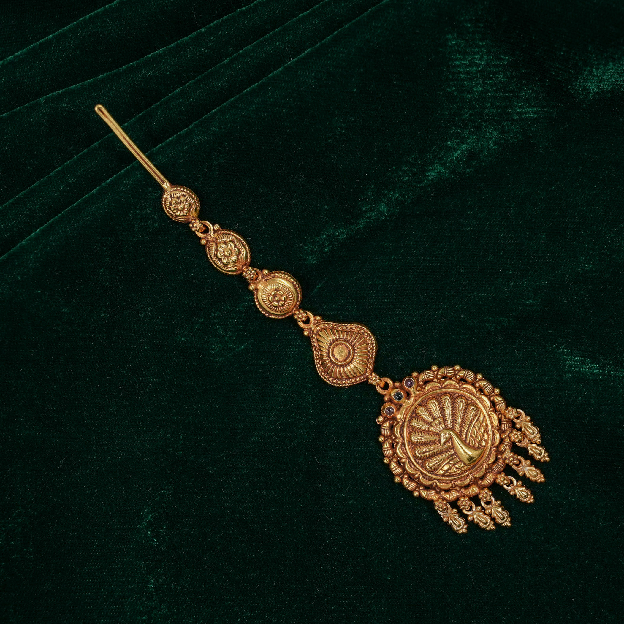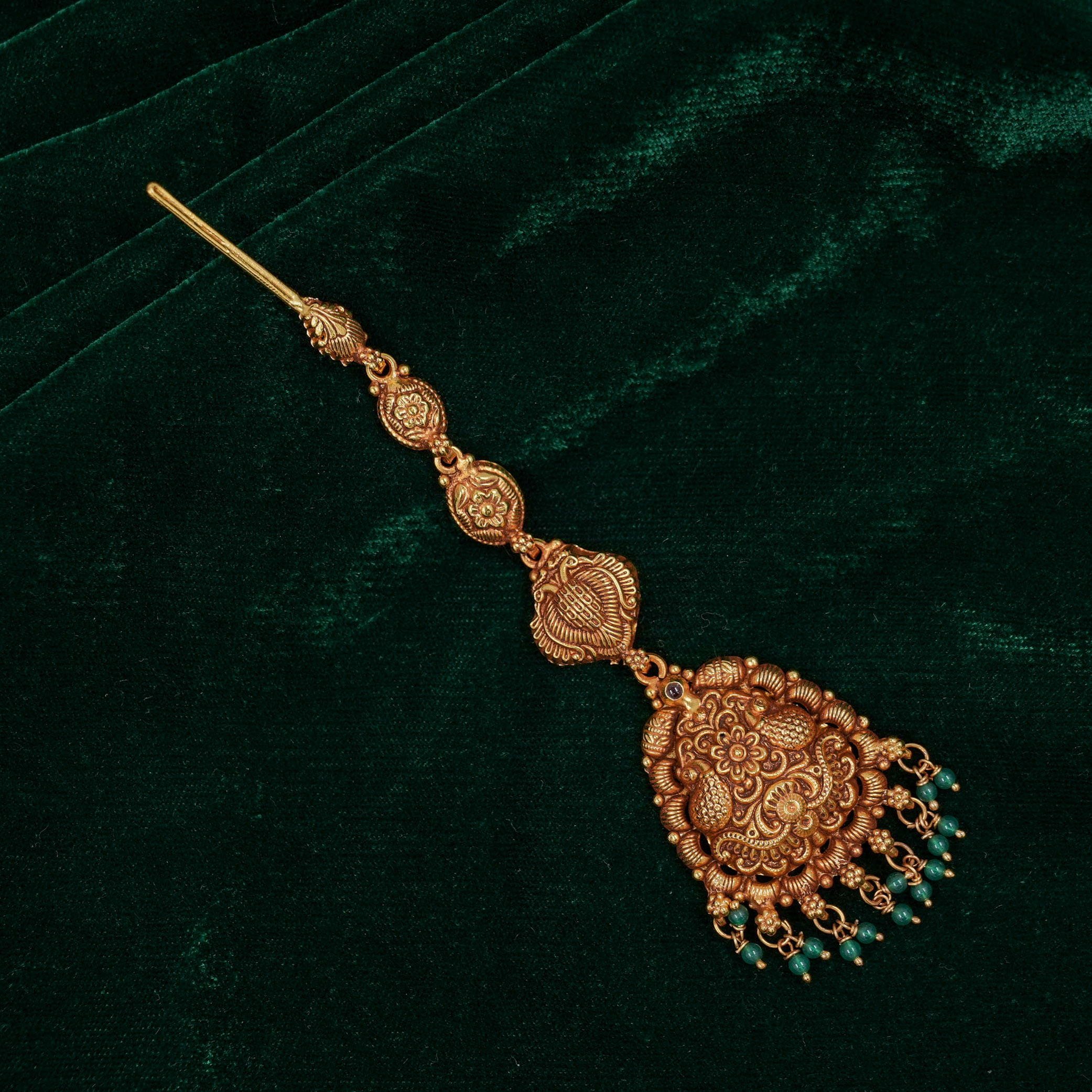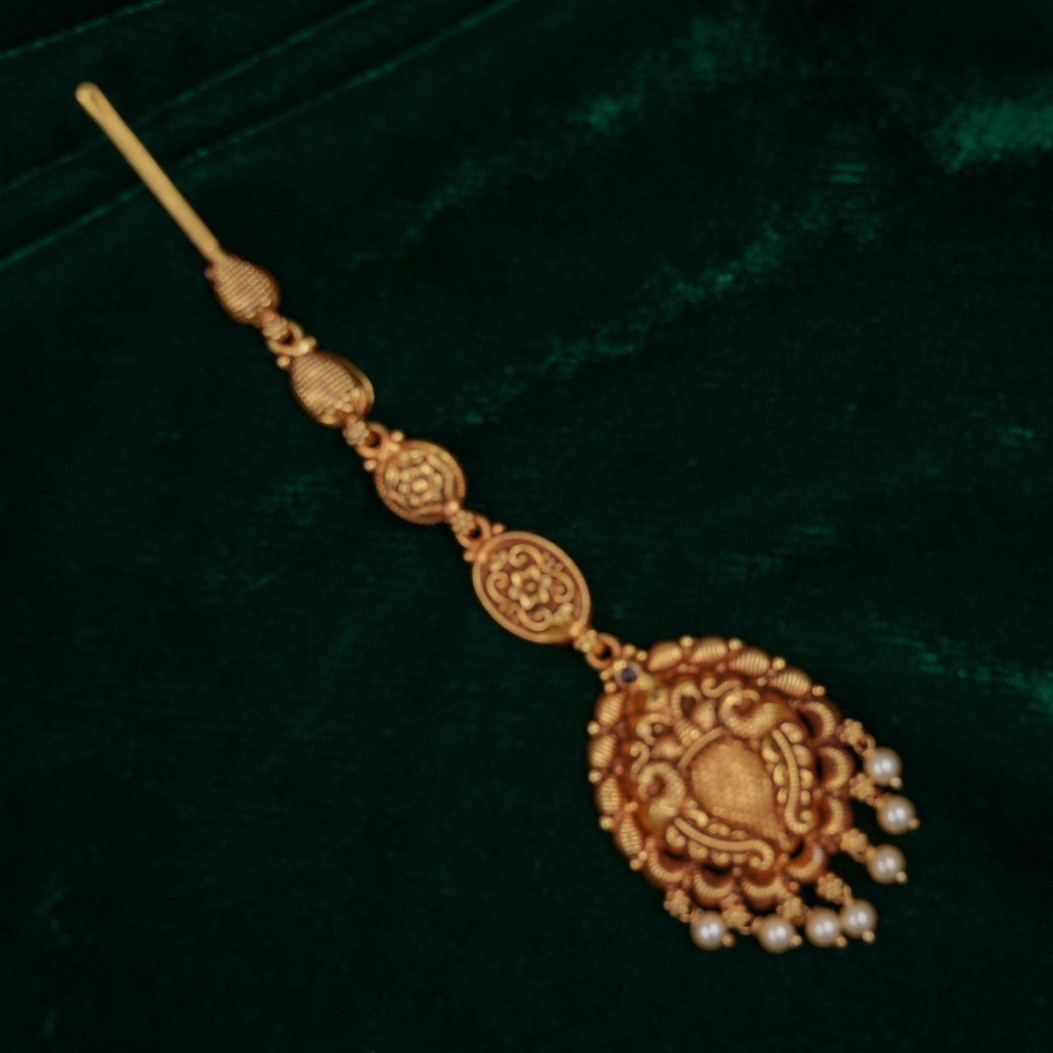 Antique gold maang tikka with intricate detailing, perfect for weddings and traditional occasions. Buy gold maang tikka from Raag Silver Jewellery in Hyderabad.