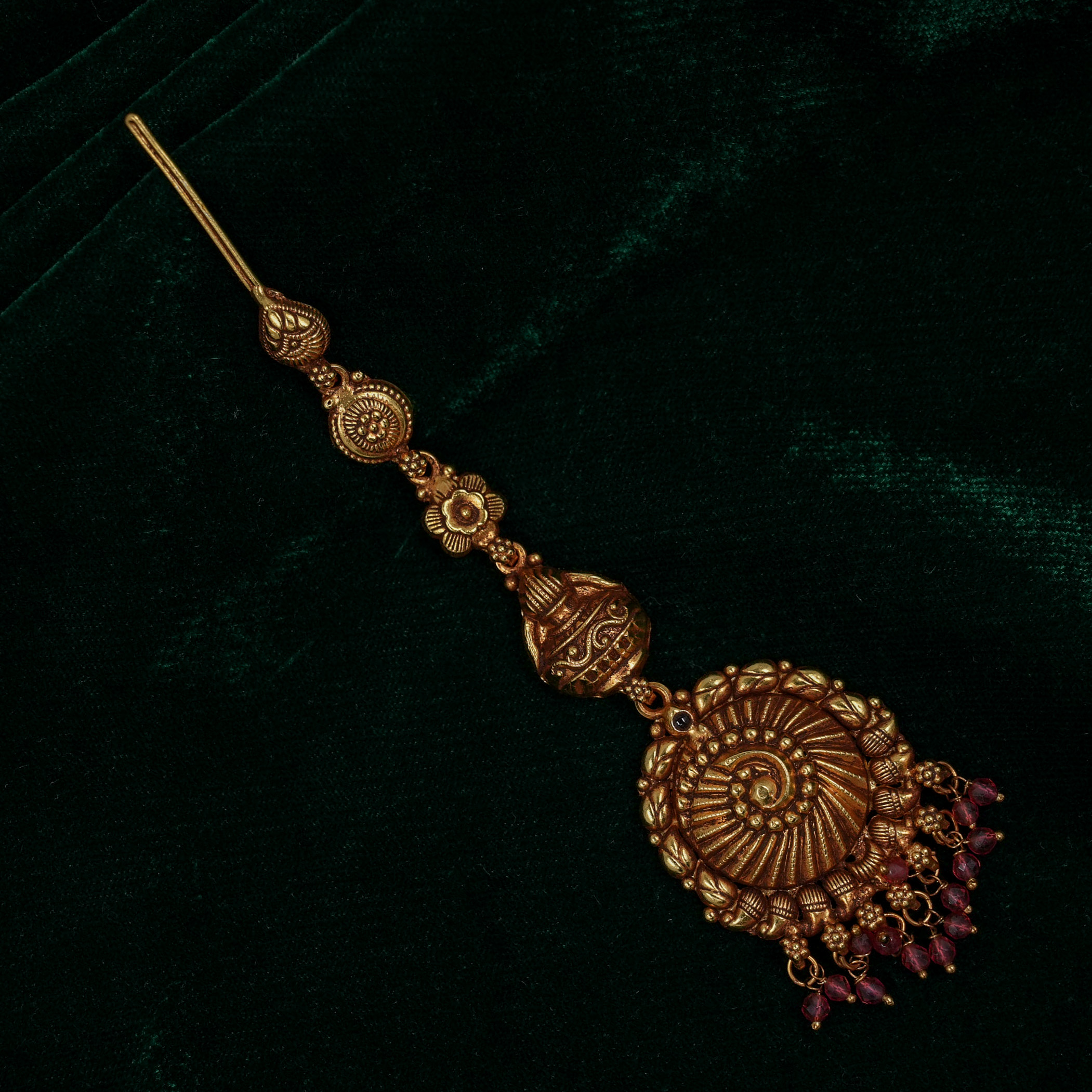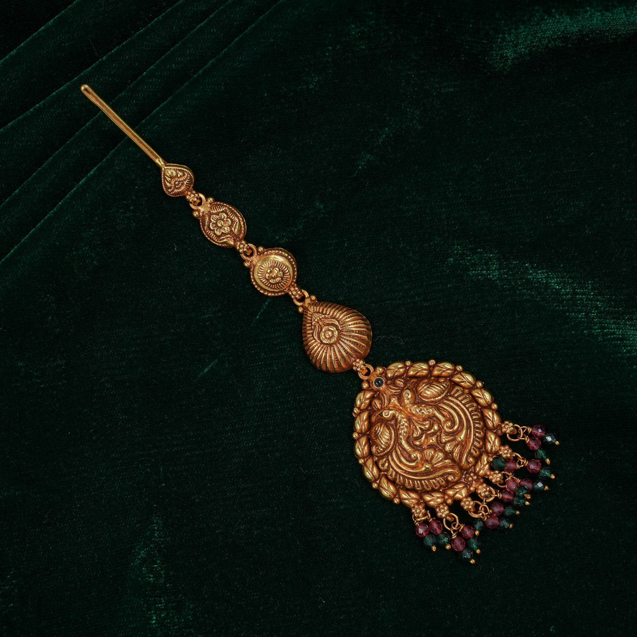 Antique gold plated maang tikka with intricate design, perfect for traditional occasions. Buy Gold Maang Tikka from Raag Silver Jewellery in Hyderabad.