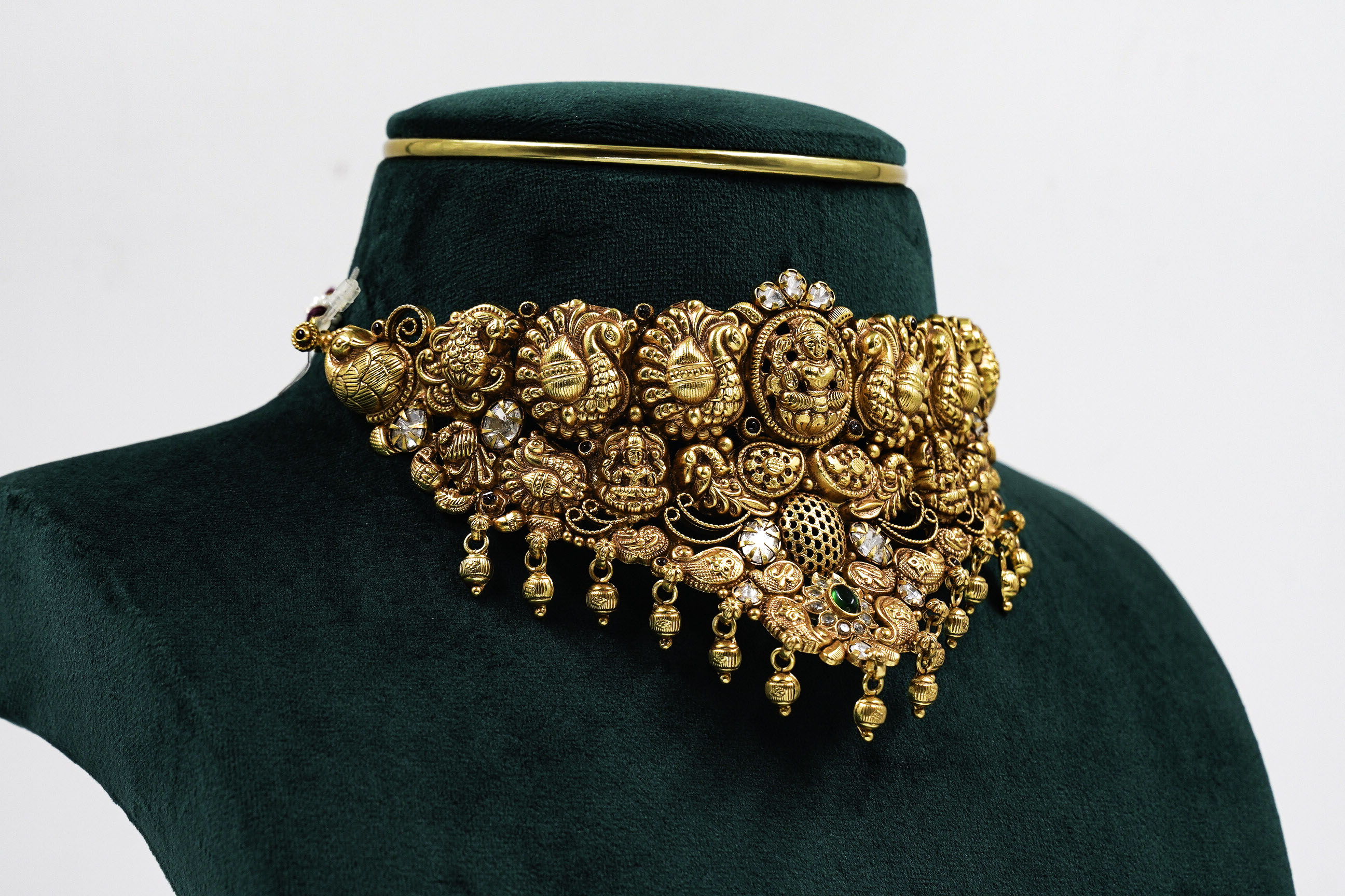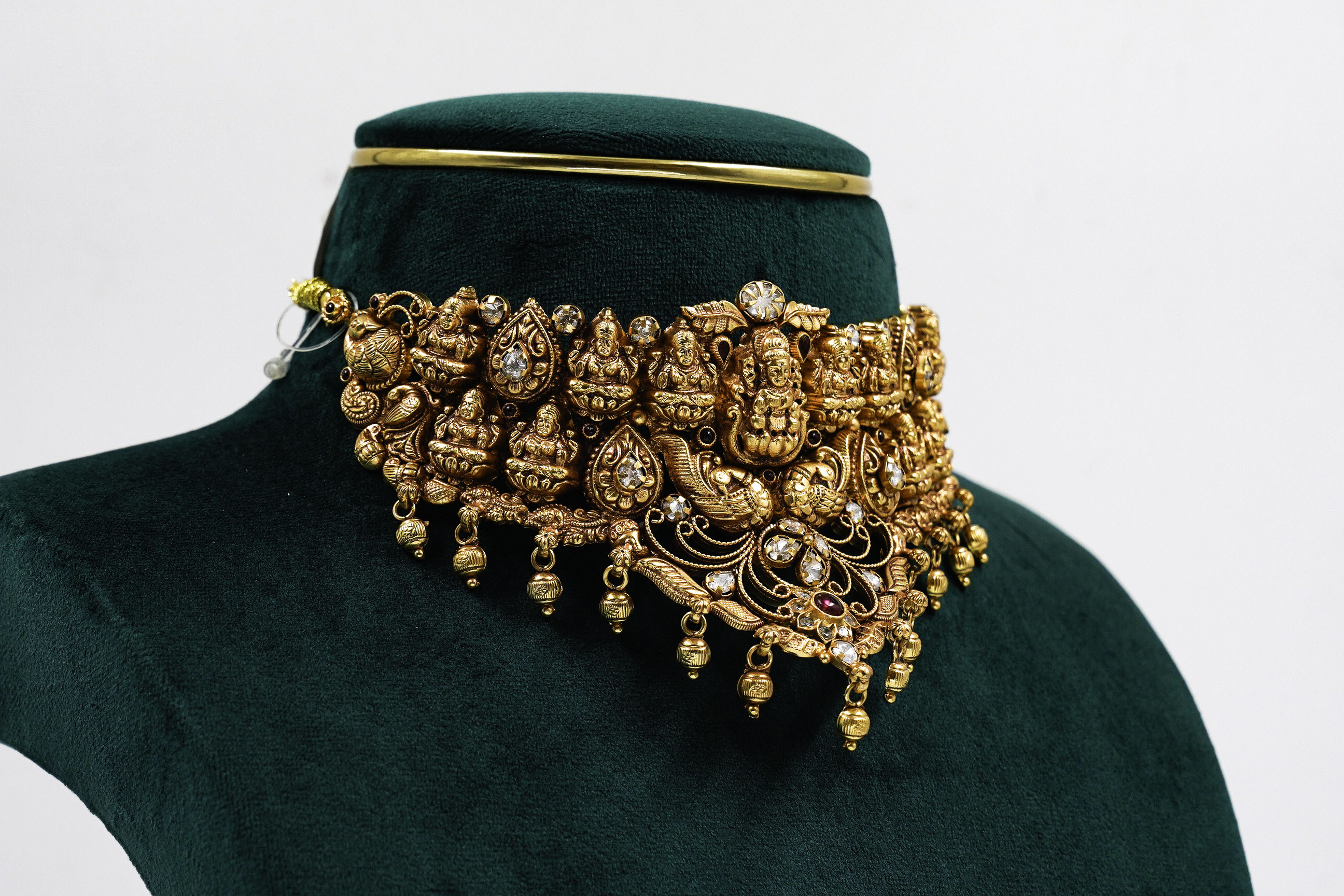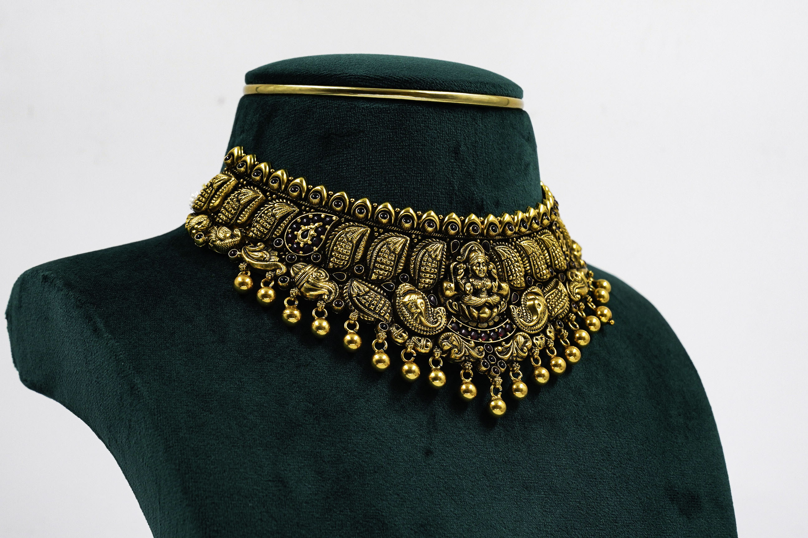 Intricate Gold Polished Silver temple necklace featuring traditional Indian deity designs, perfect for weddings and festive occasions. Buy Gold Polished Silver temple necklace from Raag Silver Jewellery in Hyderabad.