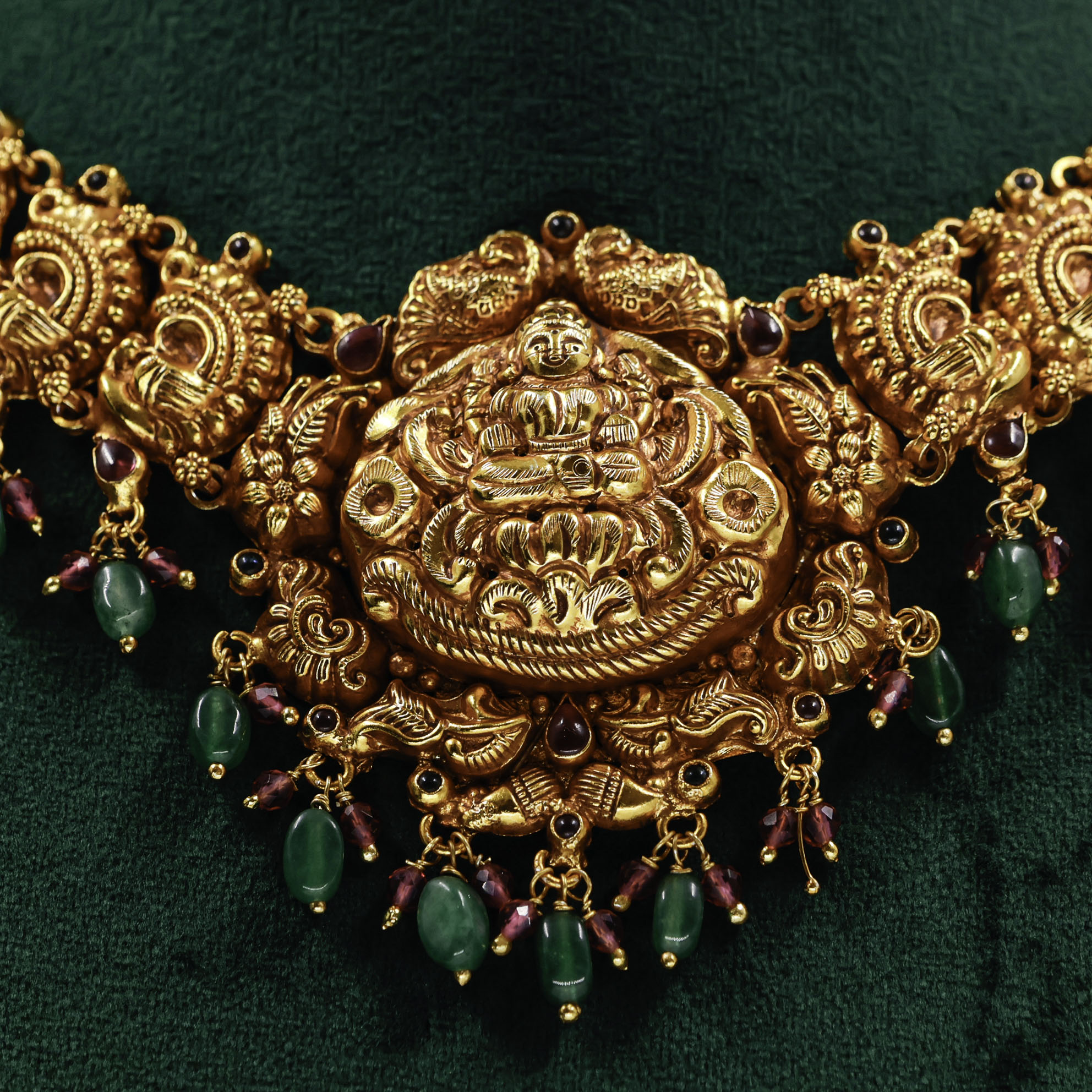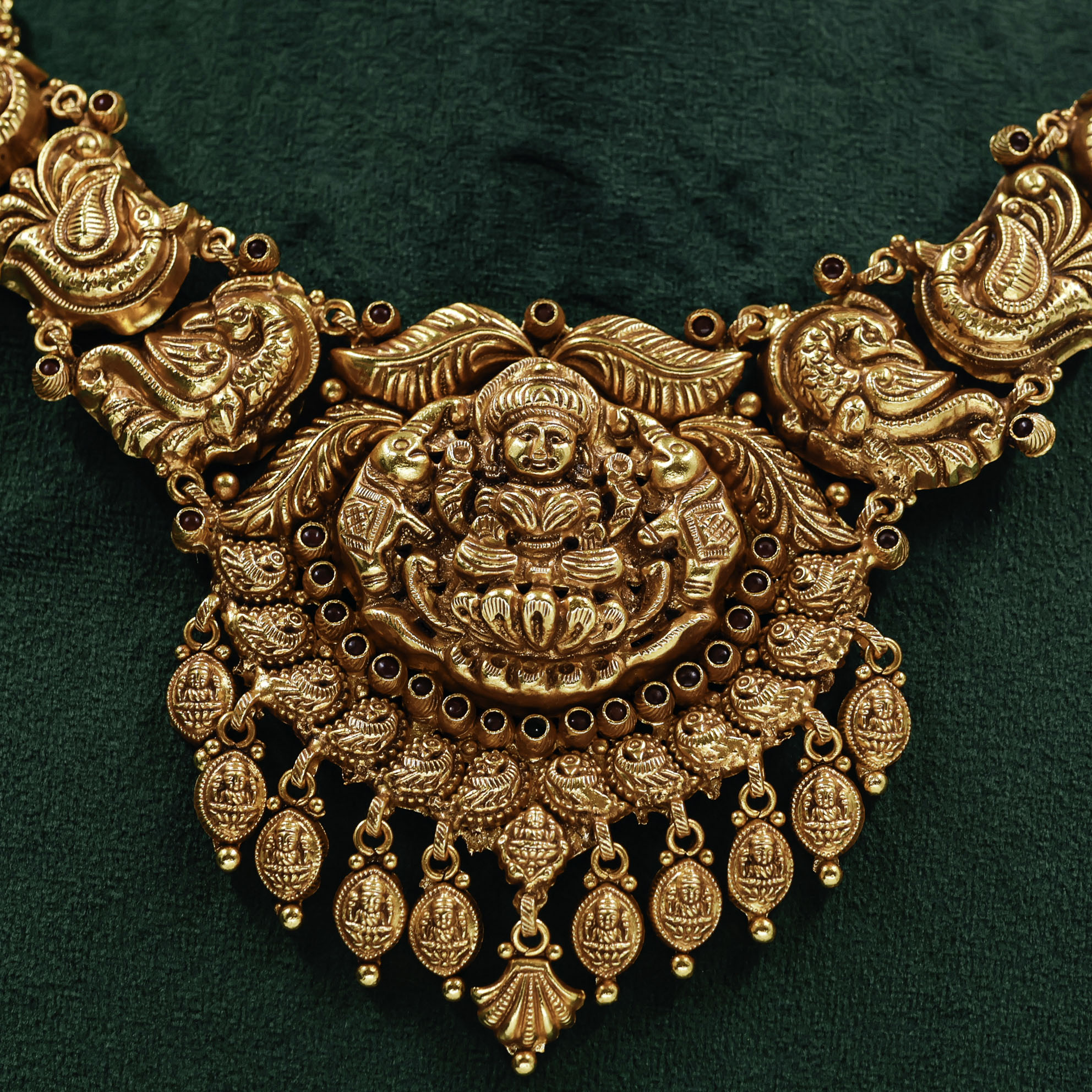 Elegant Gold Polished Silver Lakshmi necklace featuring intricate detailing, perfect for weddings and traditional events. Buy Gold Polished Silver Lakshmi Necklace from Raag Silver Jewellery in Hyderabad.
