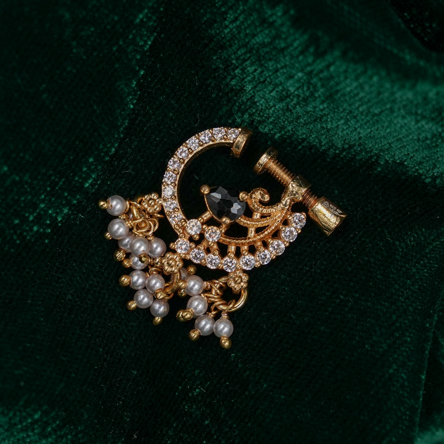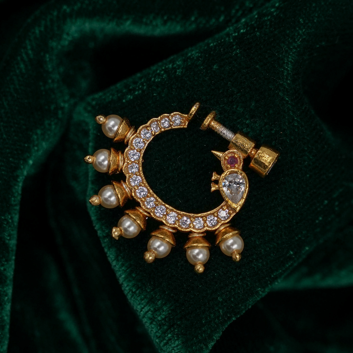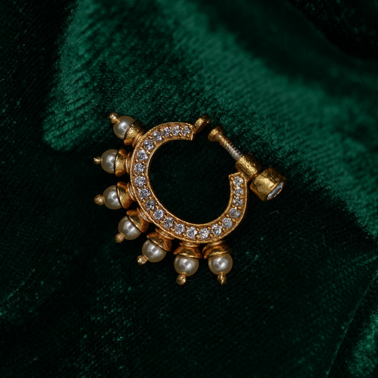 Elegant gold nose ring with intricate detailing, perfect for traditional and festive occasions. Buy gold nose ring from Raag Silver Jewellery in Hyderabad.