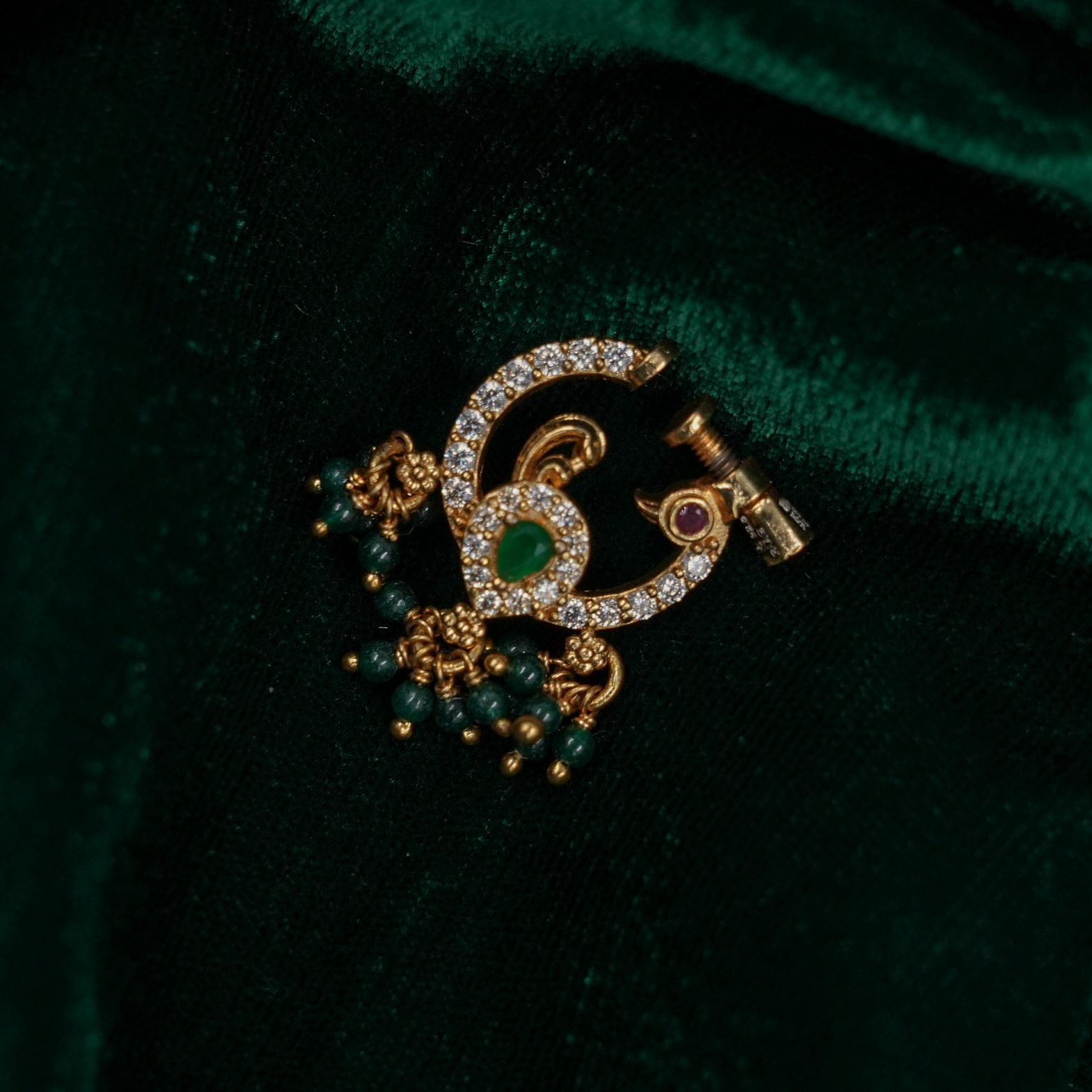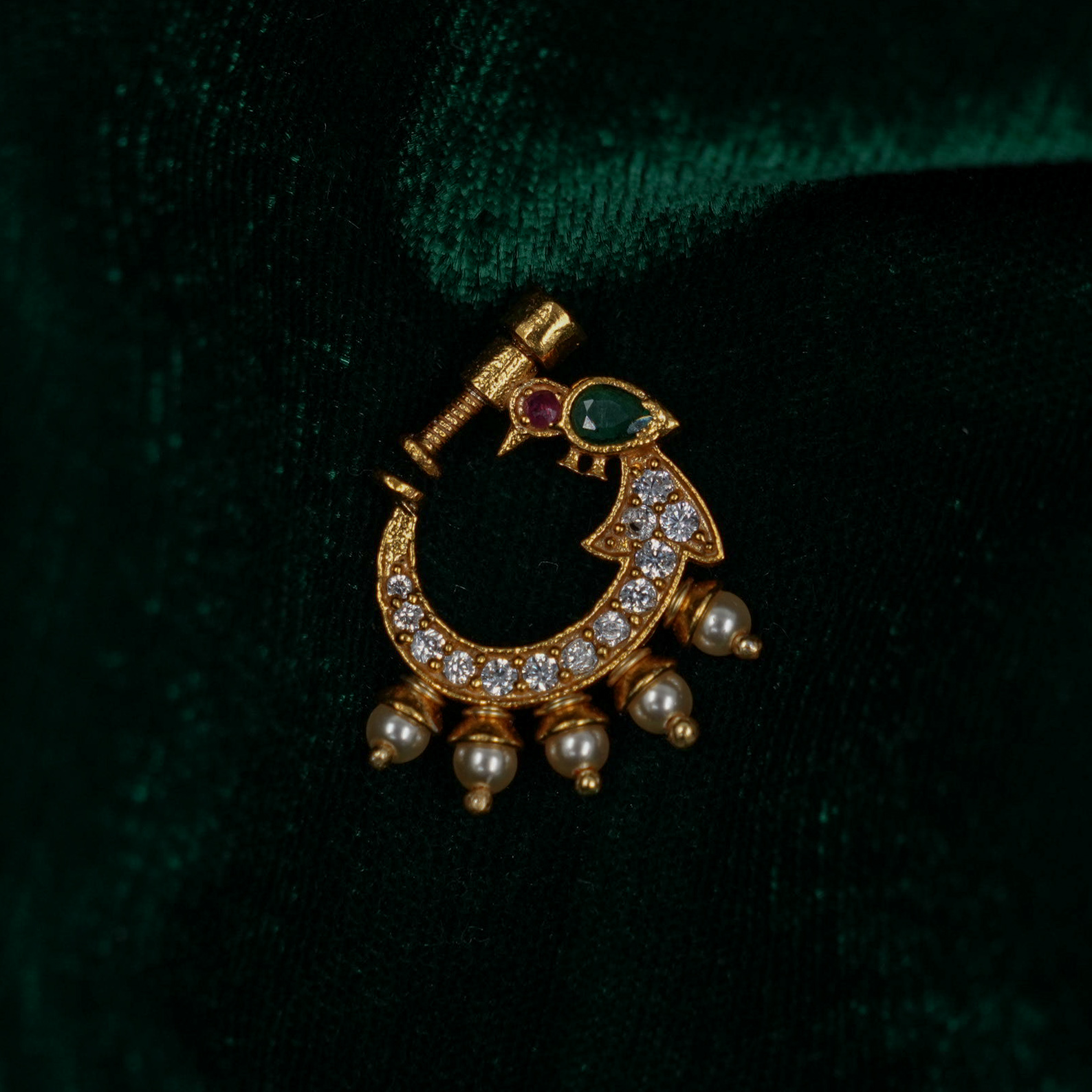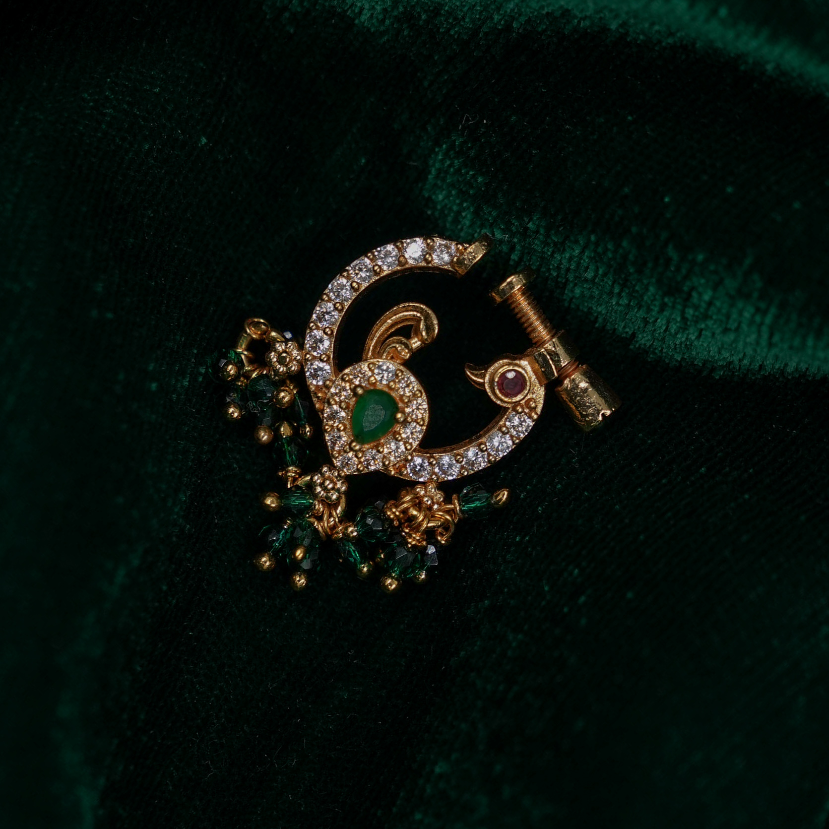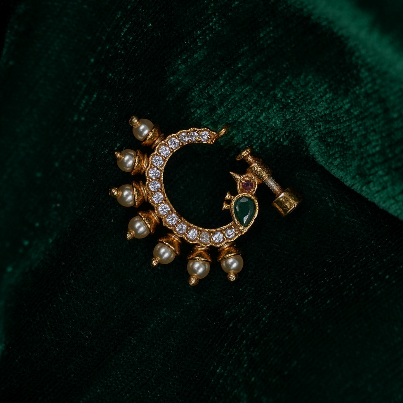 Elegant gold peacock nath with green and white stones, perfect for traditional occasions. Buy gold peacock nath from Raag Silver Jewellery in Hyderabad.