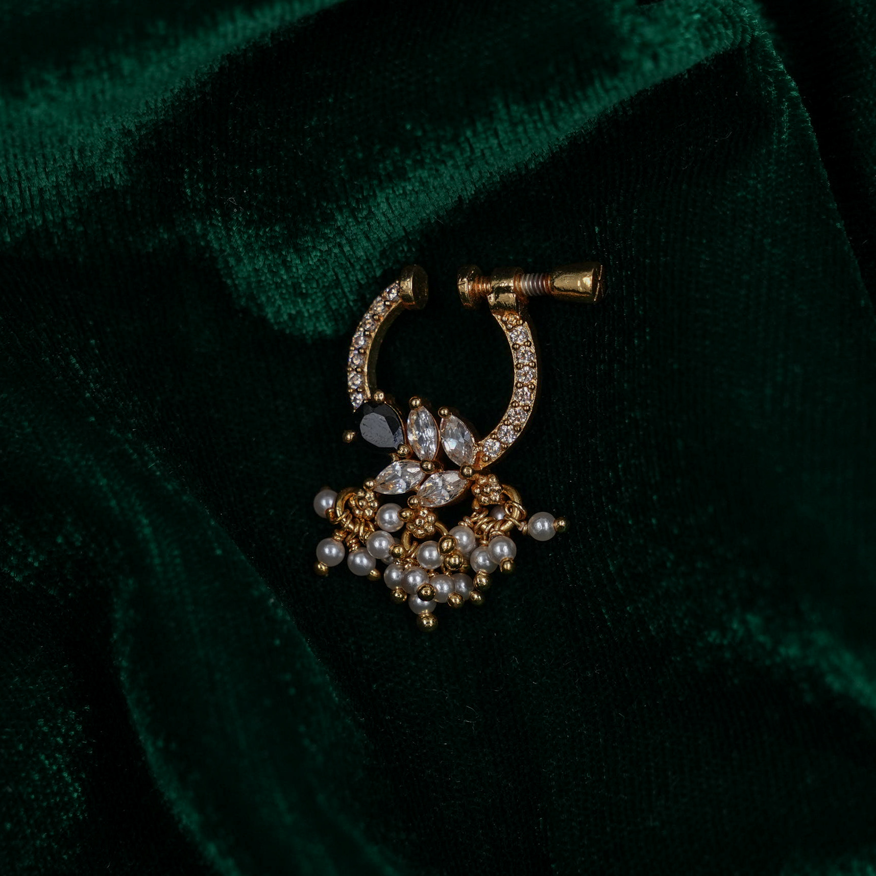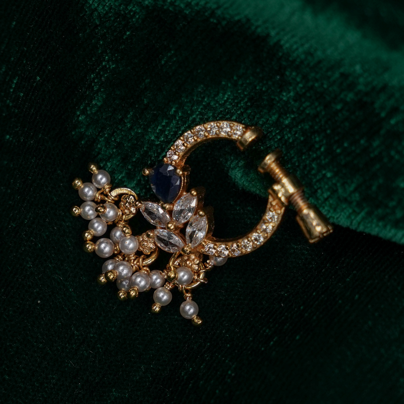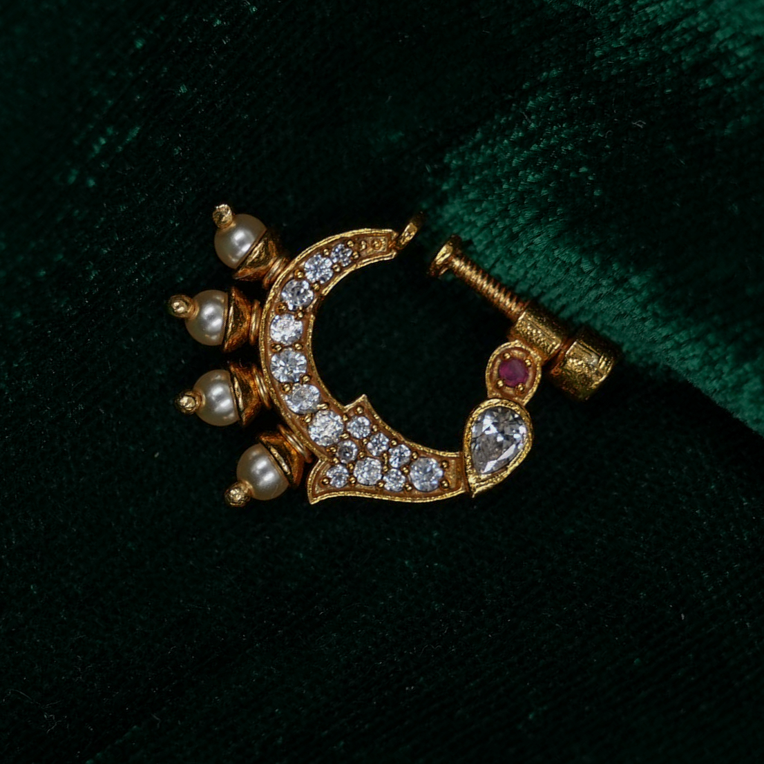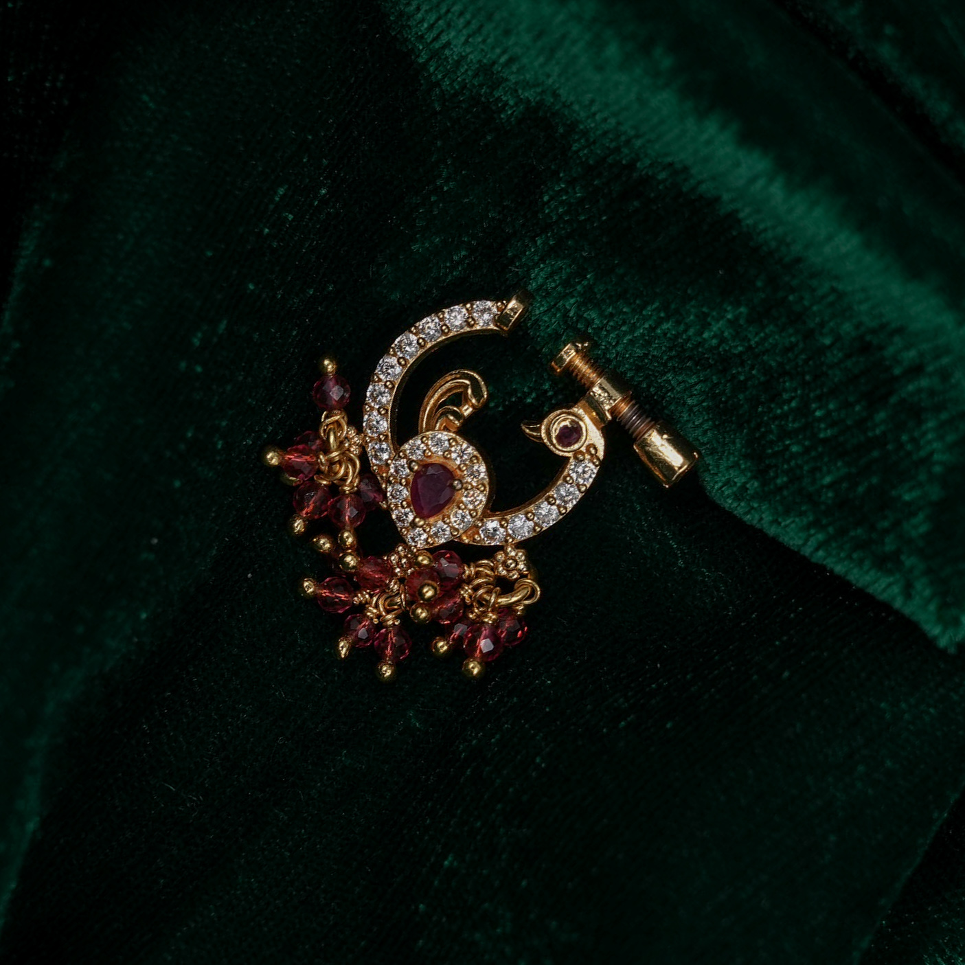 Elegant gold nose ring with ruby and crystal accents, perfect for adding a touch of tradition. Buy gold nose ring from Raag Silver Jewellery in Hyderabad.