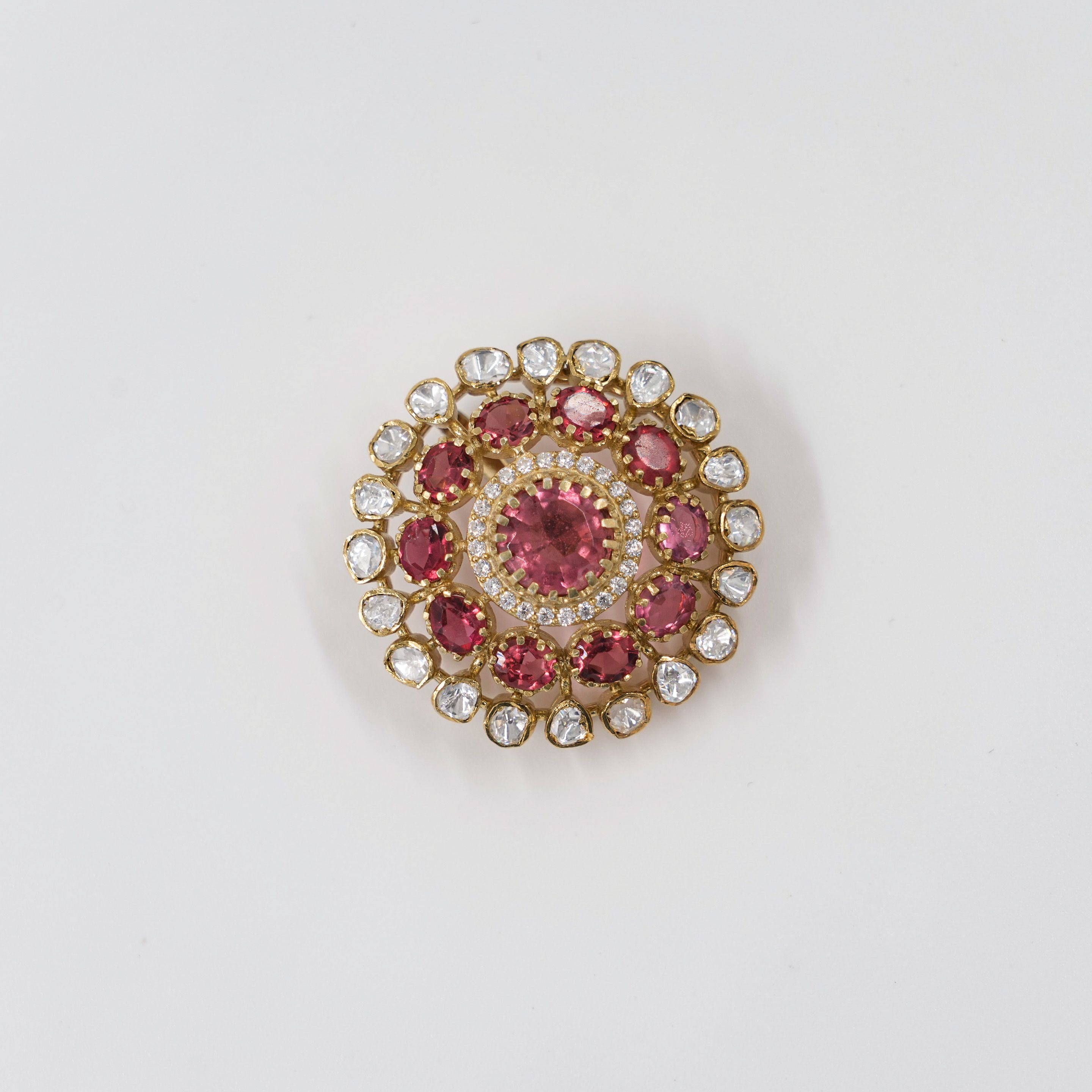 Elegant gold pendant with pink gemstone and cubic zirconia accents, ideal for special occasions. Buy gold pink pendant from Raag Silver Jewellery in Hyderabad.