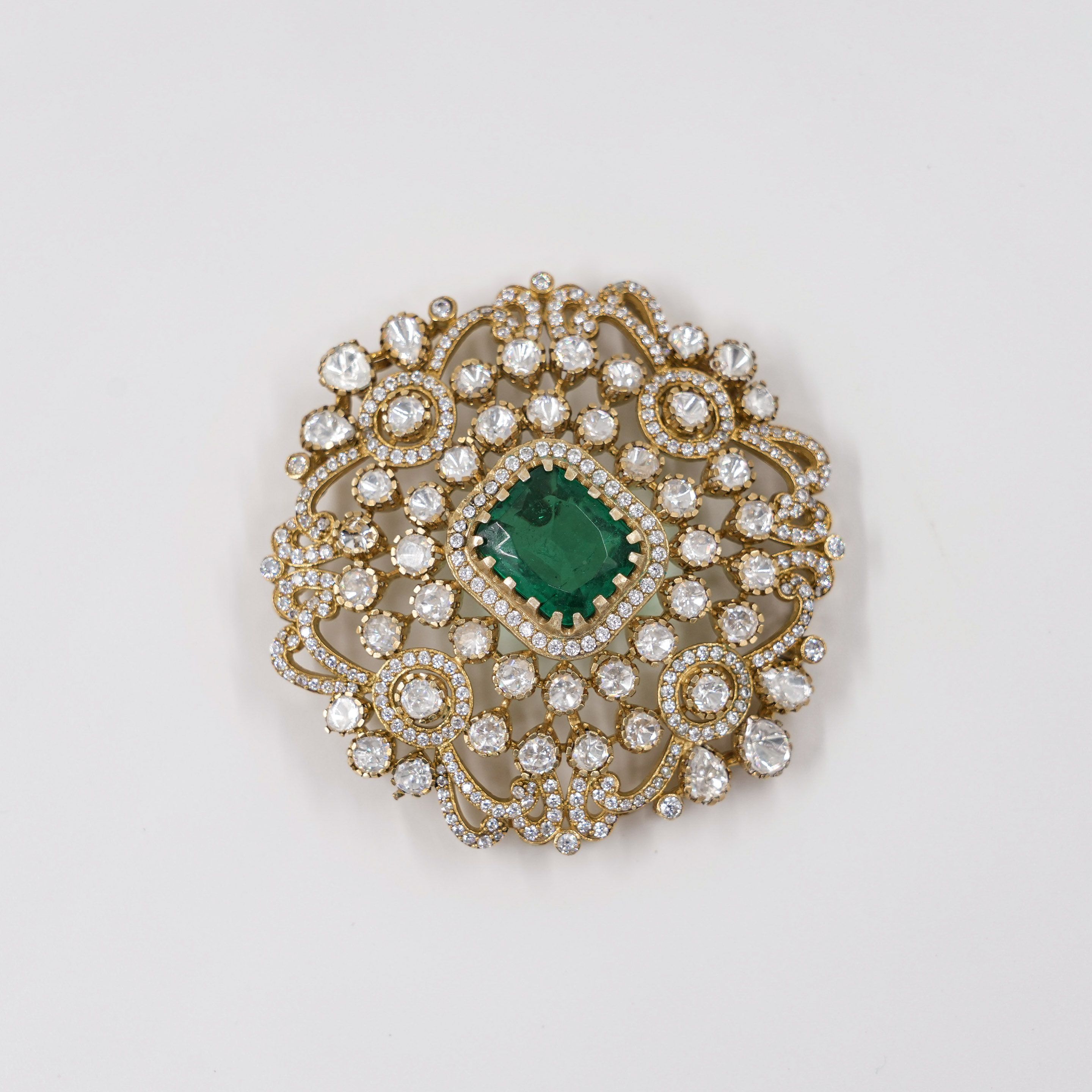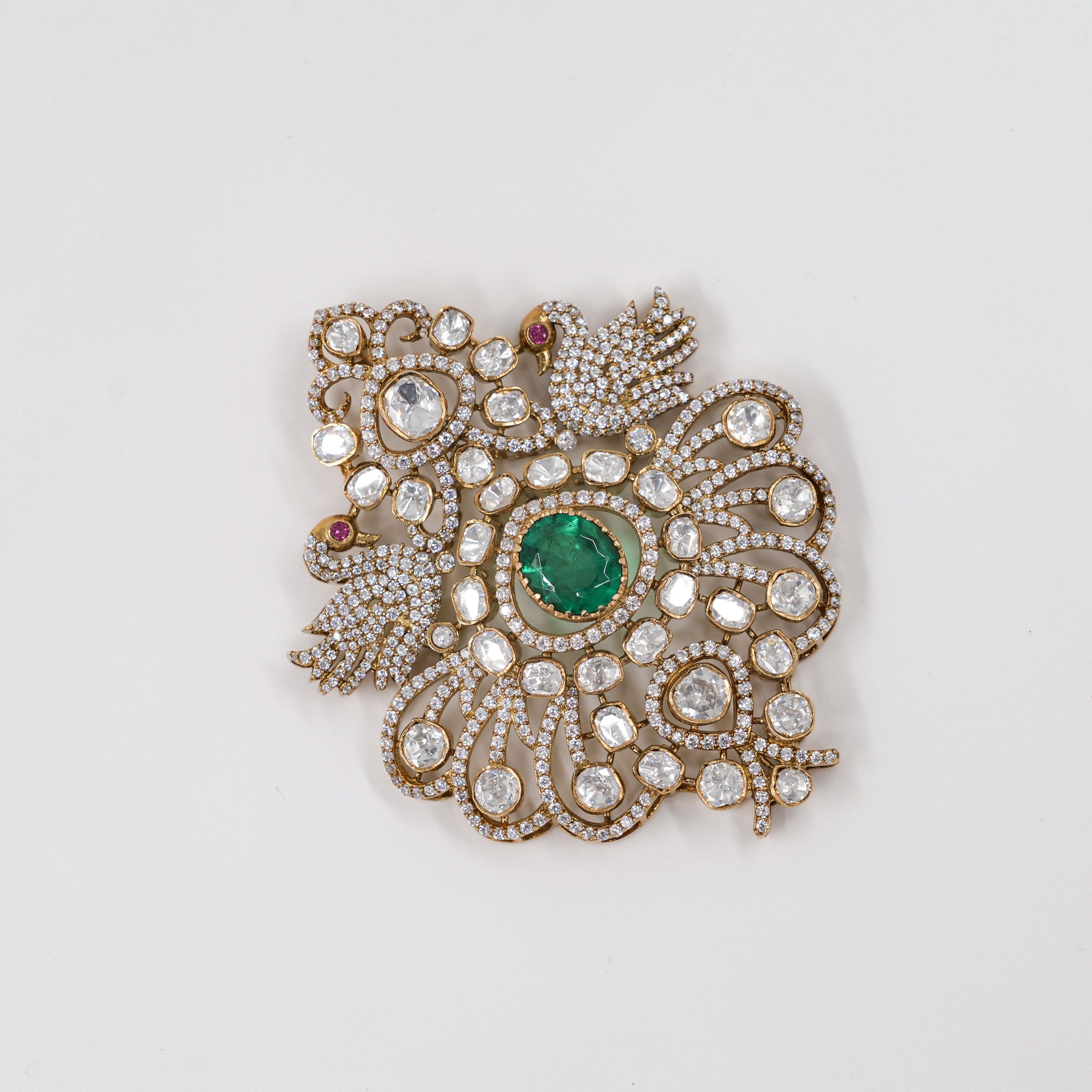 Gold plated pendant set with emerald and artificial diamonds, perfect for festive occasions. Buy Stone Pendant Set from Raag Silver Jewellery in Hyderabad.