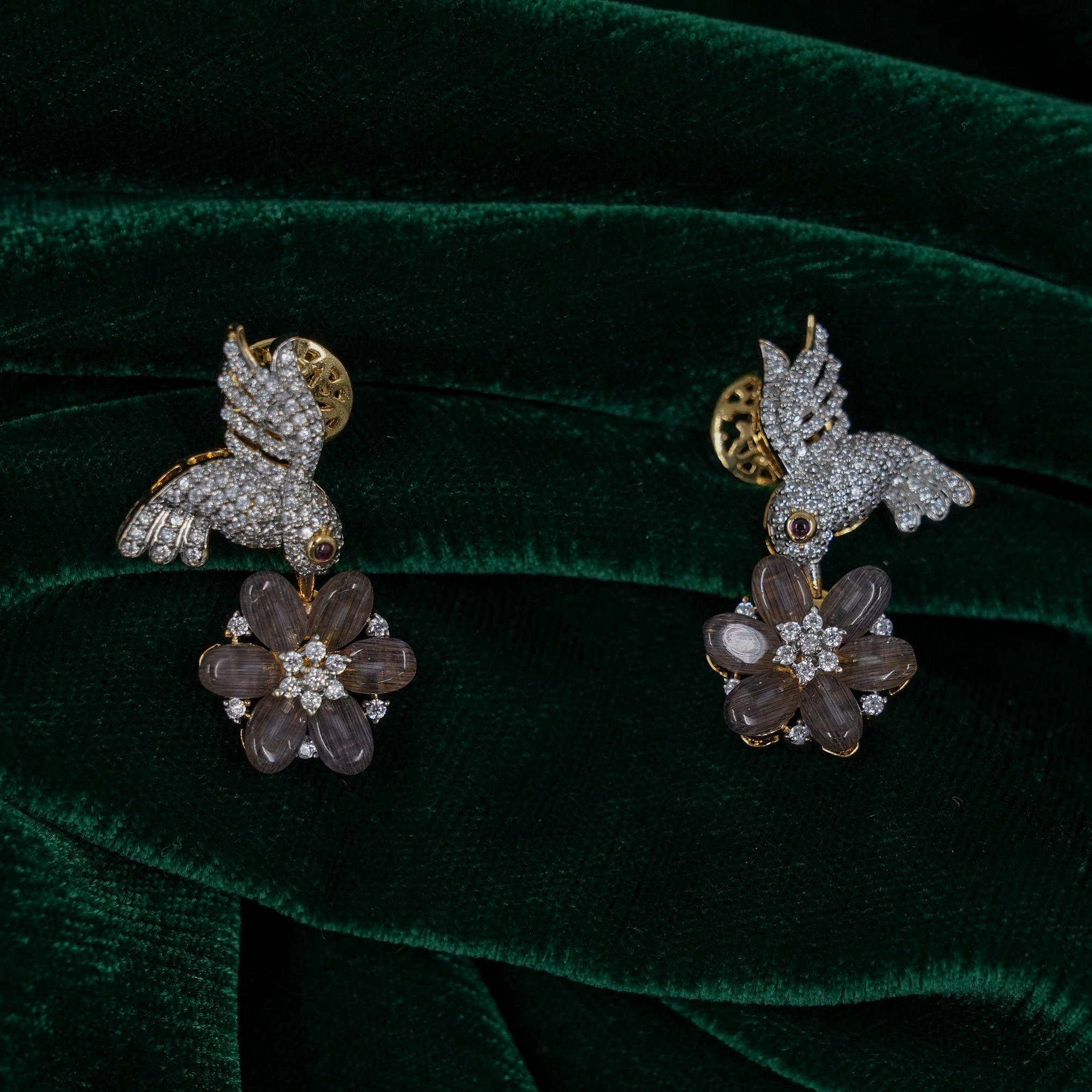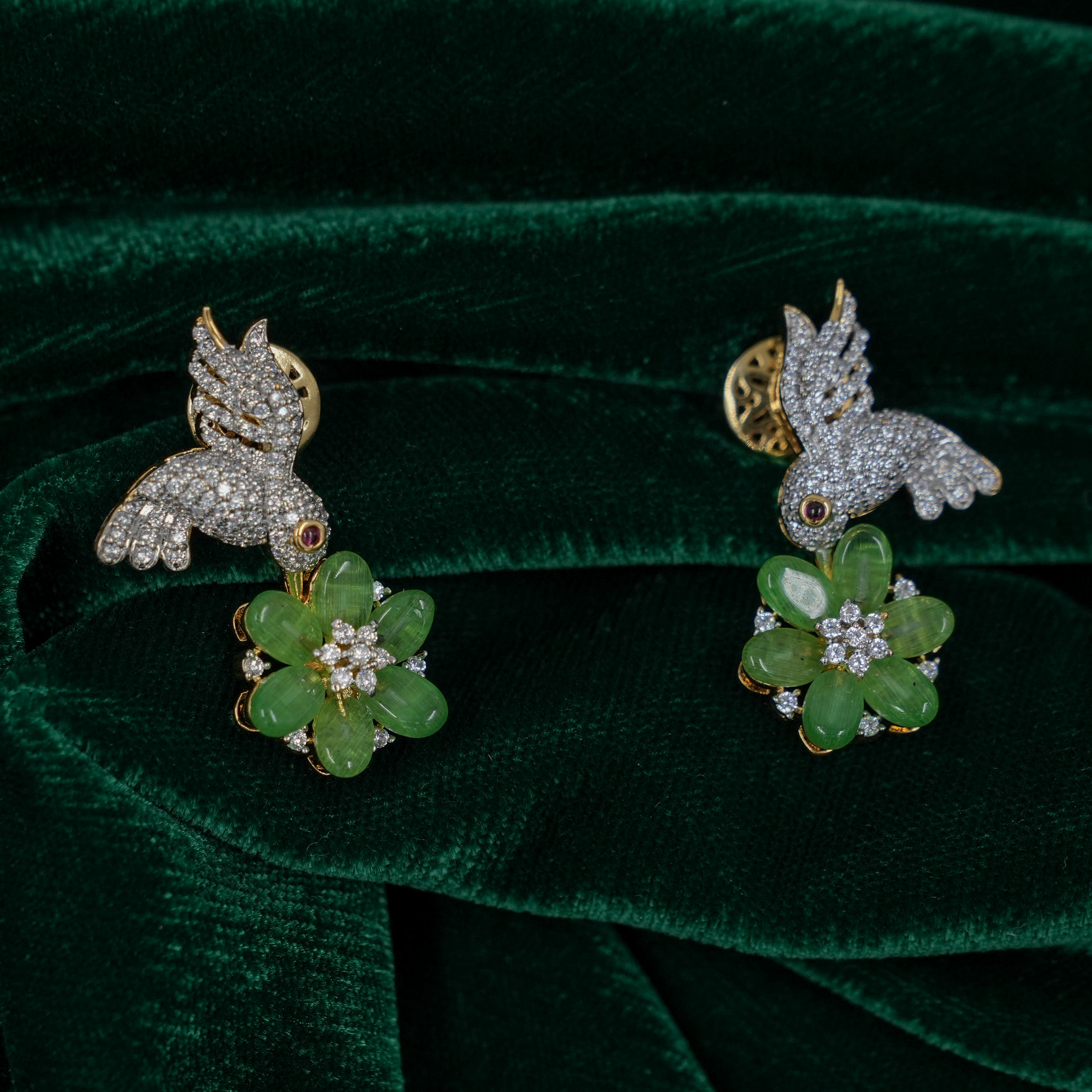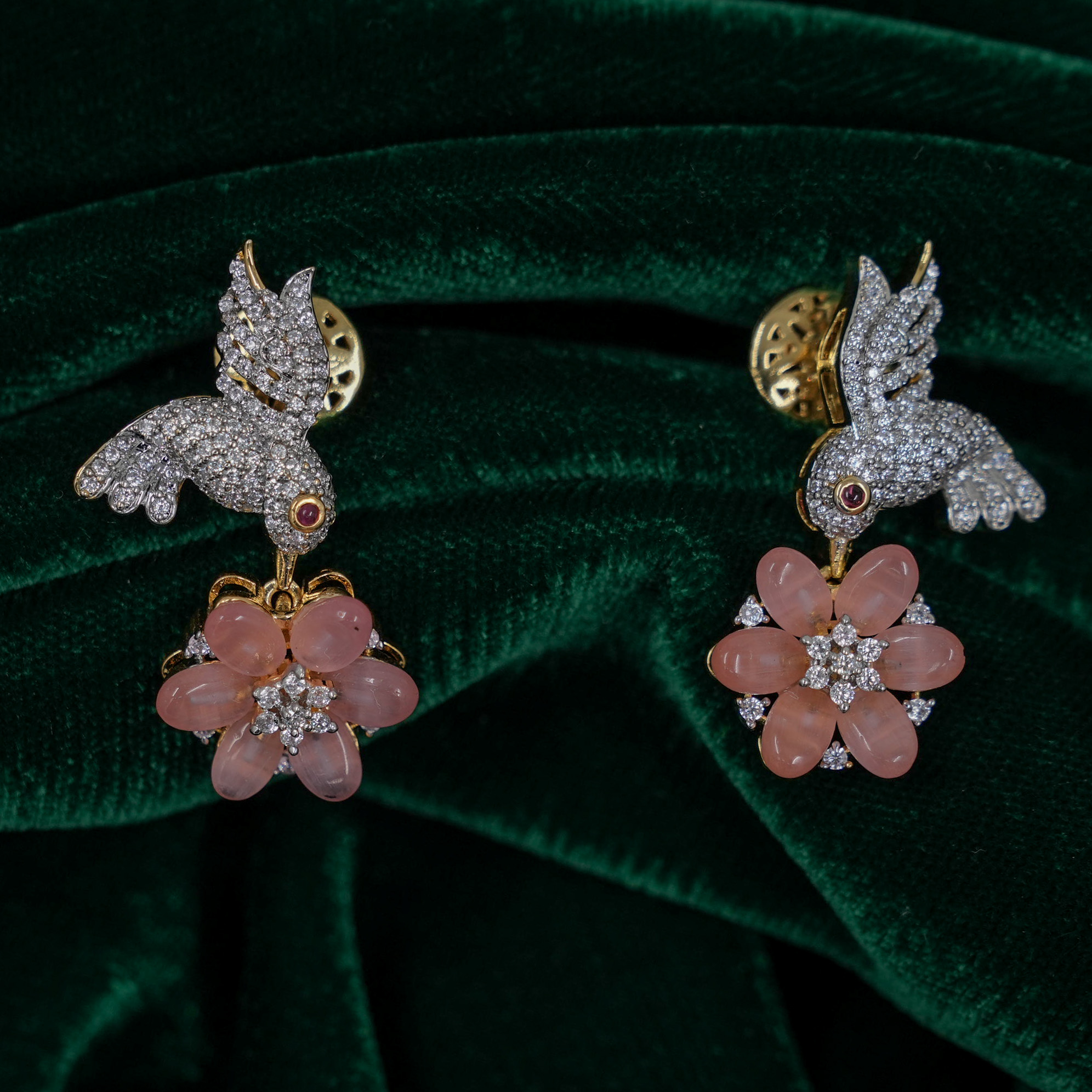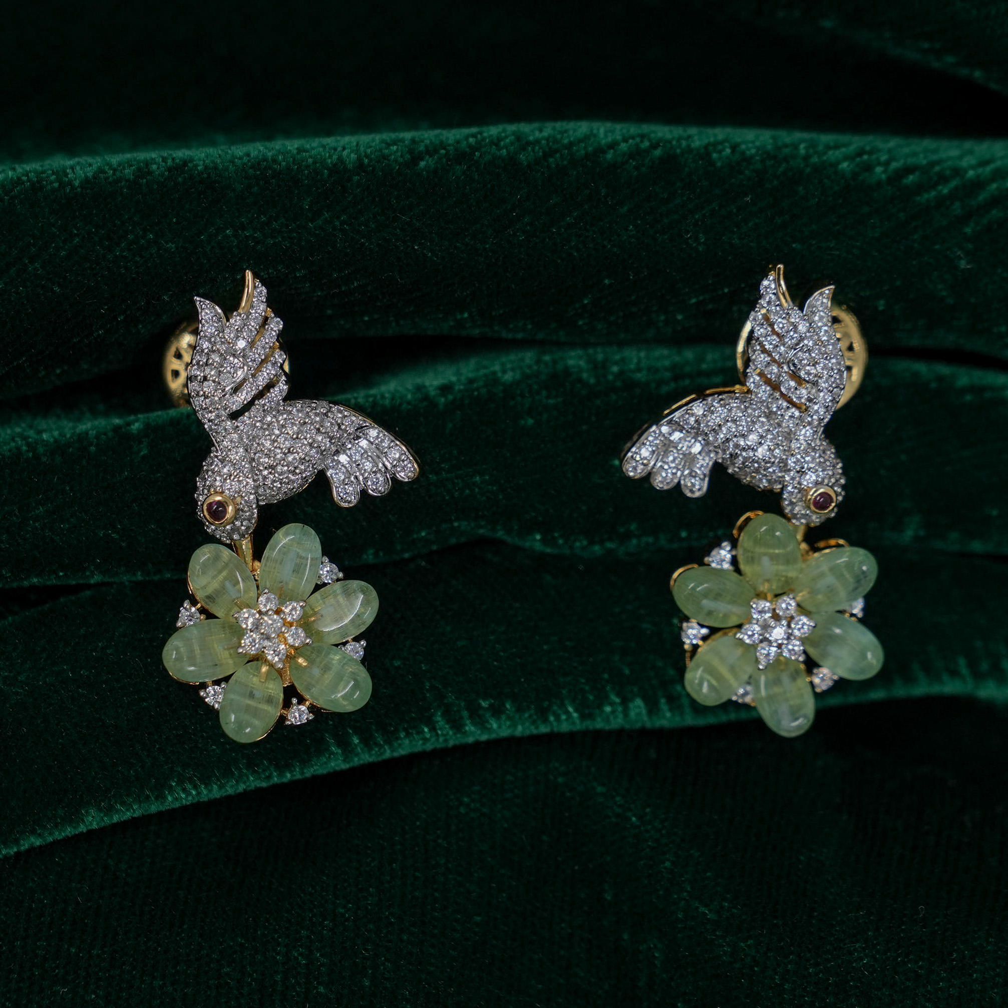 Intricate silver bird pendant with gemstone flower, a charming piece for special occasions. Buy silver bird pendant from Raag Silver Jewellery in Hyderabad.