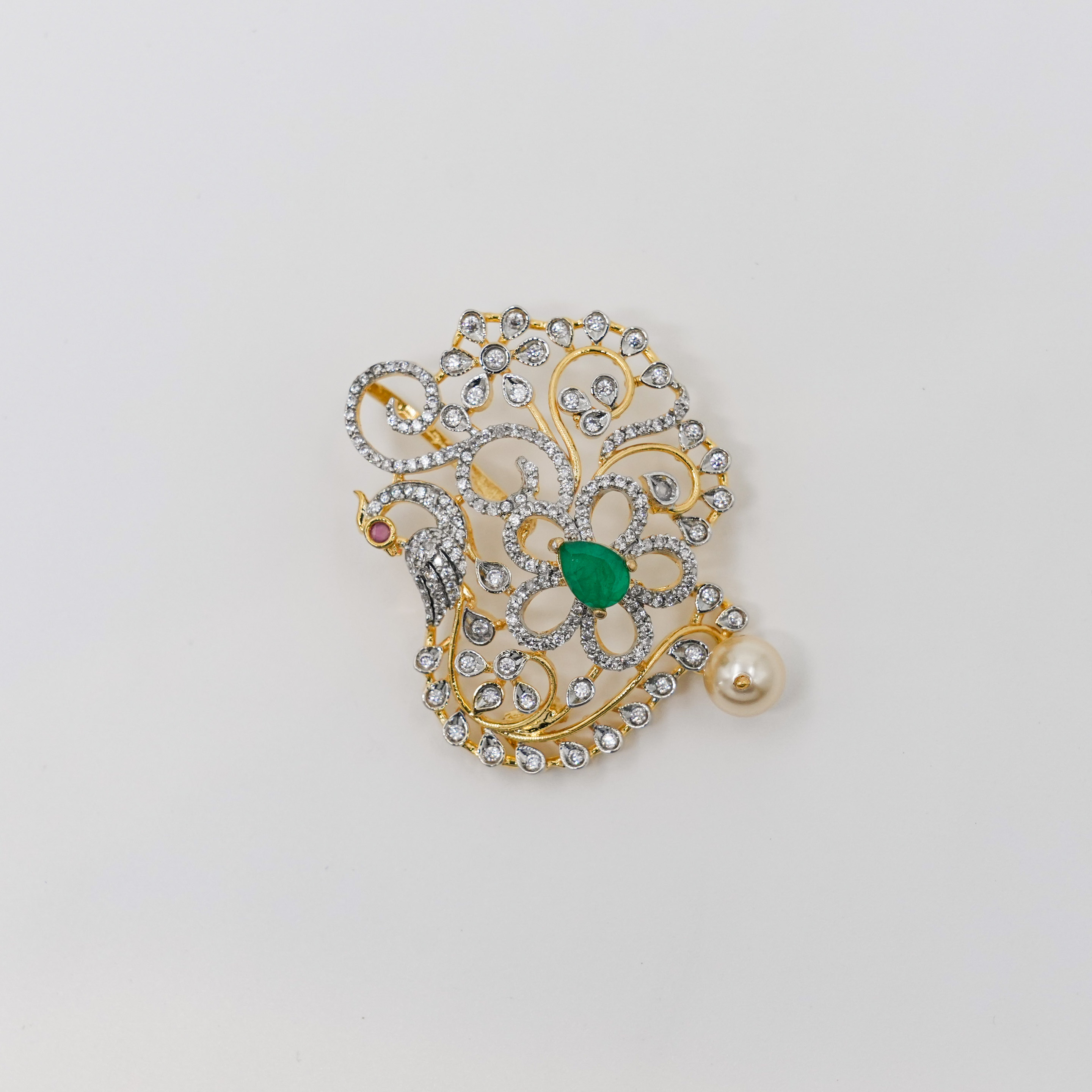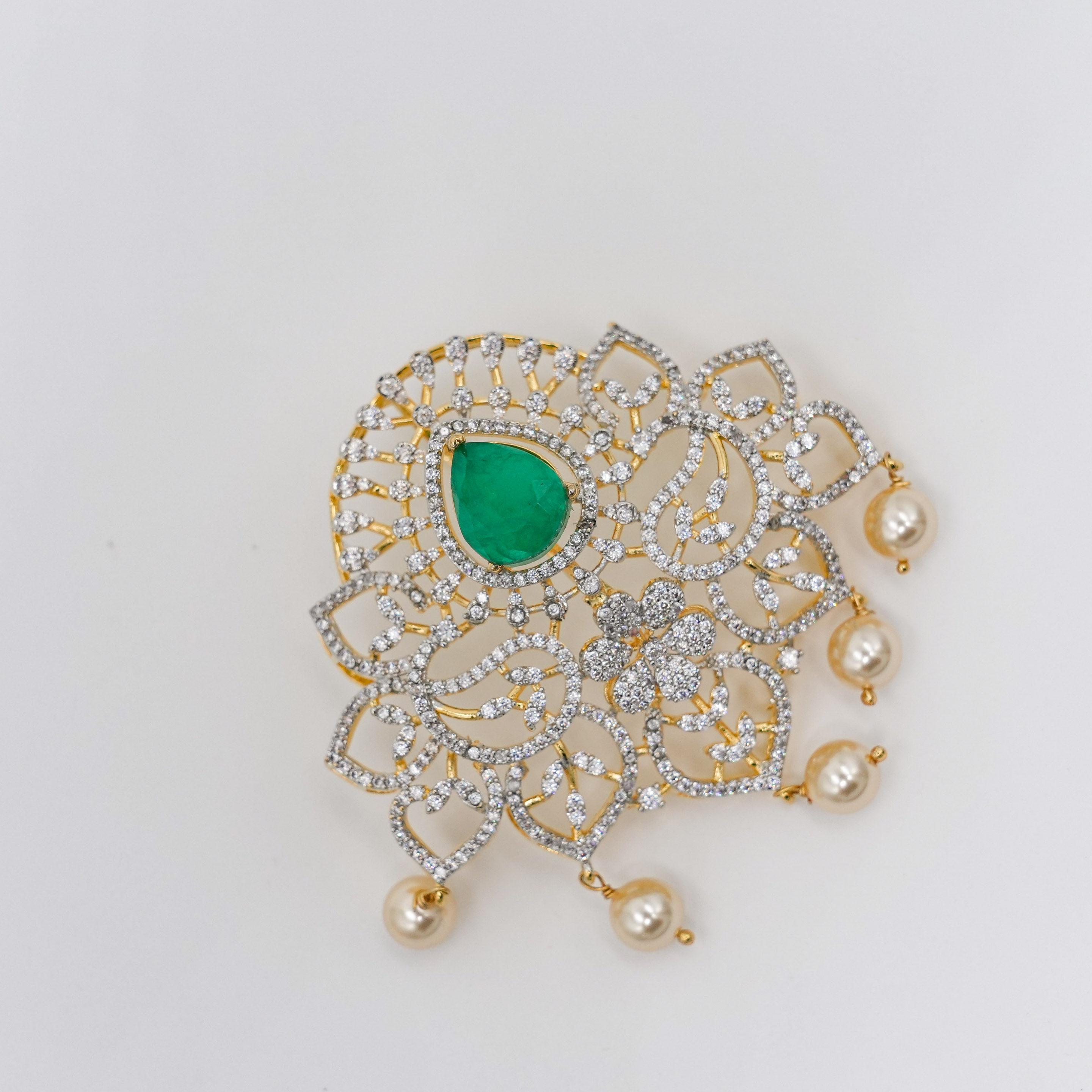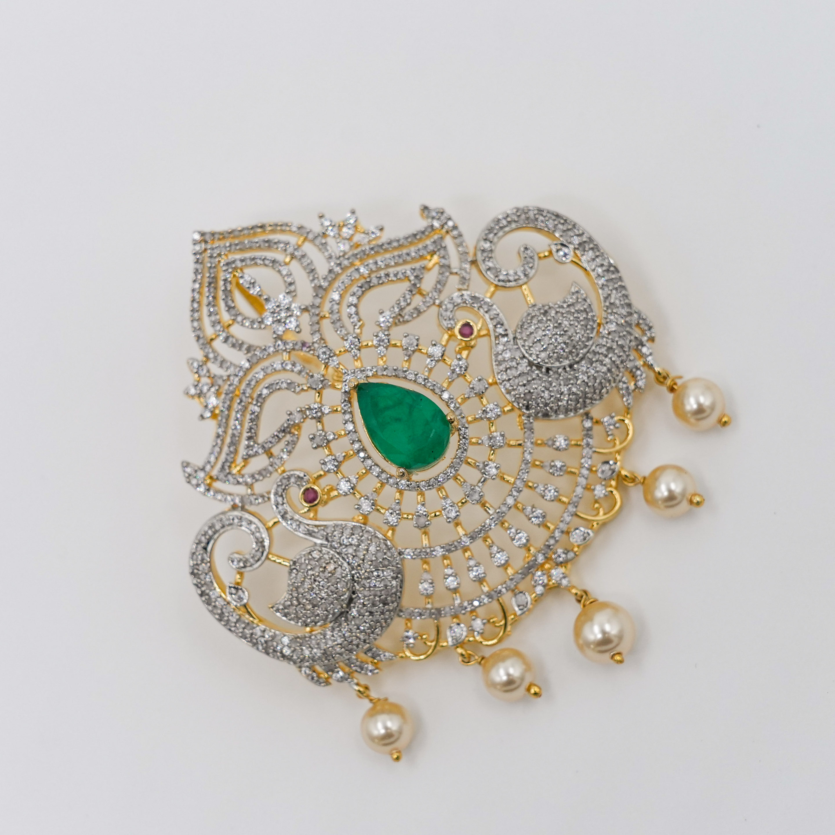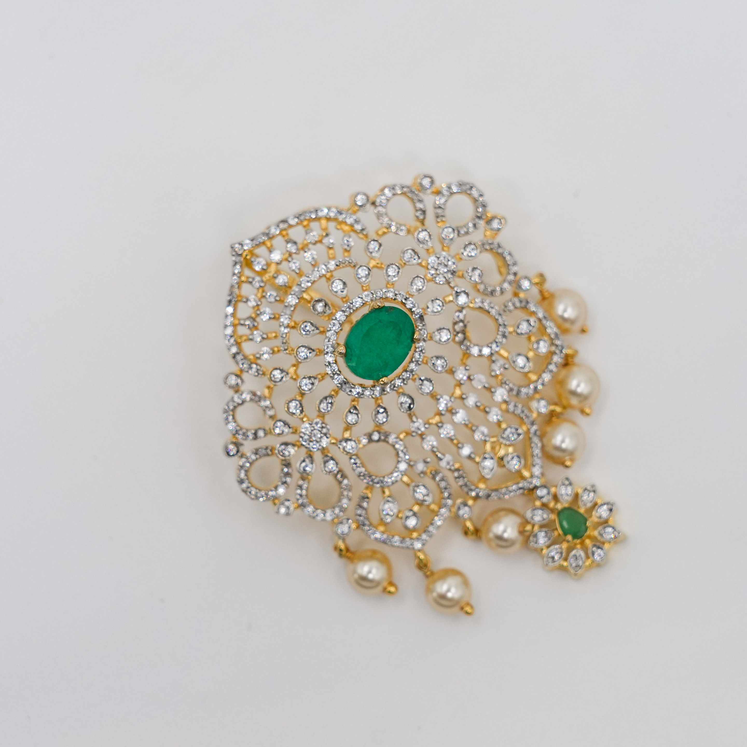 Gold plated pendant set with emerald and artificial diamonds, perfect for festive occasions. Buy Stone Pendant Set from Raag Silver Jewellery in Hyderabad.