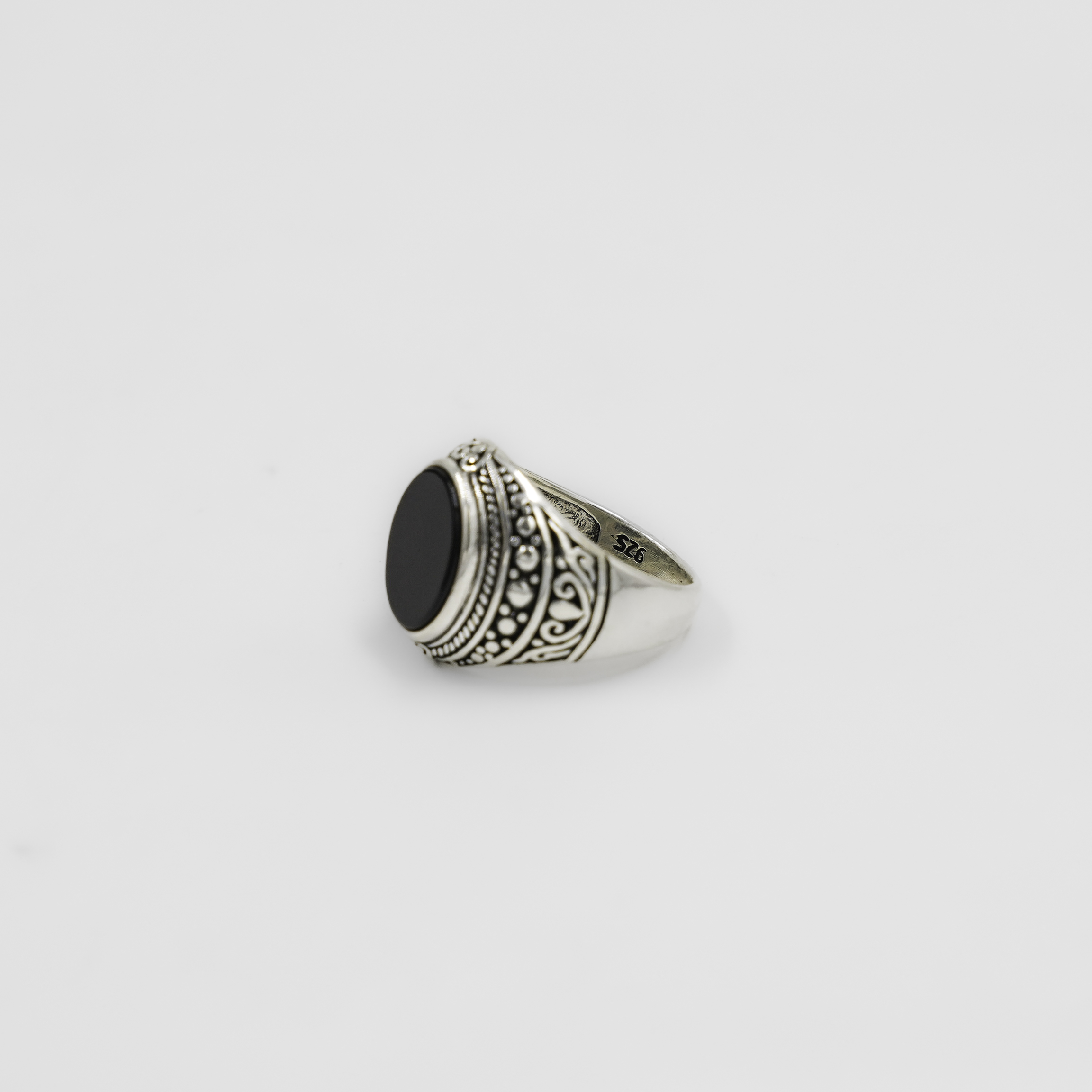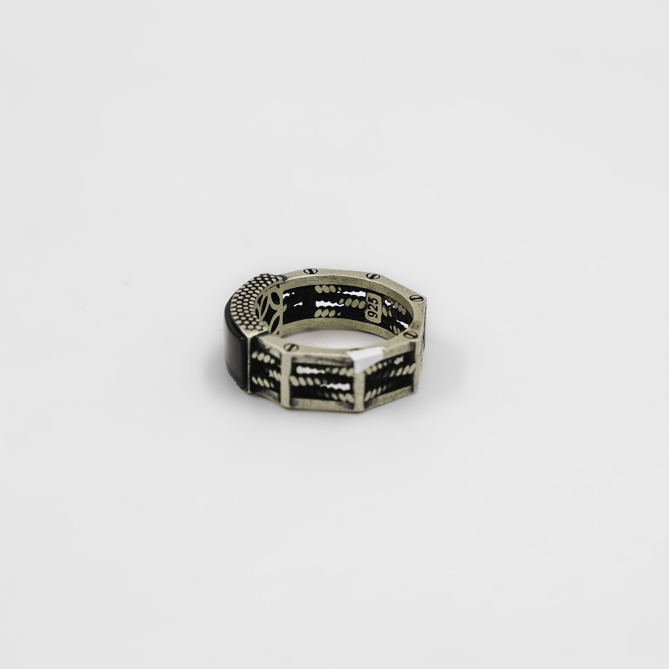 Silver Detailed Patterned Band Ring Black Rectangular Stone
