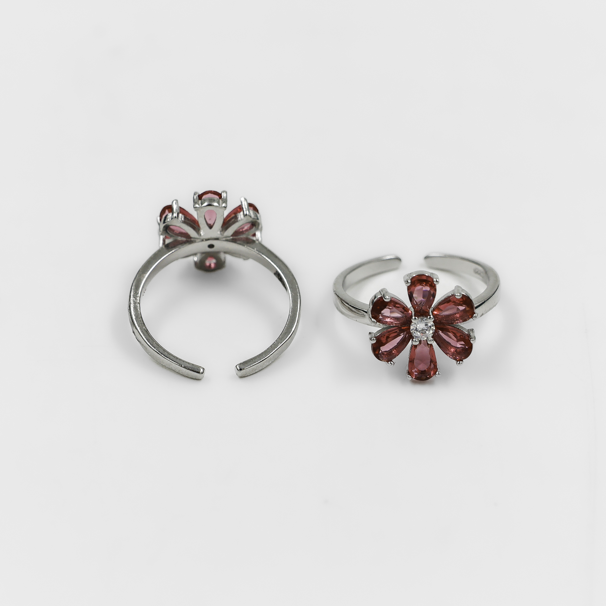 Stylish silver flower ring with red stones, perfect for daily wear and special occasions. Buy silver flower ring from Raag Silver Jewellery in Hyderabad.