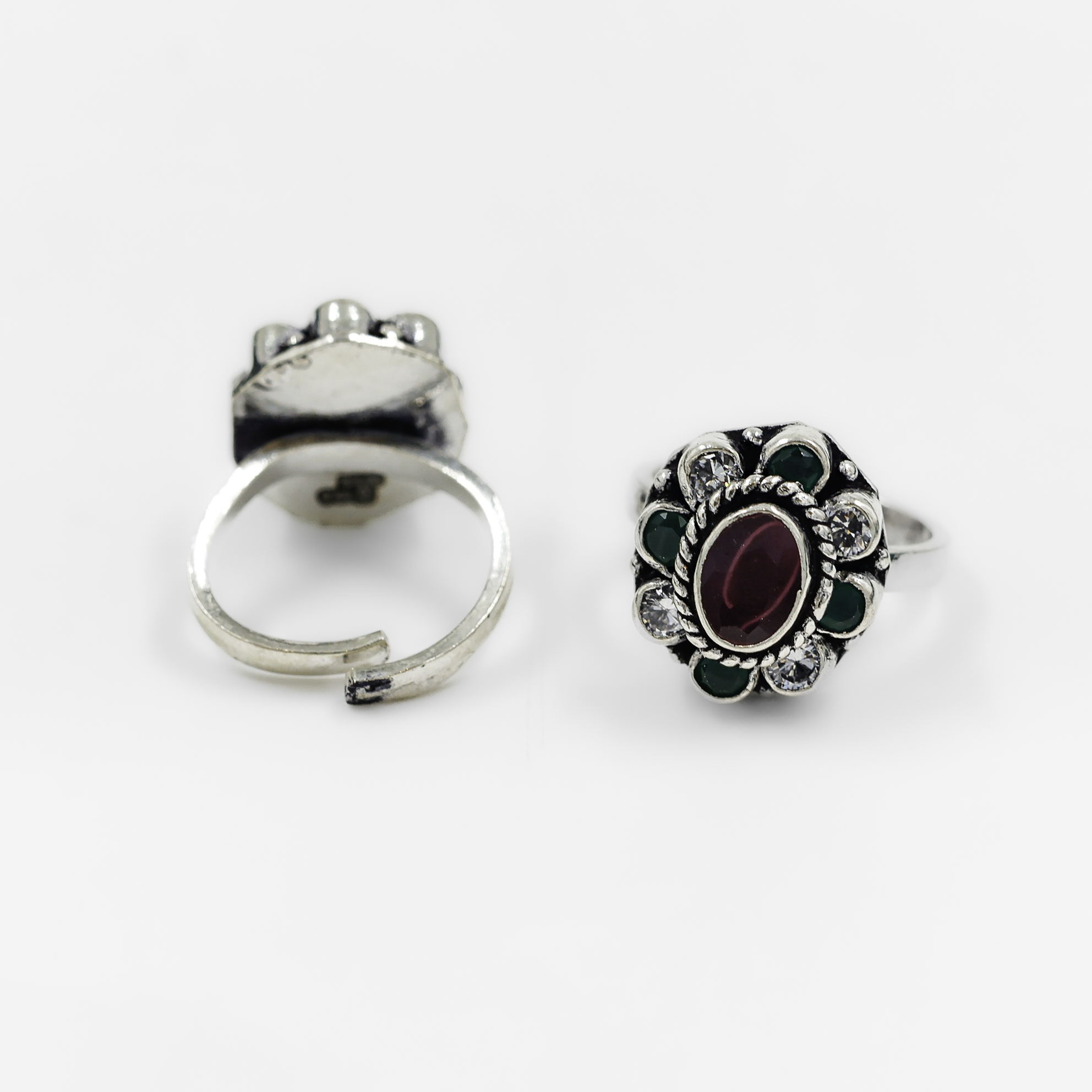Oxidized silver gemstone ring with ruby and emerald accents, adds a traditional touch. Buy Silver Gemstone Ring from Raag Silver Jewellery in Hyderabad.