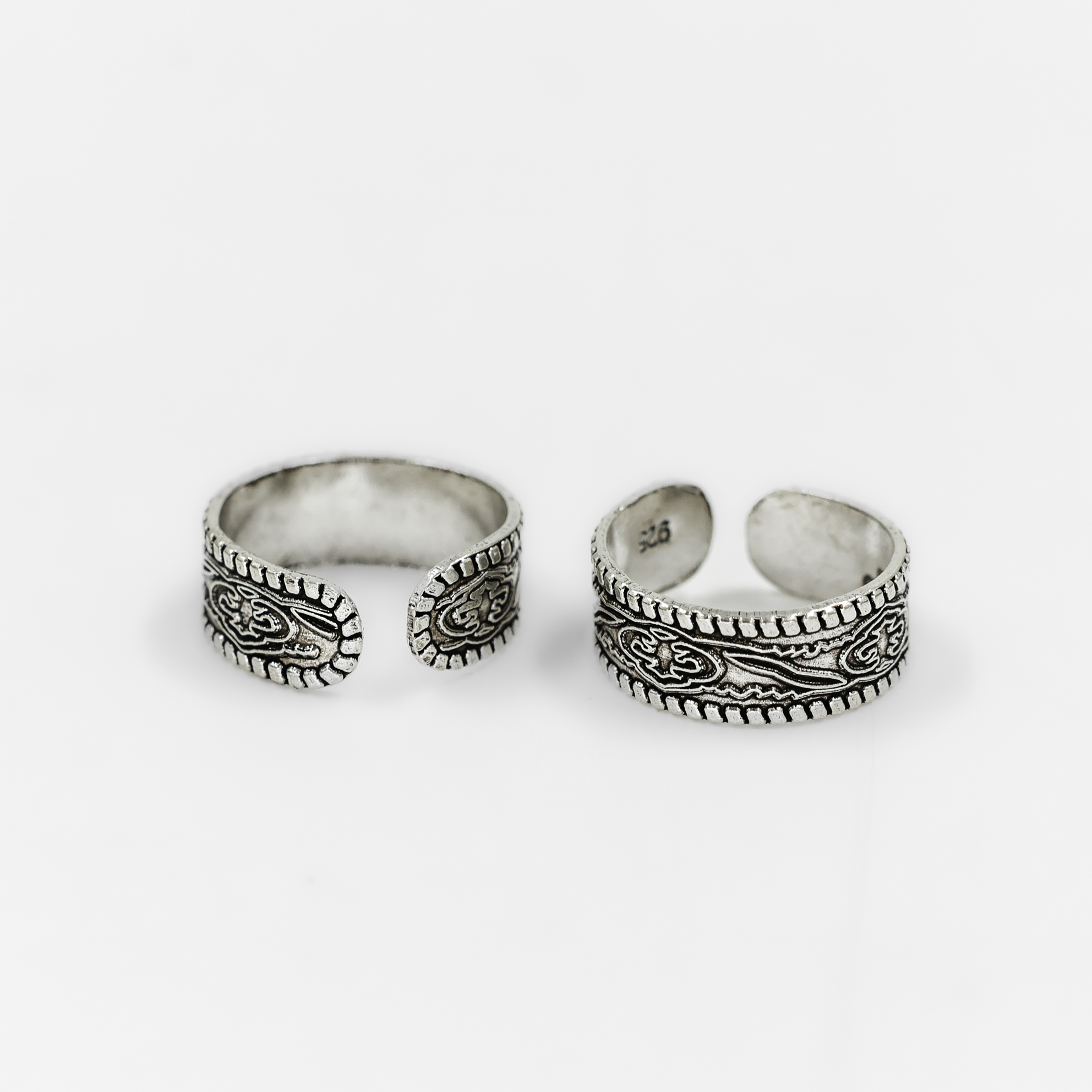 Oxidized silver toe ring with intricate design details, perfect for traditional and modern wear. Buy Silver Toe Ring from Raag Silver Jewellery in Hyderabad.