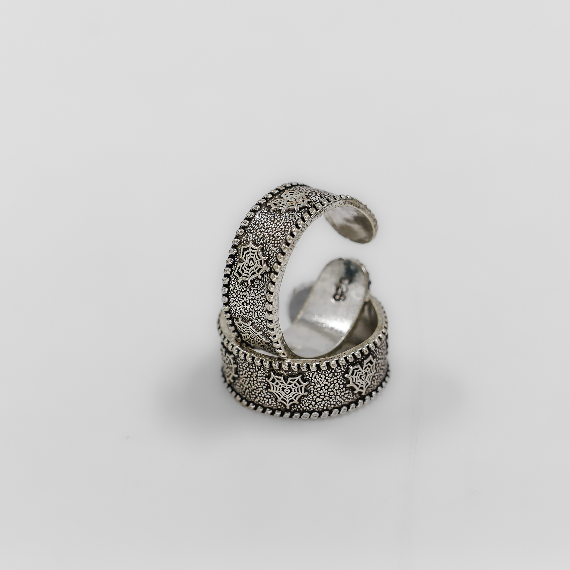 Oxidized silver leaf ring with intricate details, perfect for everyday wear and special occasions. Buy silver leaf ring from Raag Silver Jewellery in Hyderabad.