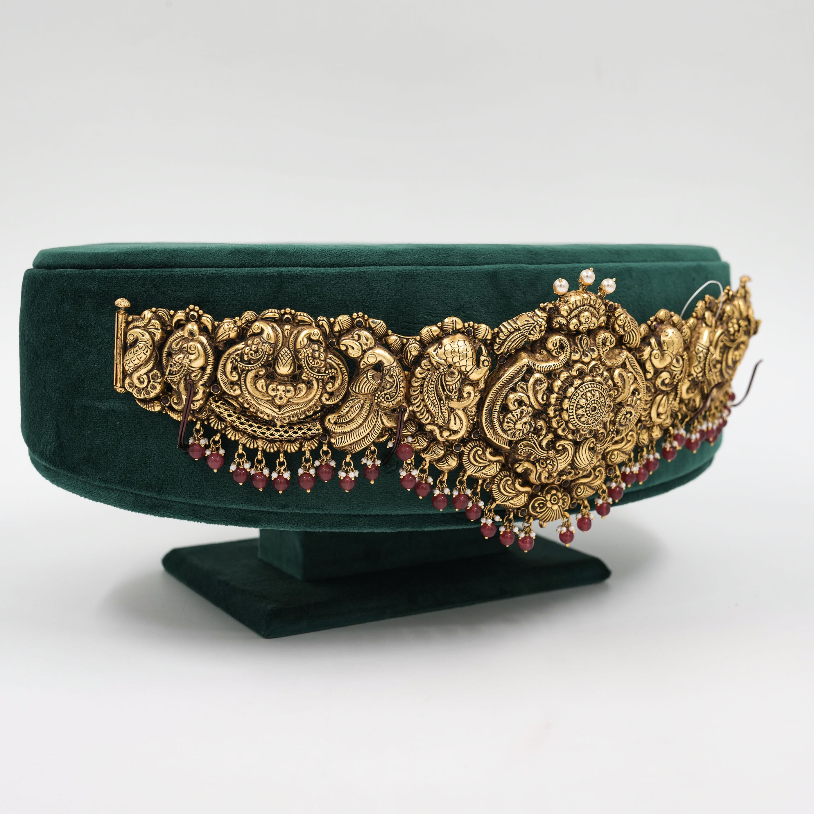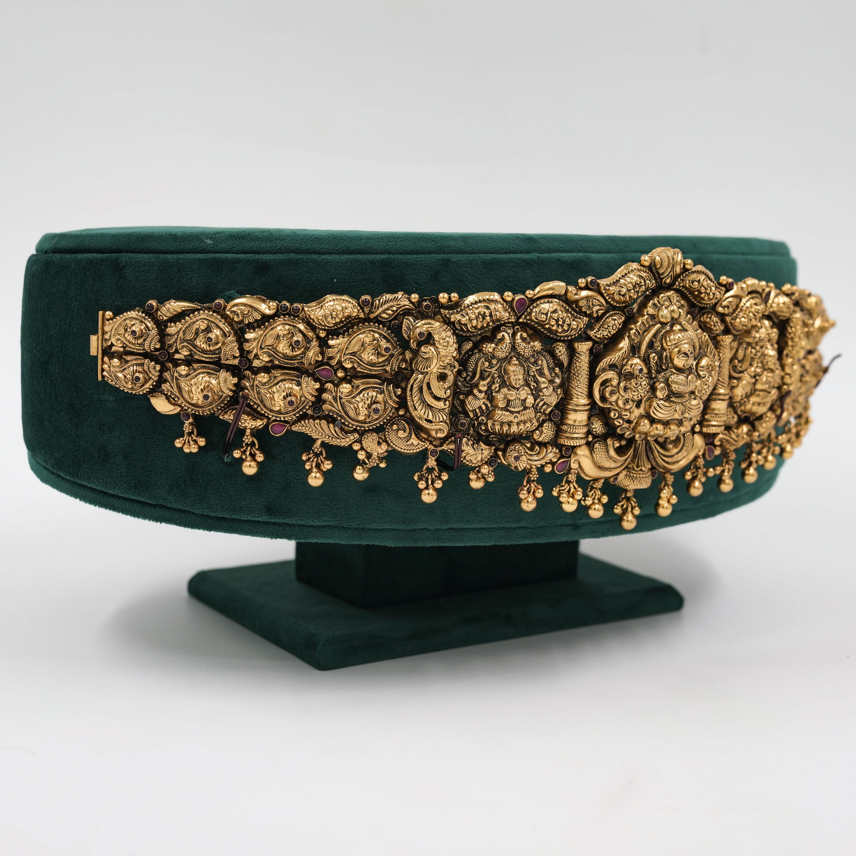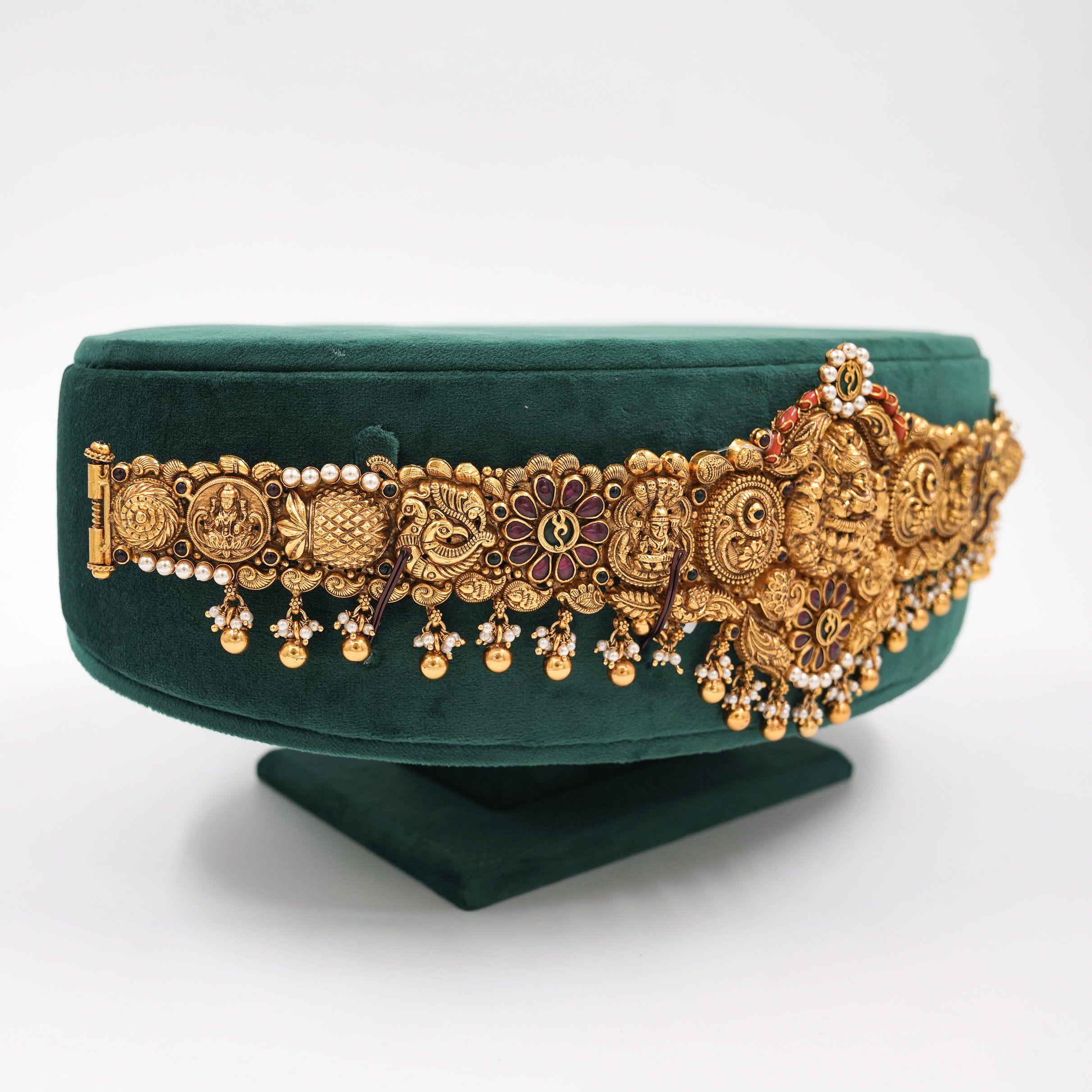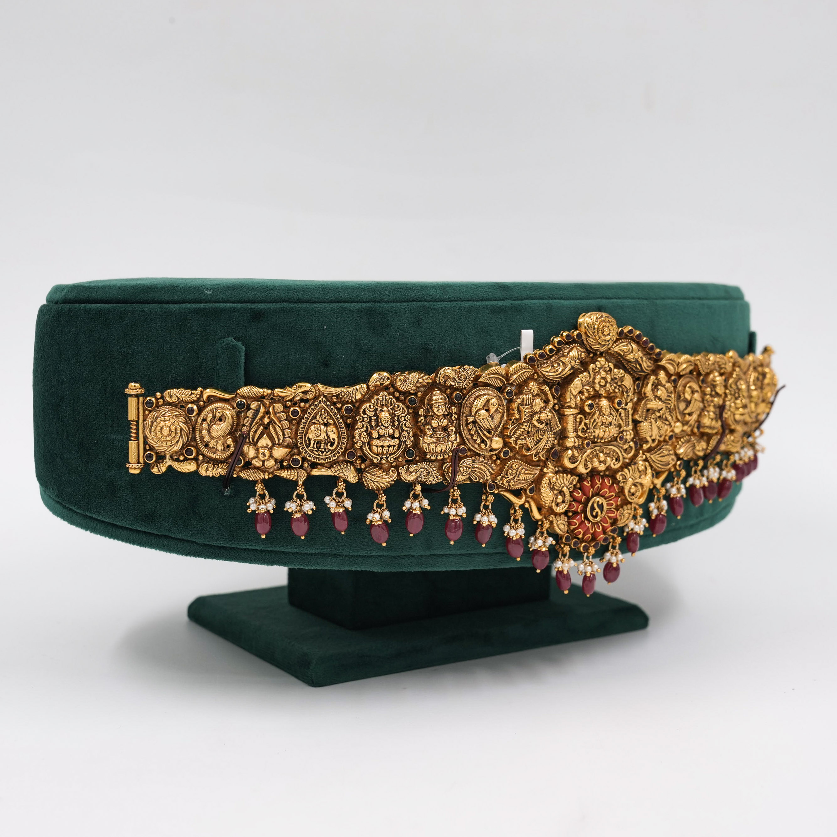 Intricate gold temple belt with ruby accents, perfect for weddings and traditional occasions. Buy gold temple belt from Raag Silver Jewellery in Hyderabad.