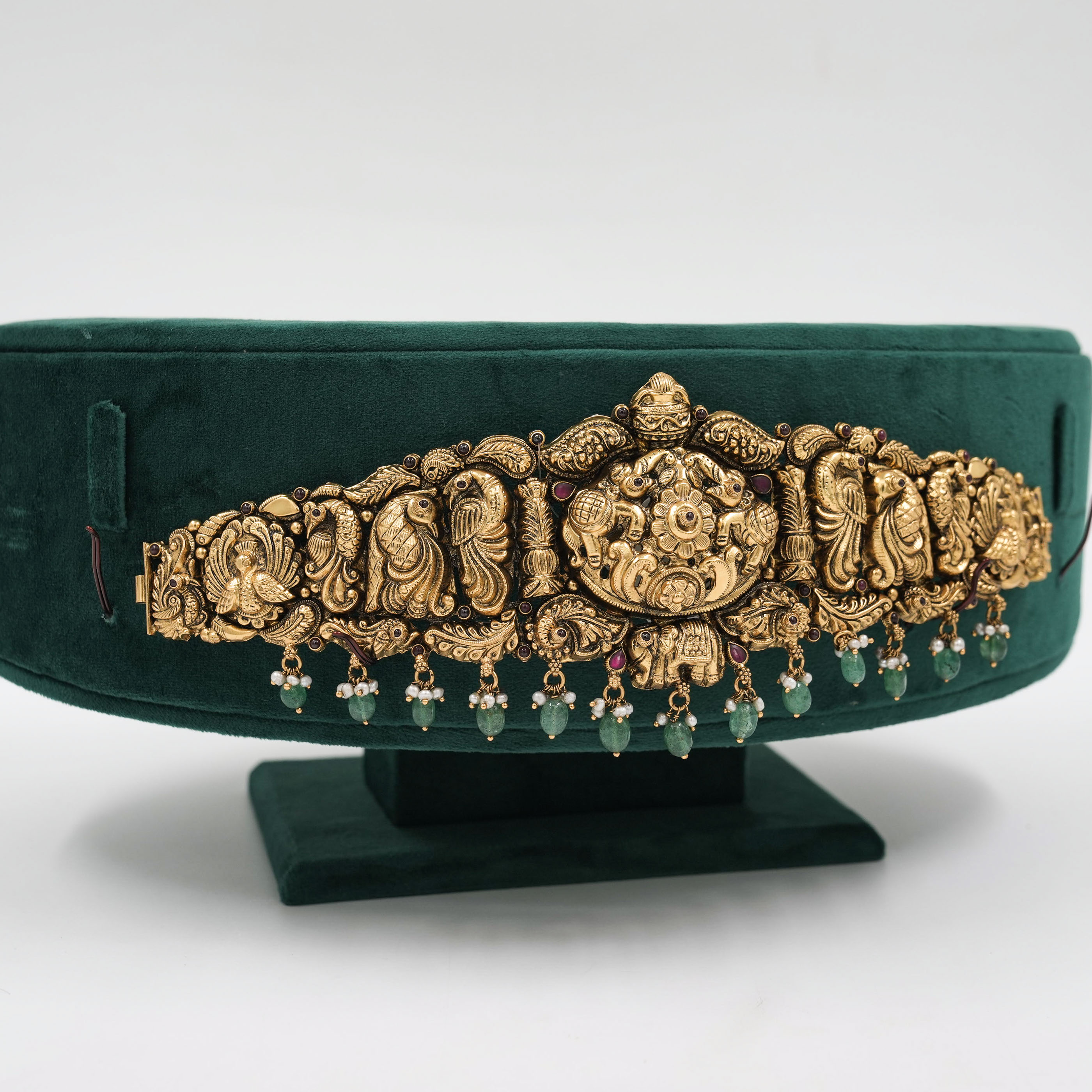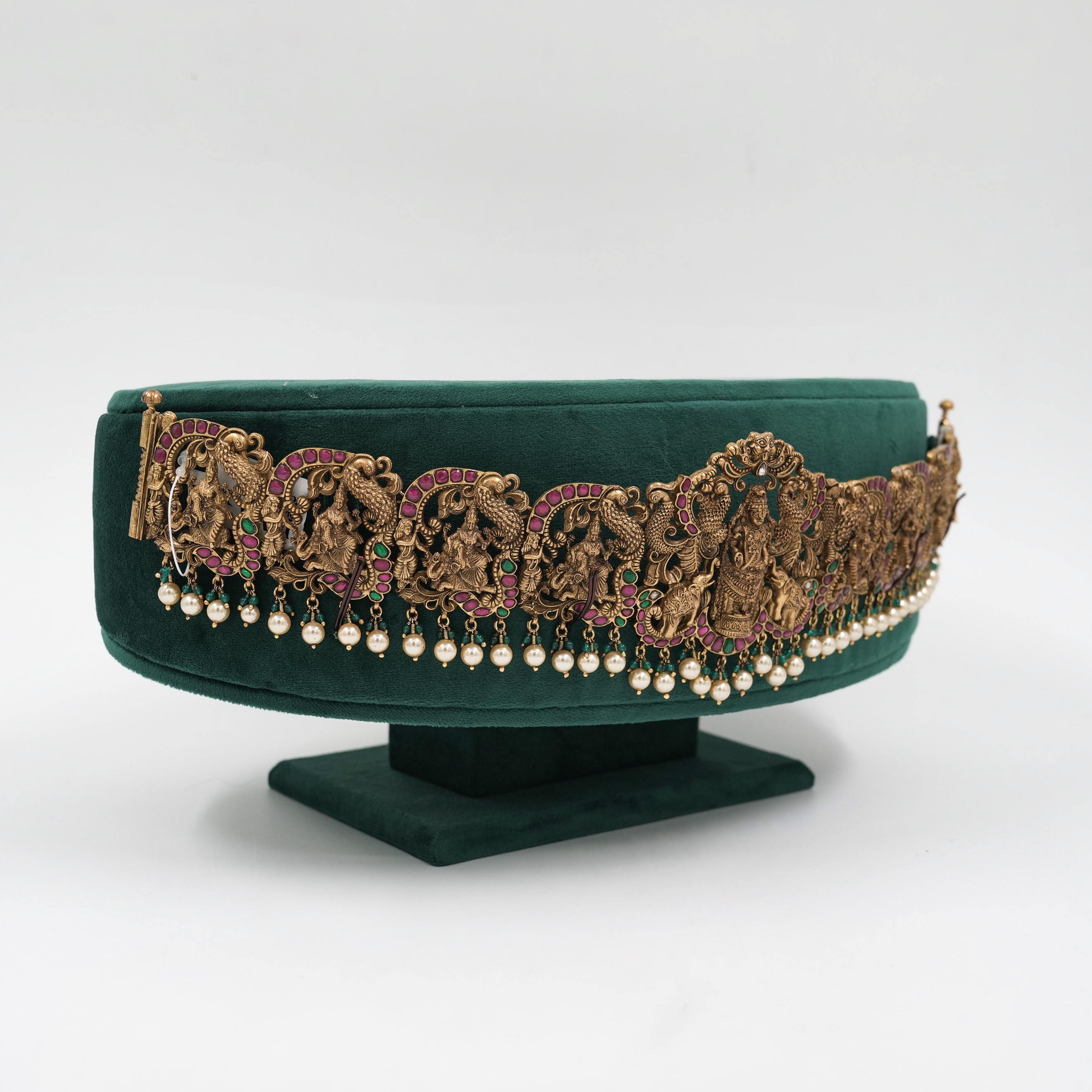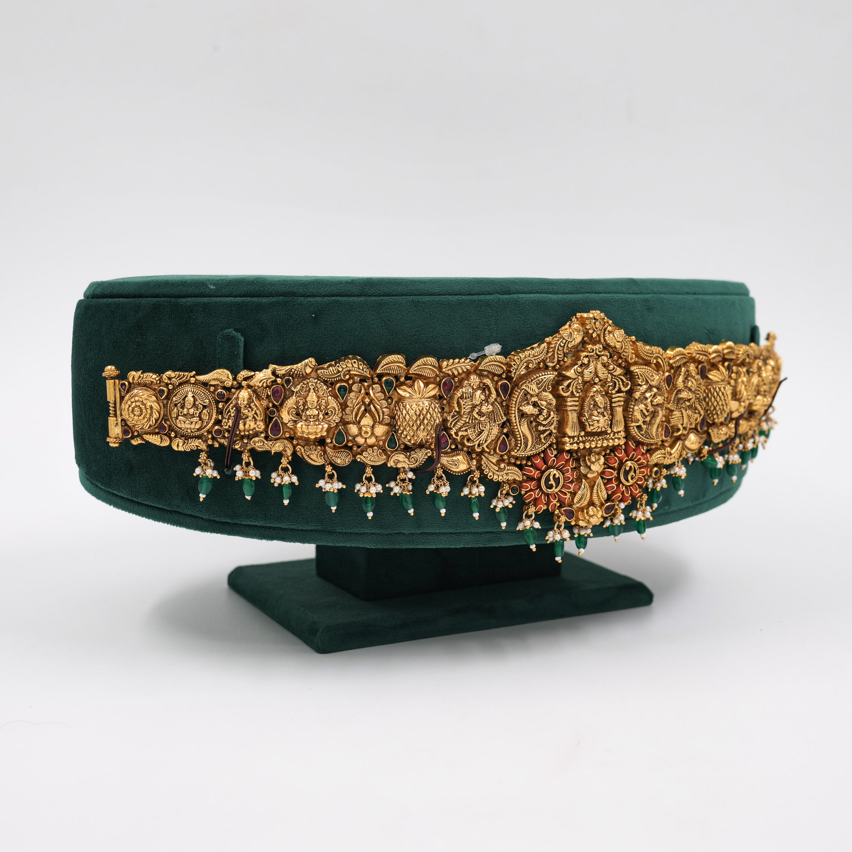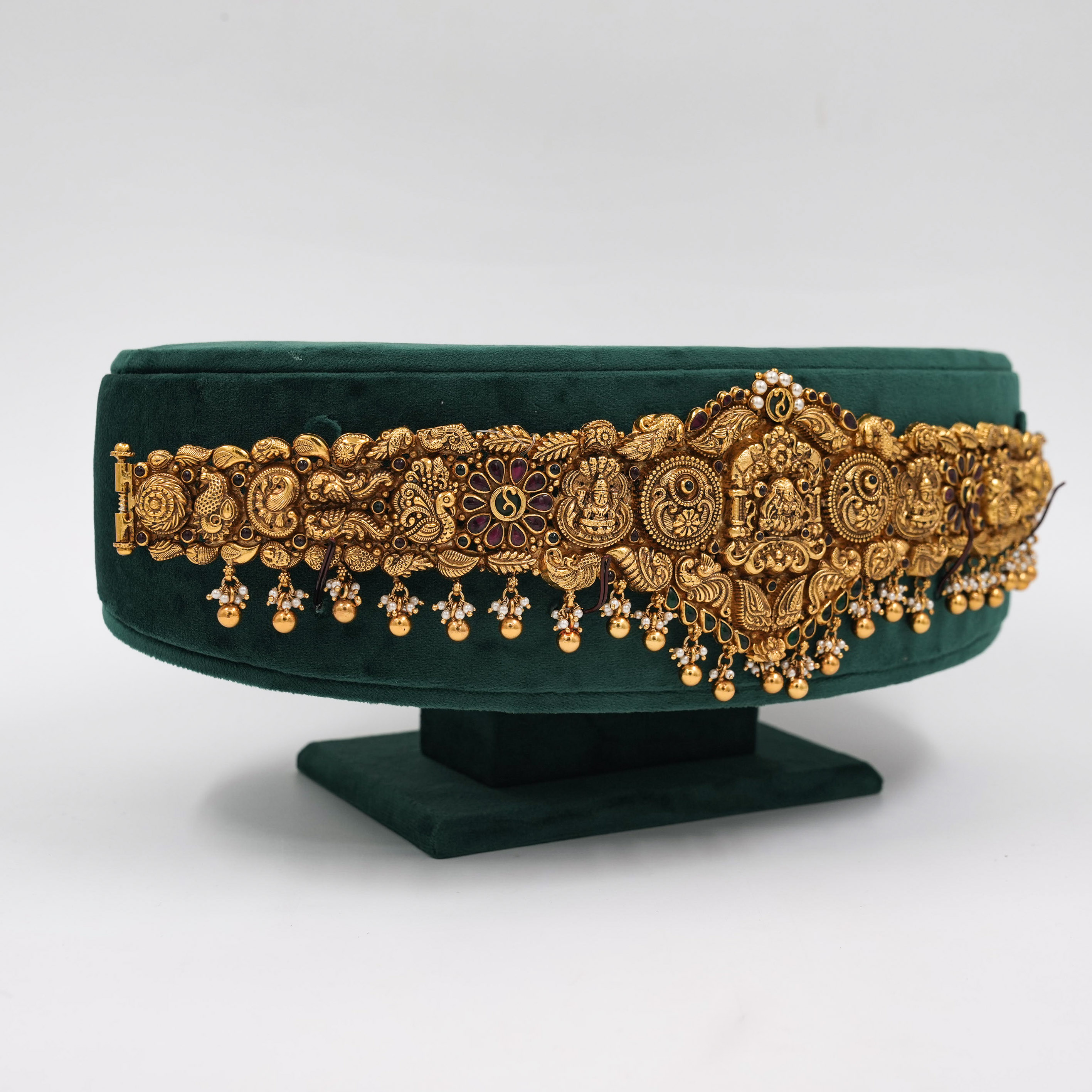 Intricate gold temple belt with ruby accents, perfect for weddings and traditional occasions. Buy gold temple belt from Raag Silver Jewellery in Hyderabad.